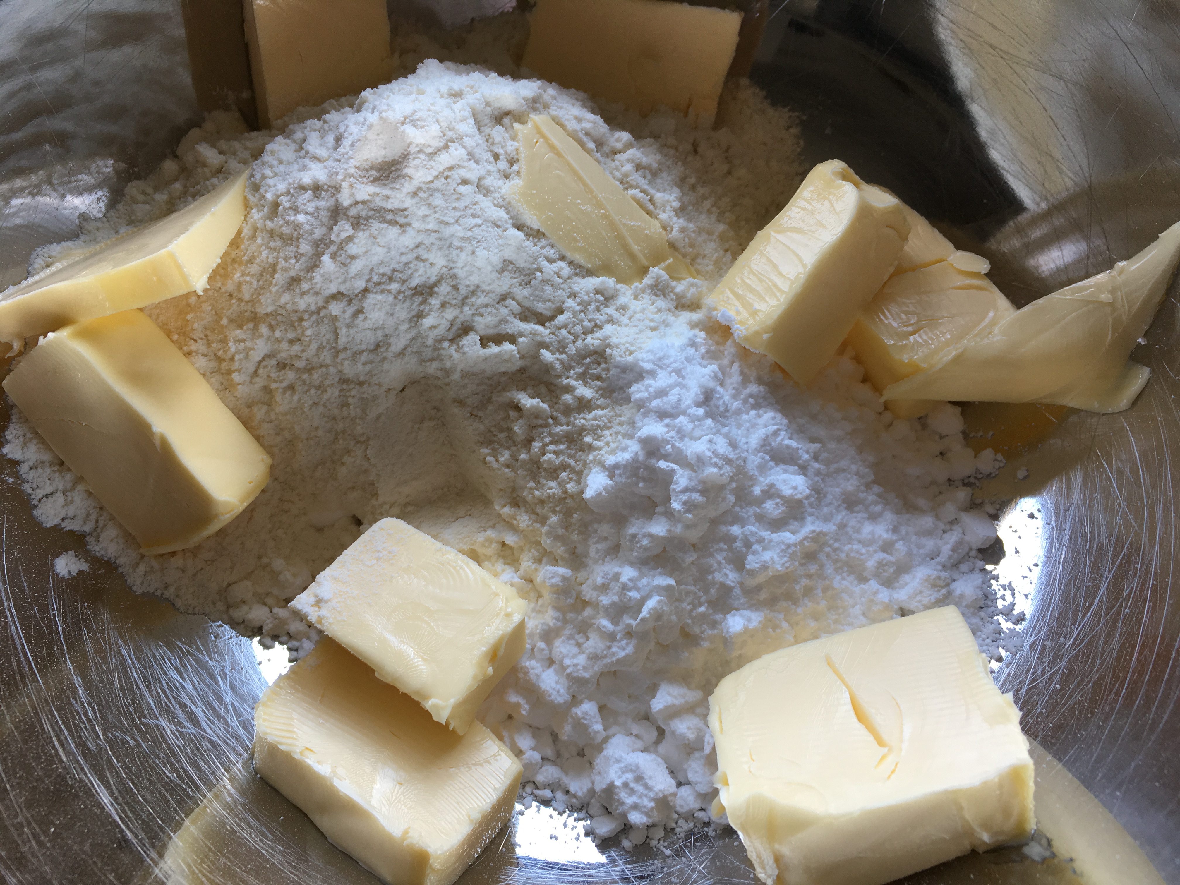 Butter mit Mehl und Puderzucker Butter mit Mehl, Puderzucker und Eiweiß - Bei 180 Grad im vorgeheizten Backofen backe ich die Biscuits, bis die Ränder goldbraun sind.