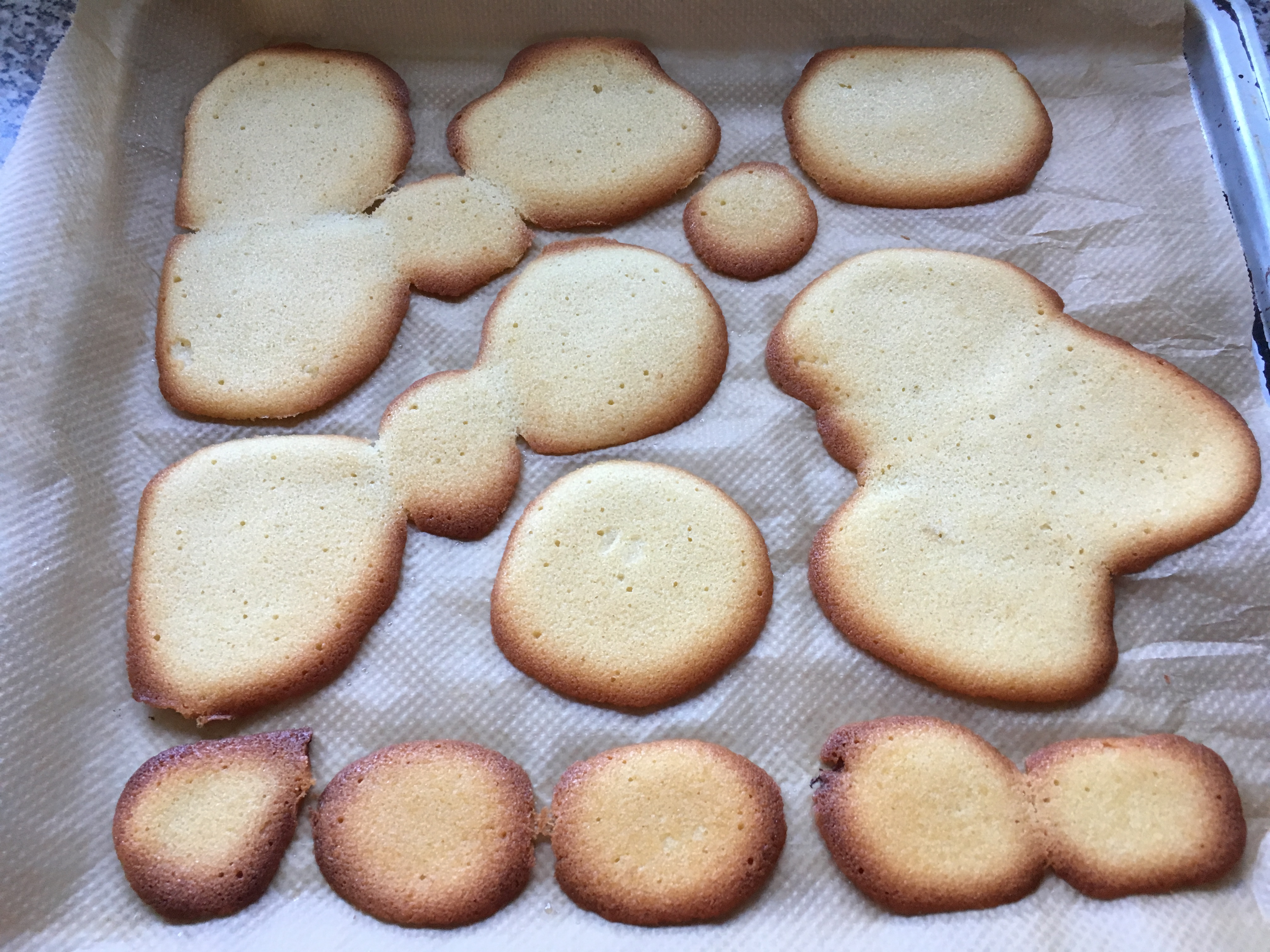 - Ich habe mich hier gefragt, wann genau ich nun die Biscuits aussteche… Da ich die schönen goldbraunen Ränder an jedem Biscuit wollte, habe ich den Teig ca. eine halbe Stunde in den KĂĽhlschrank “zum Fester werden” gestellt um ihn anschlieĂźend mit Hilfe von Ausstechern den Teig in Form zu bringen. Lustigerweise durfte ich dann im Ofen feststellen, dass ich mir das Ganze hätte sparen können – sie zerliefen. Nur die kleinen blieben in einem halbwegs guten Radius. Aber fĂĽr die Zukunft und fĂĽr alle Ăśberlegenden: Streicht den Teig als ganzes dĂĽnn aus und stecht die Formen nach dem Backen aus. 🙂