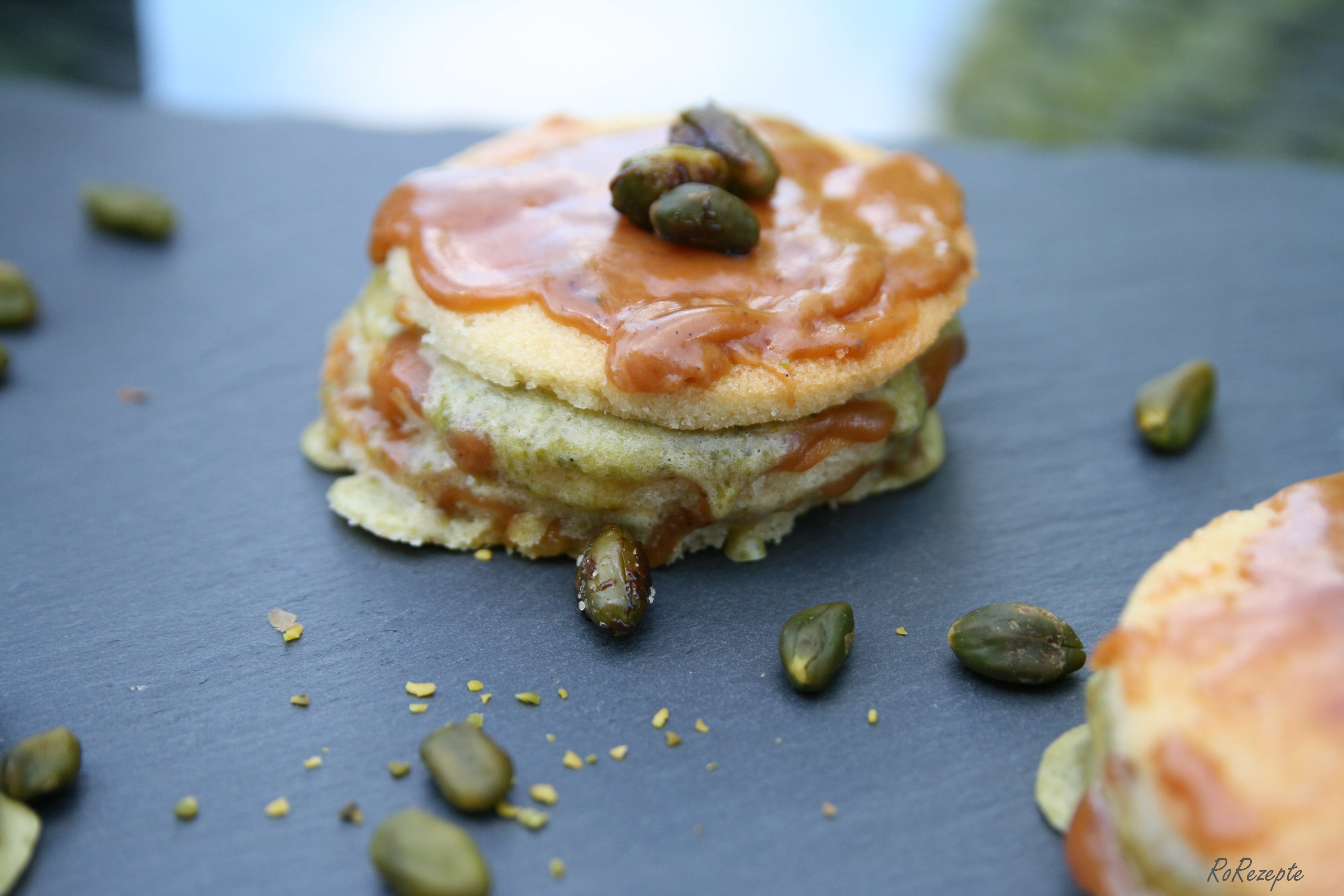 - Dann nehme ich jeweils drei der dĂĽnnen Biscuits und schichte sie abwechselnd mit dem gesalzenen Karamell und dem Pistazienmousse.