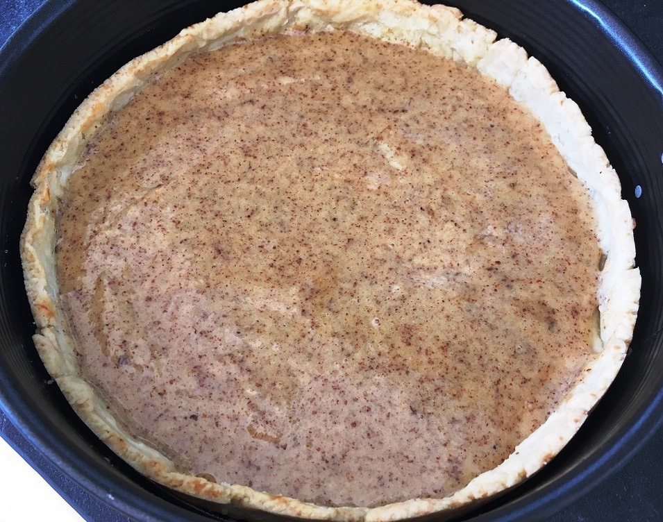 - Wenn der Kuchenboden aus dem Ofen kommt, die Frangipane-Creme sofort darauf verteilen, sodass der noch warme Teig glücklich seufzend ein bisschen davon aufsaugt.