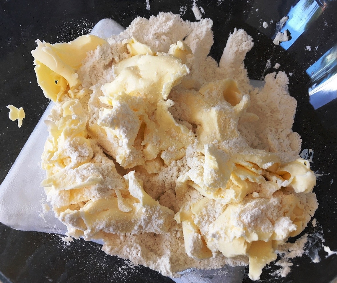 - Mehl, Salz, Zucker und Butter mischen und zu einem krümeligen Teig verarbeiten. Am besten macht man das mit der Küchenmaschine, weil dann alles kälter bleibt.