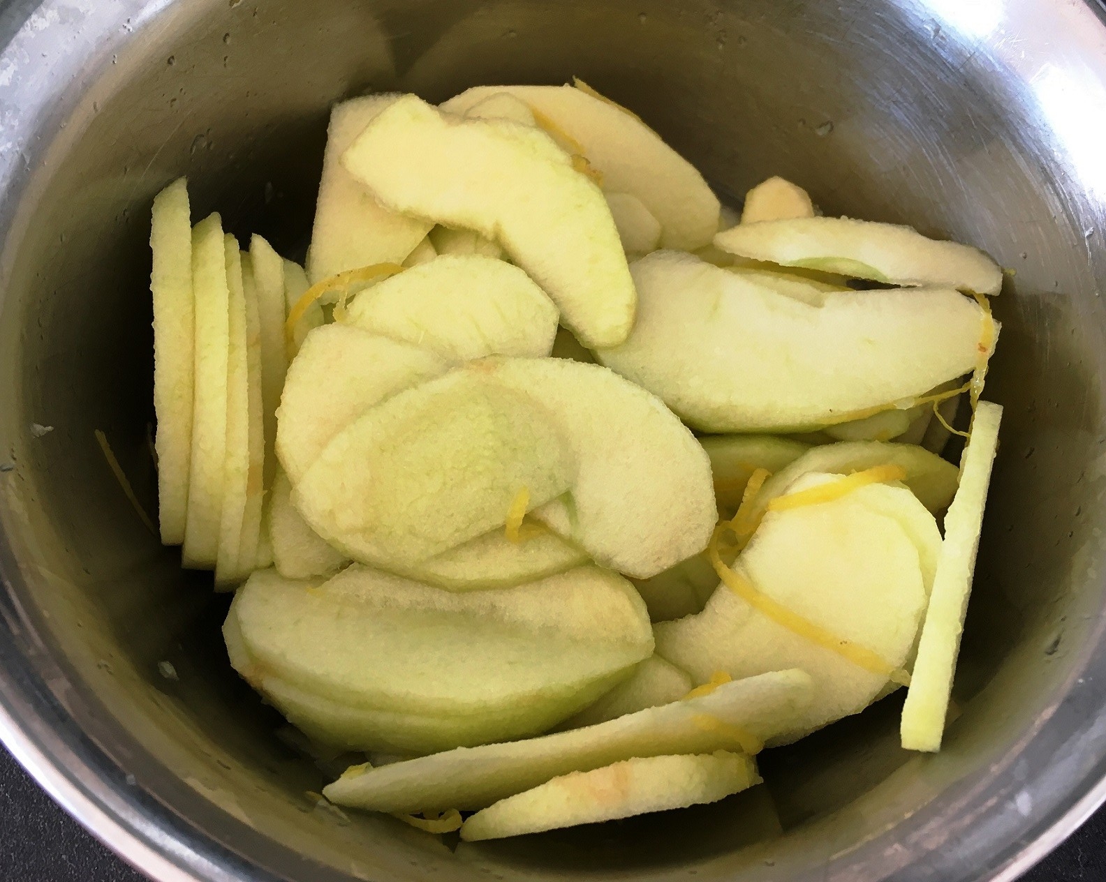 Zitronensaft und Zeste Äpfel schälen, entkernen, schnitzen, mit Zitronensaft mischen - 1 Glas Gelee: Dafür kann man eigentlich jede Sorte nehmen, die einem schmeckt, wobei ich am liebsten Stachelbeere mag. Das gute alte Johannisbeergelee aus dem Laden tut es aber auch.
