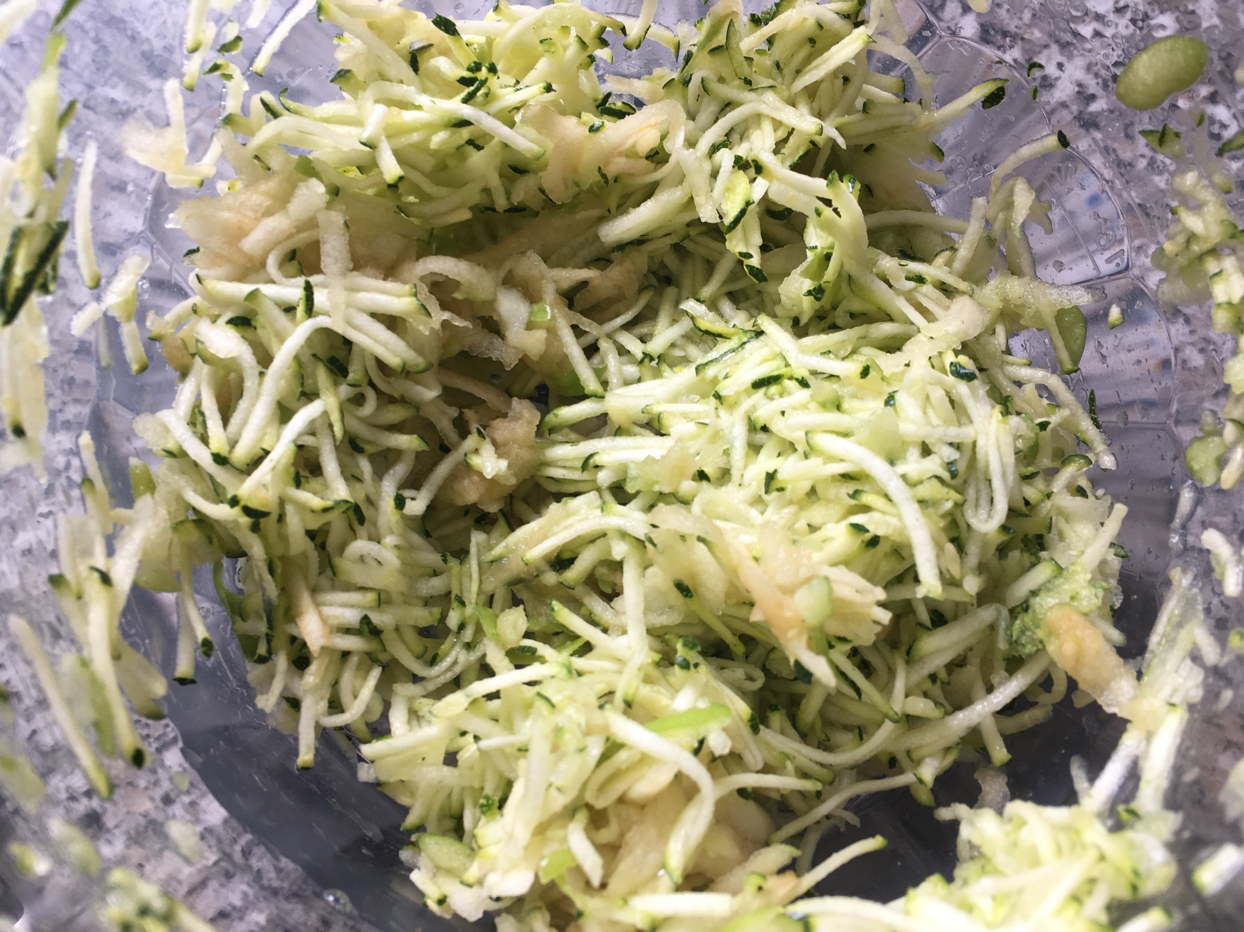 Apfel, Zucchini raspeln - Das Mehl mit Backpulver und Natron mischen.