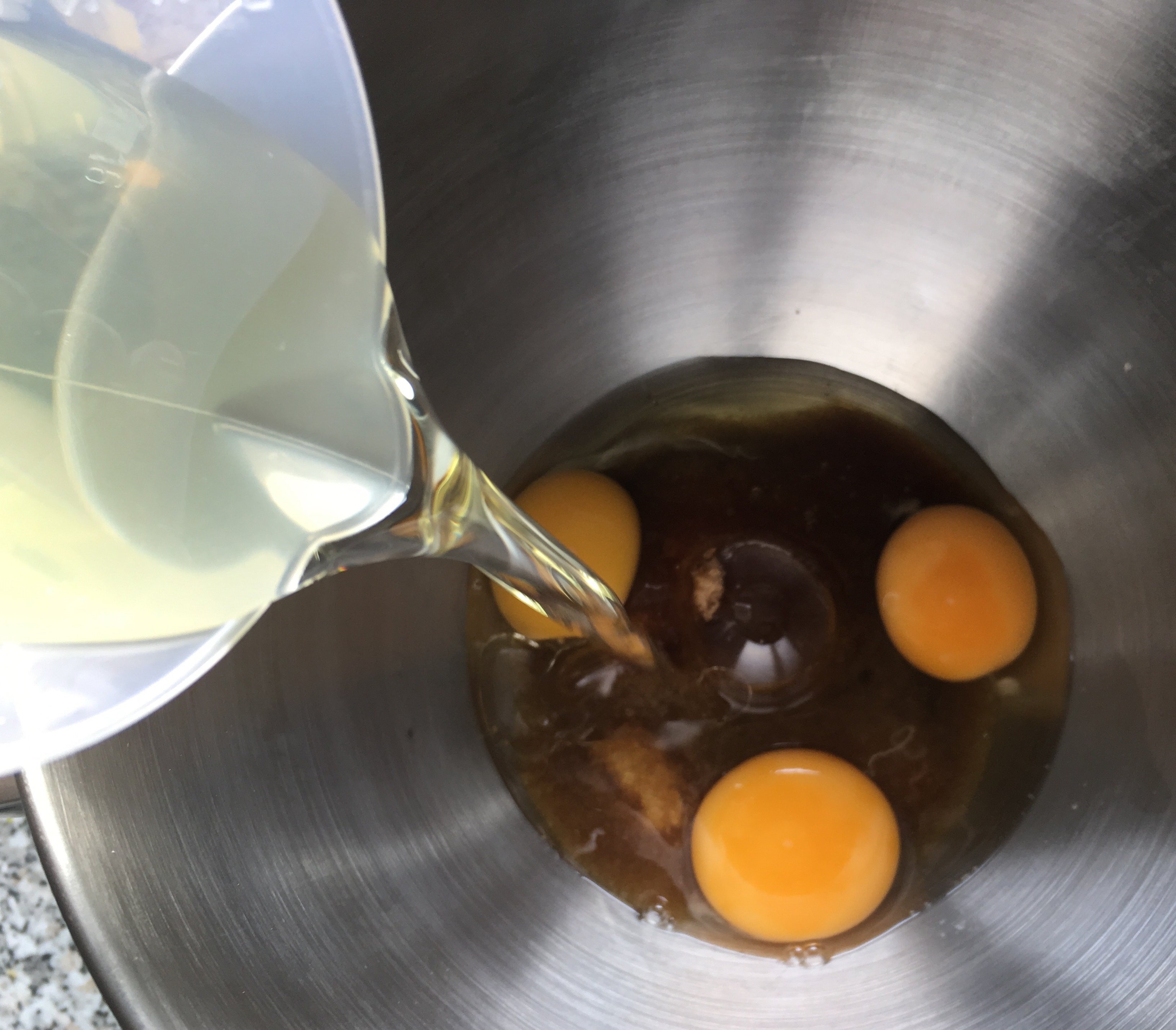 Eier, Zucker, Öl aufgeschlagen - Mit einem Holzkochlöffel mit Loch die restlichen Zutaten vorsichtig unterrühren. Die Zutaten müssen nicht komplett vermischt sein, der Teig darf ruhig etwas »klumpig« aussehen.