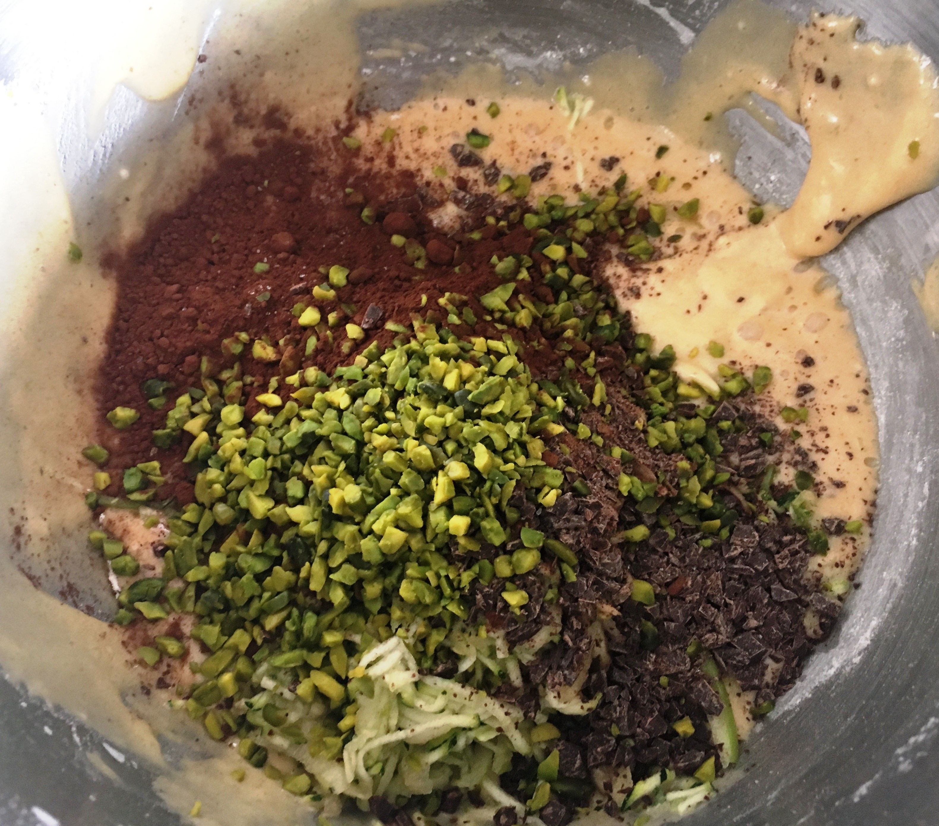 Mehl, Backpulver, Natron vermengen und zufügen Kakao, gehackte Pistazien, Apfel-Zucchini-Raspeln zufügen leicht vermengen - Den Teig in die Weck-Gläser füllen, dabei darauf achten, dass sie nicht mehr als 2/3 gefüllt sind. Die Gläser auf ein Backblech stellen, die Glasdeckel der Gläser mit aufs Blech legen und 25-30 Minuten im vorgeheizten Backofen backen. 25 Minuten reichen. Die Hitze der Gläser garantiert ein nachbacken.