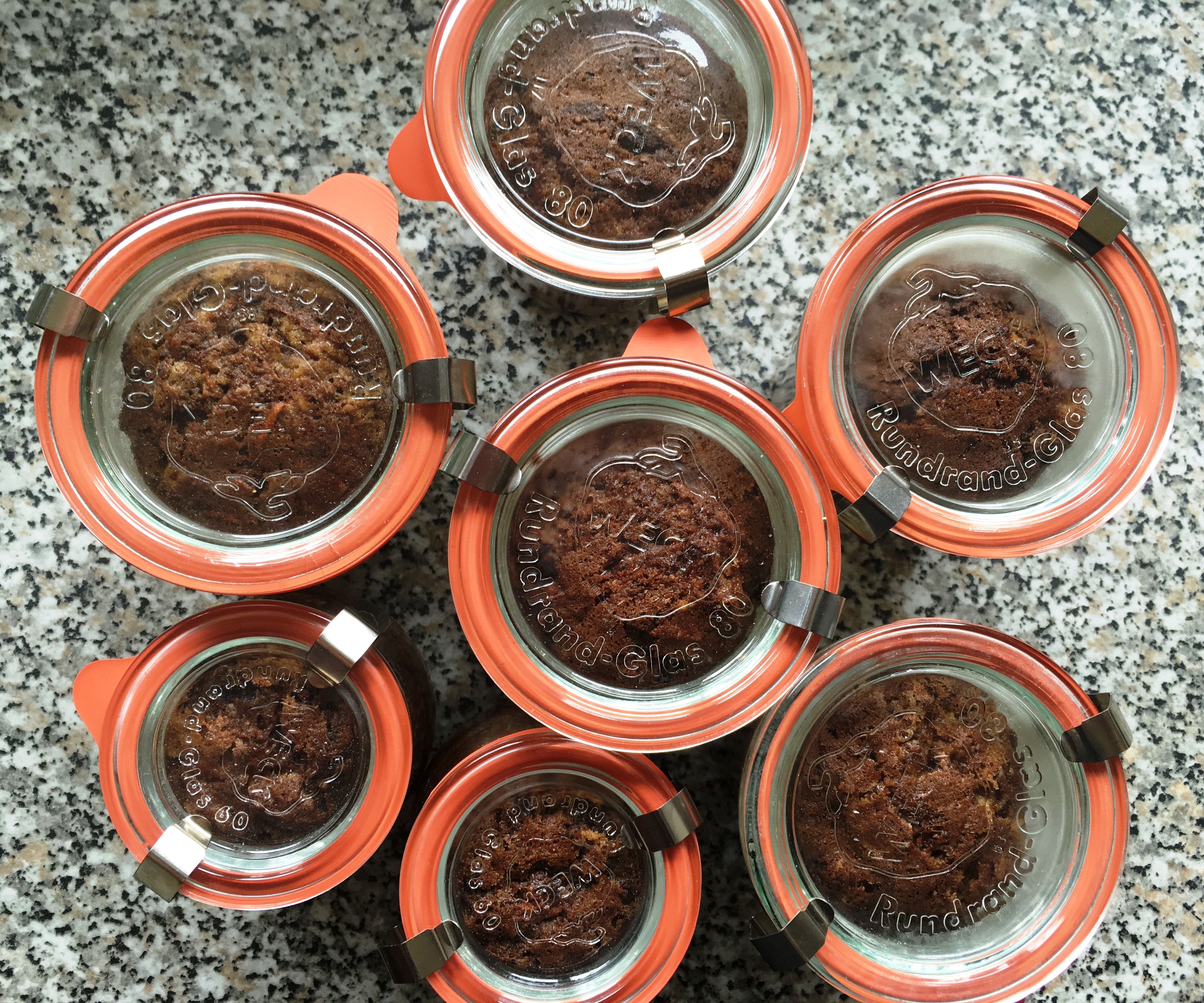 Gläser befüllen, backen - Die Gläser mit einem Backhandschuh aus dem Ofen holen (Achtung: sehr heiß!!) und auf ein Holzbrett stellen. Die Gummiringe aus dem heißen Wasser holen, mit Küchenpapier abtupfen und vorsichtig auf den Rand der Gläser legen. Diese sofort mit den heißen Deckeln verschließen. Kühl und lichtgeschützt sind die Kuchen so bis zu 3 Monate haltbar.