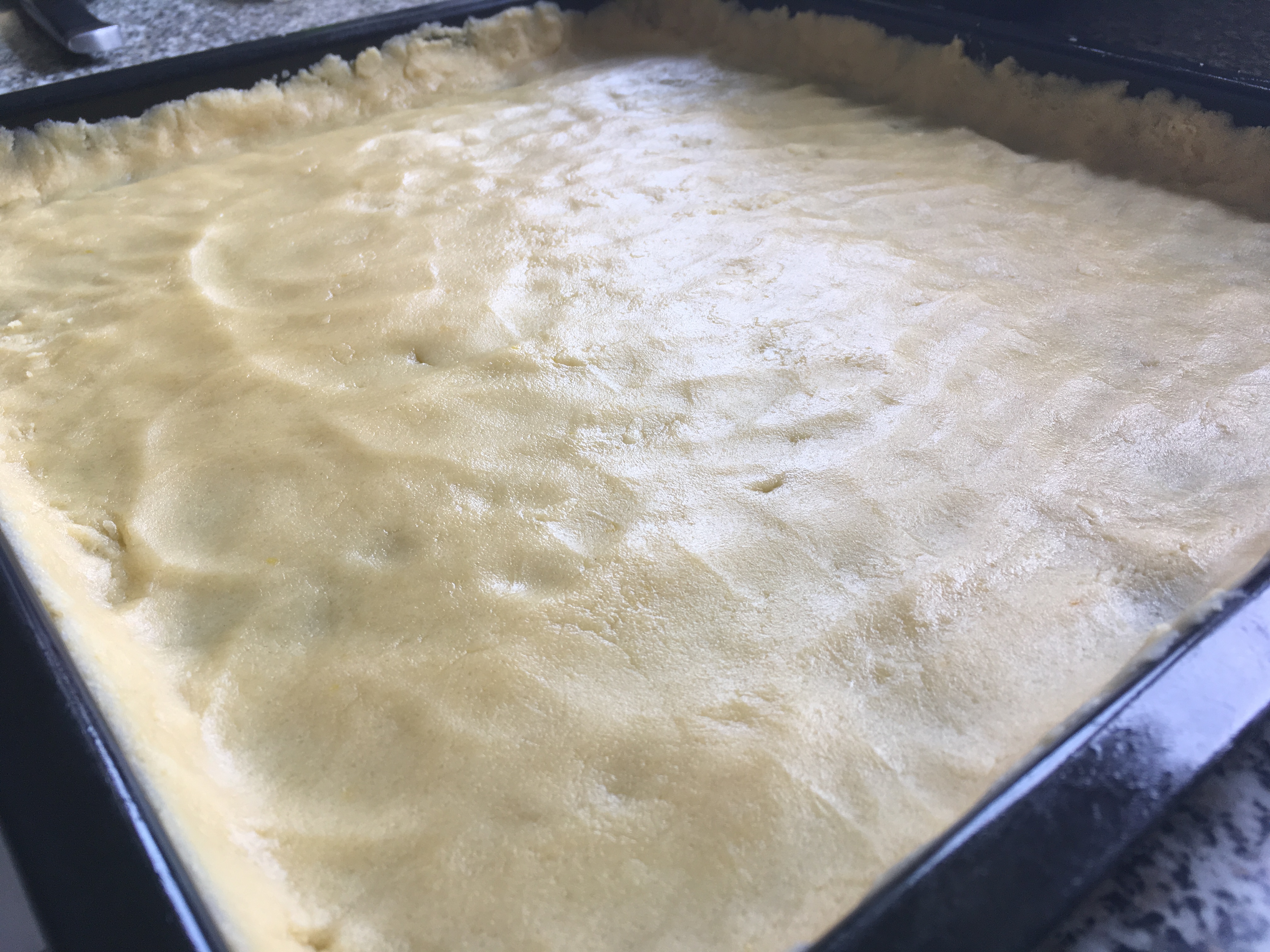 - Einen Streuselteig herstellen und auf einem gefetteten Backblech (Meins: 39,5cm x 36,5cm x 3cm) fest andrücken, dabei den Rand hochformen.