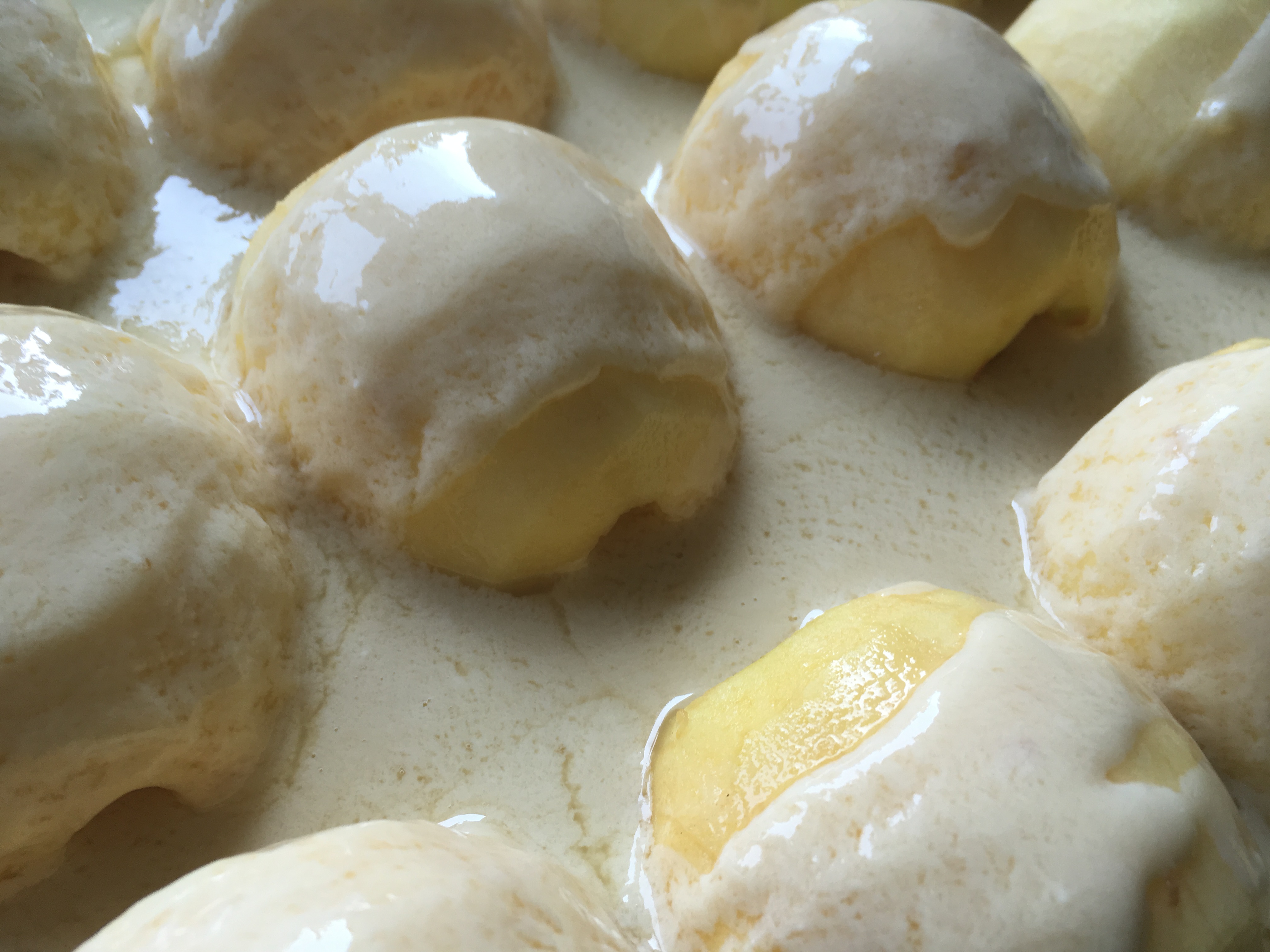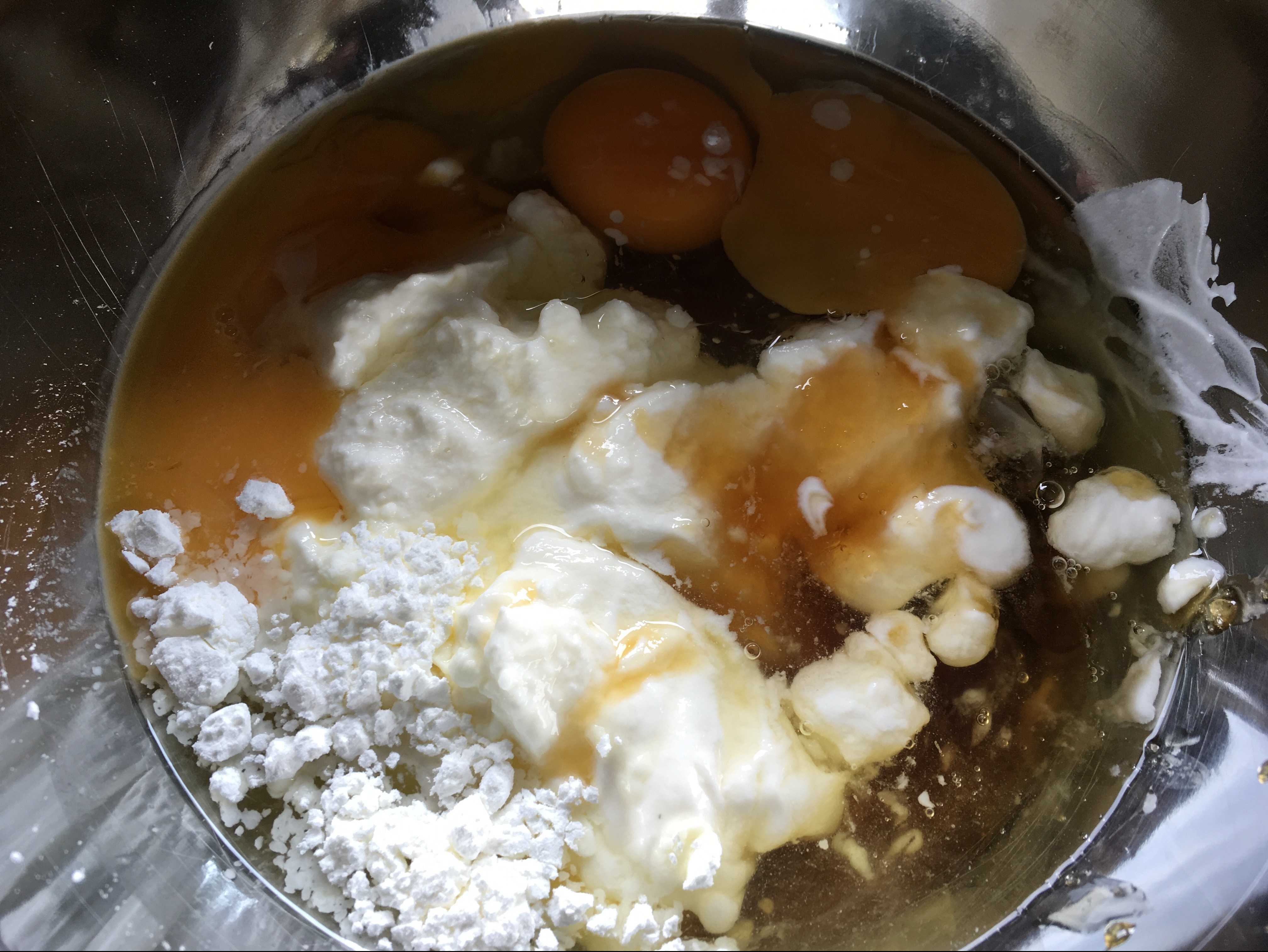 Backblech mit Teig - Eier mit Honig, saurer Sahne und der Speisestärke für den Guss verquirlen.