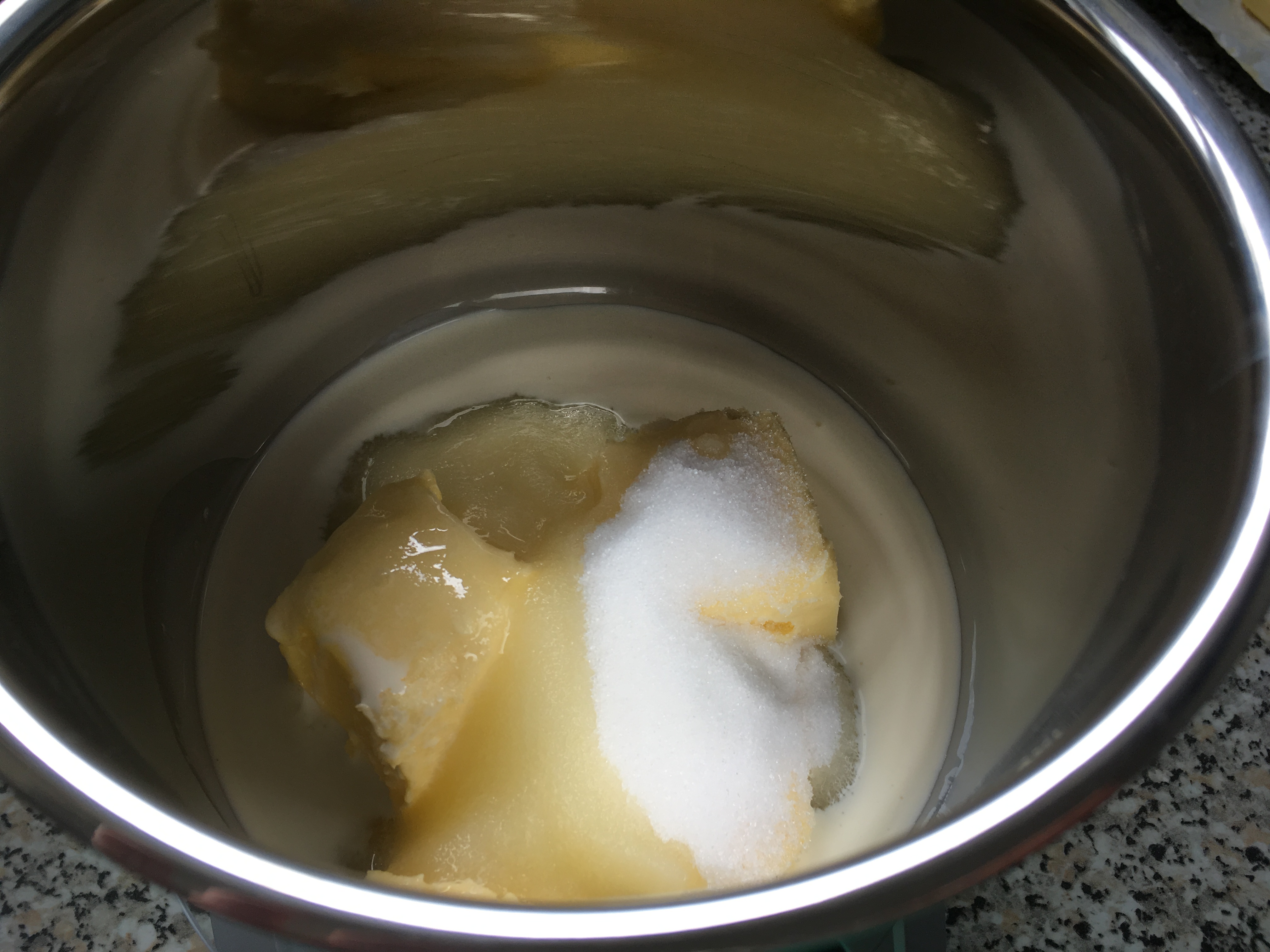 Guss ansetzen Guss - Für die Mandelcreme Butter, Zucker und Sahne aufkochen.