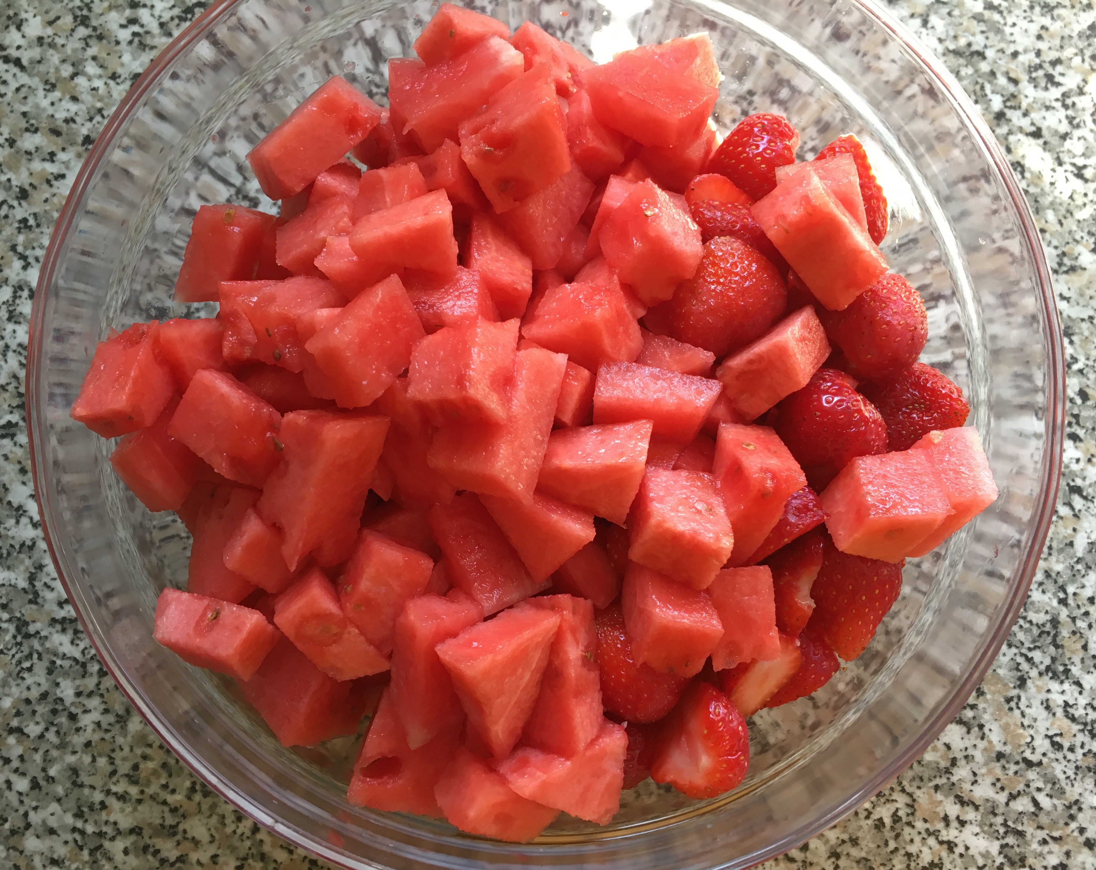 - Himbeeren und Erdbeeren halbieren/vierteln, Melone in kleine Würfel schneiden.