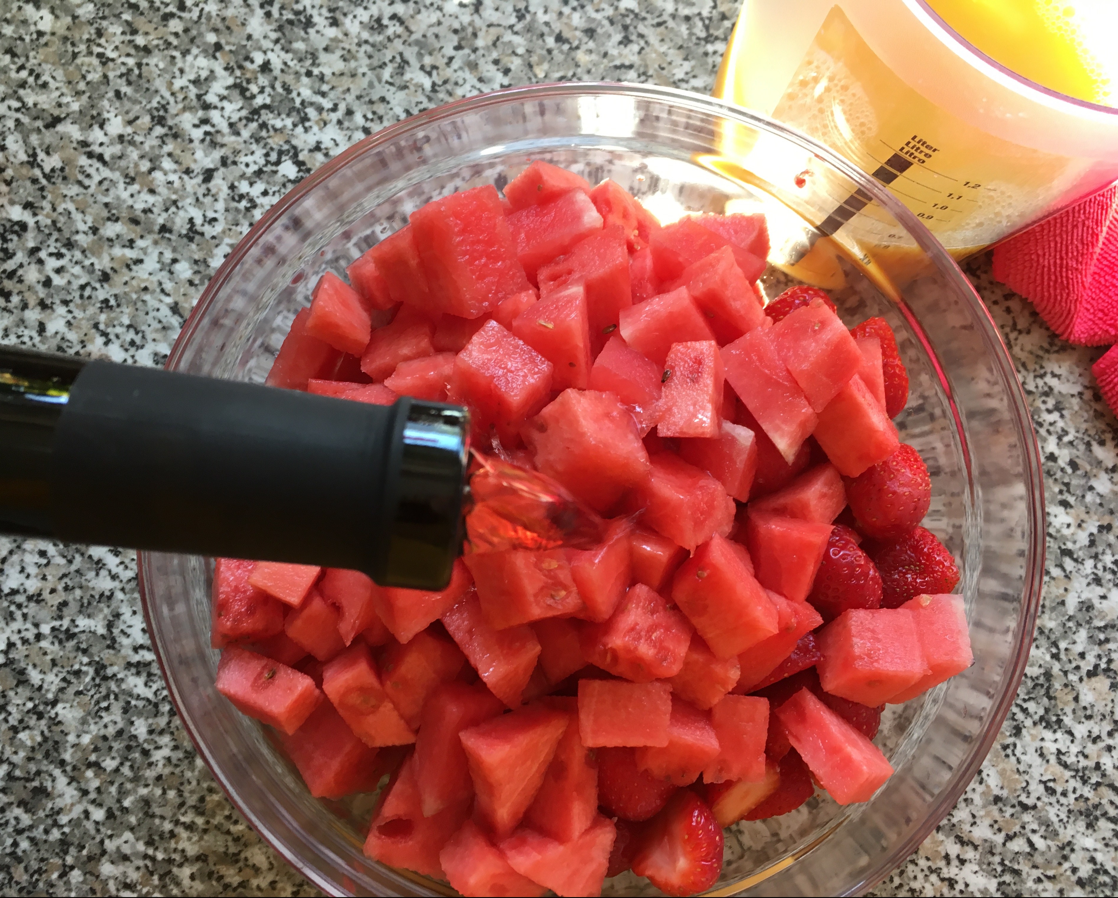Obst würfeln - Die Früchte ungefähr drei Stunden in einer Rotwein-Orangensaft-Mischung im Kühlschrank ziehen lassen.