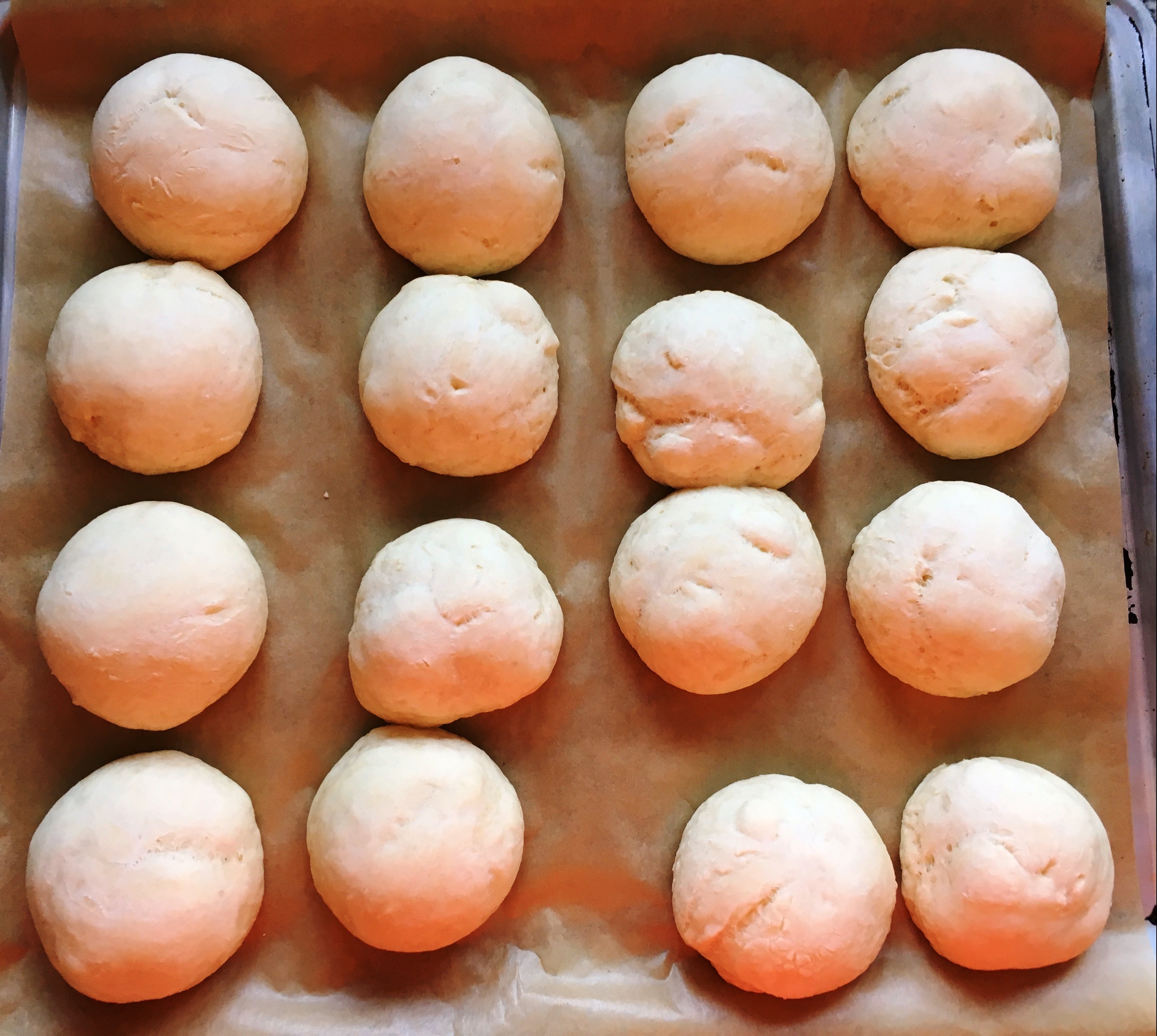 Teig gehen lassen gegangen - Danach den Teig in 16 Portionen teilen (á 46/47g) und diese zu Kugeln rollen. Die Kugeln auf ein Backblech legen (da sie noch etwas wachsen, sollte man dazwischen genügen Platz lassen). Dann noch einmal eine Dreiviertelstunde gehen lassen.