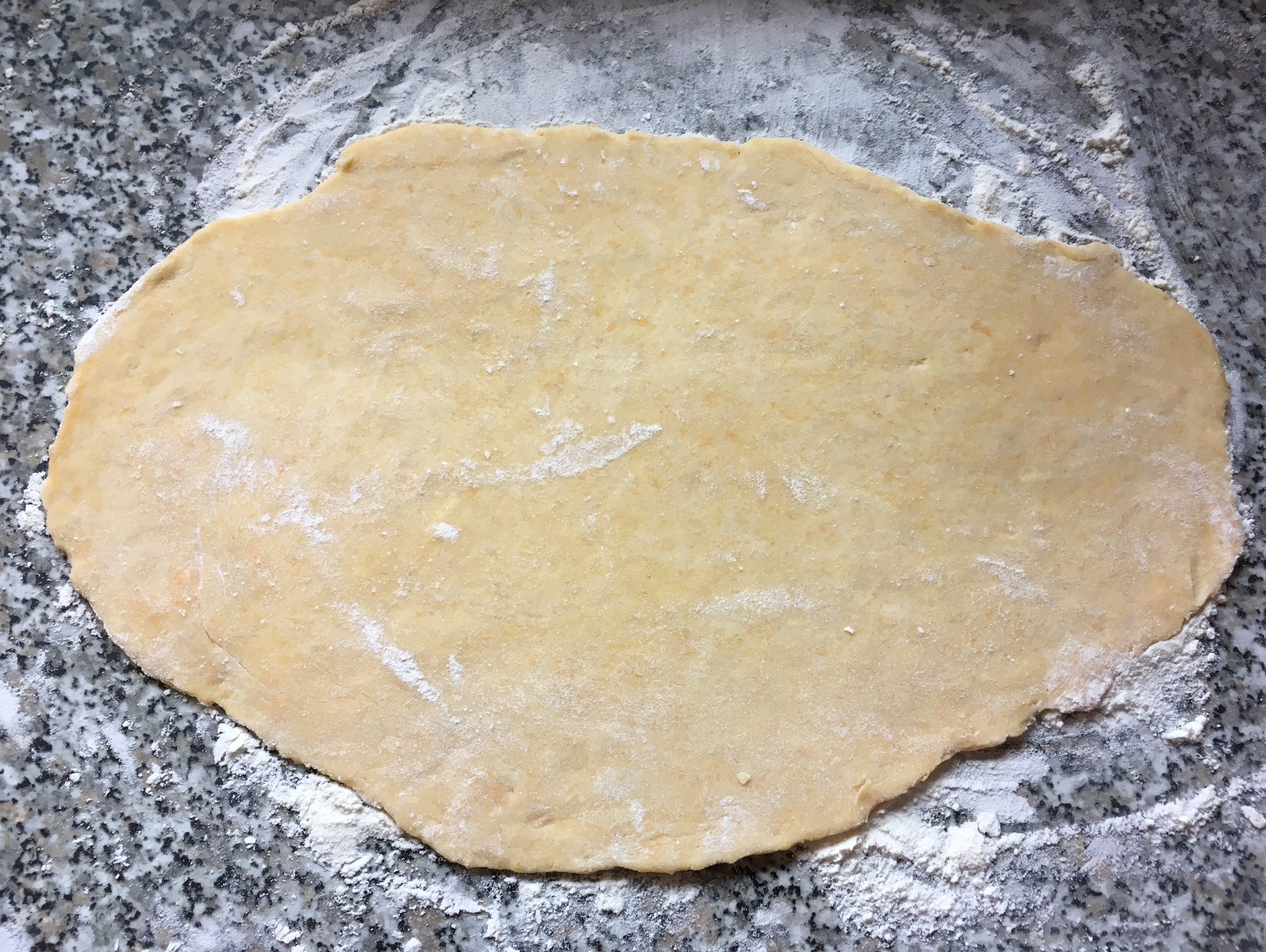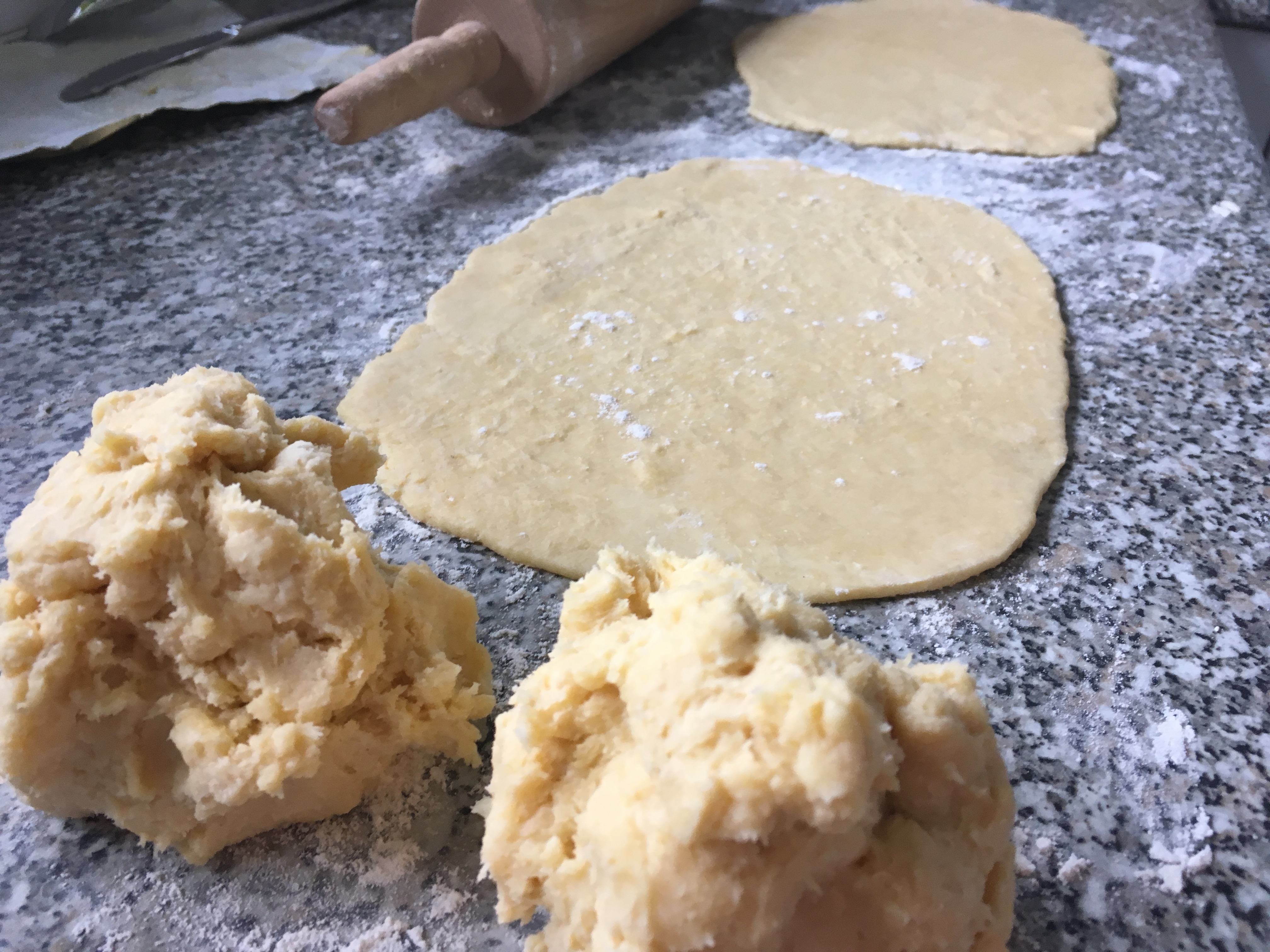 - Alle Zutaten für den Teig rasch verkneten, in 4 Teile teilen und dünn zu Rechtecken ausrollen. Kurz in den Kühlschrank geben, während ihr Punkt 2 erarbeitet.
