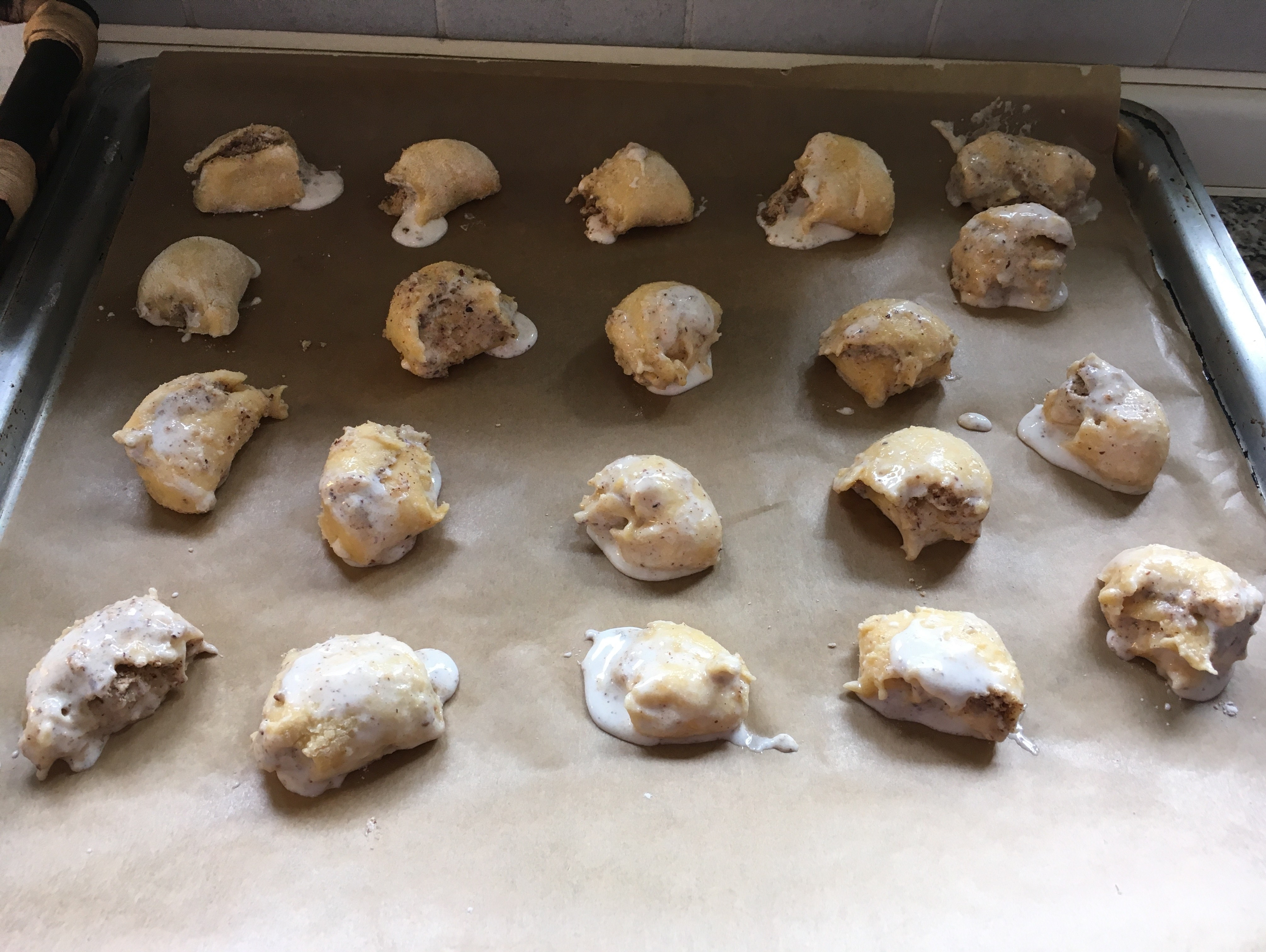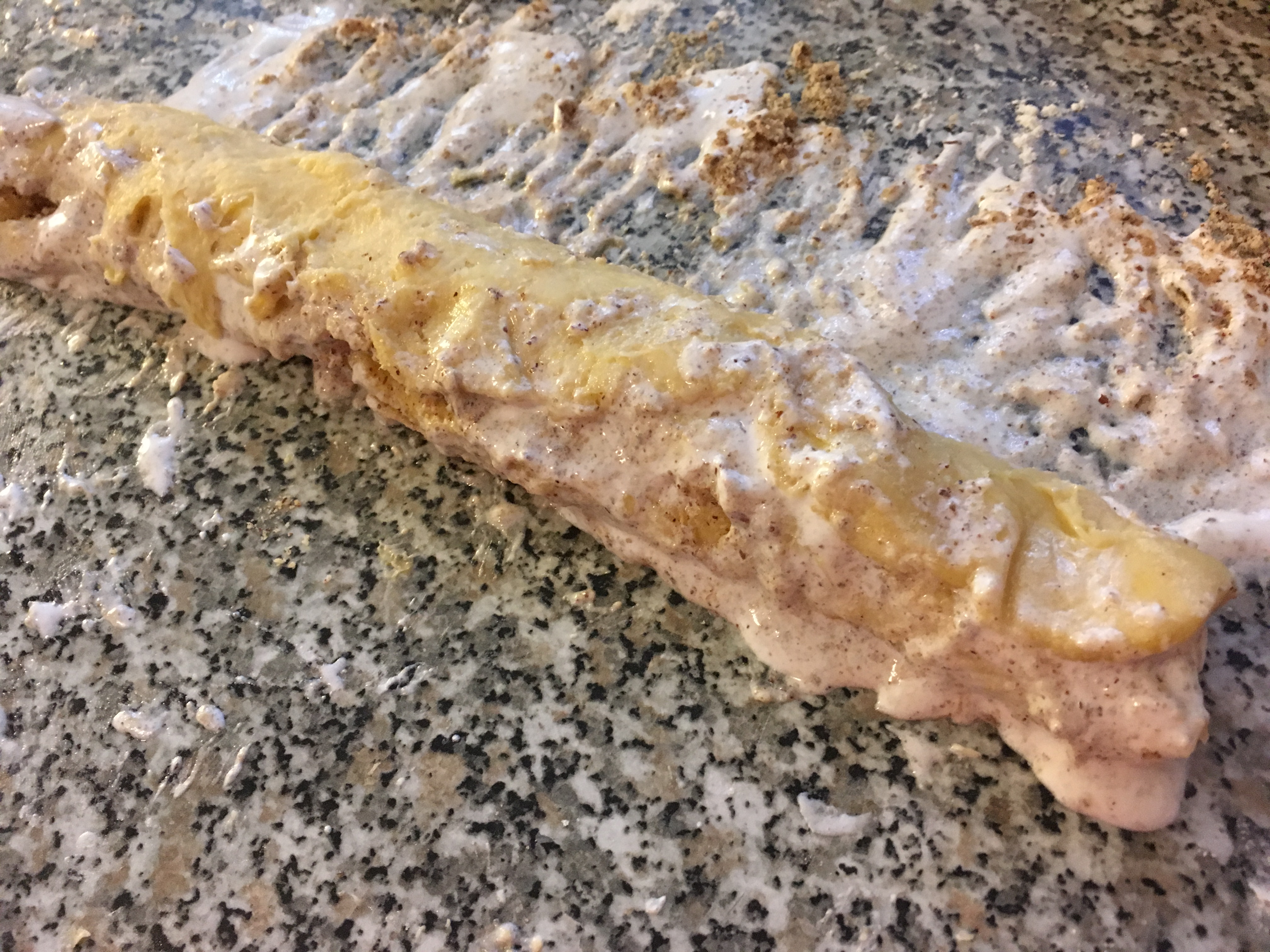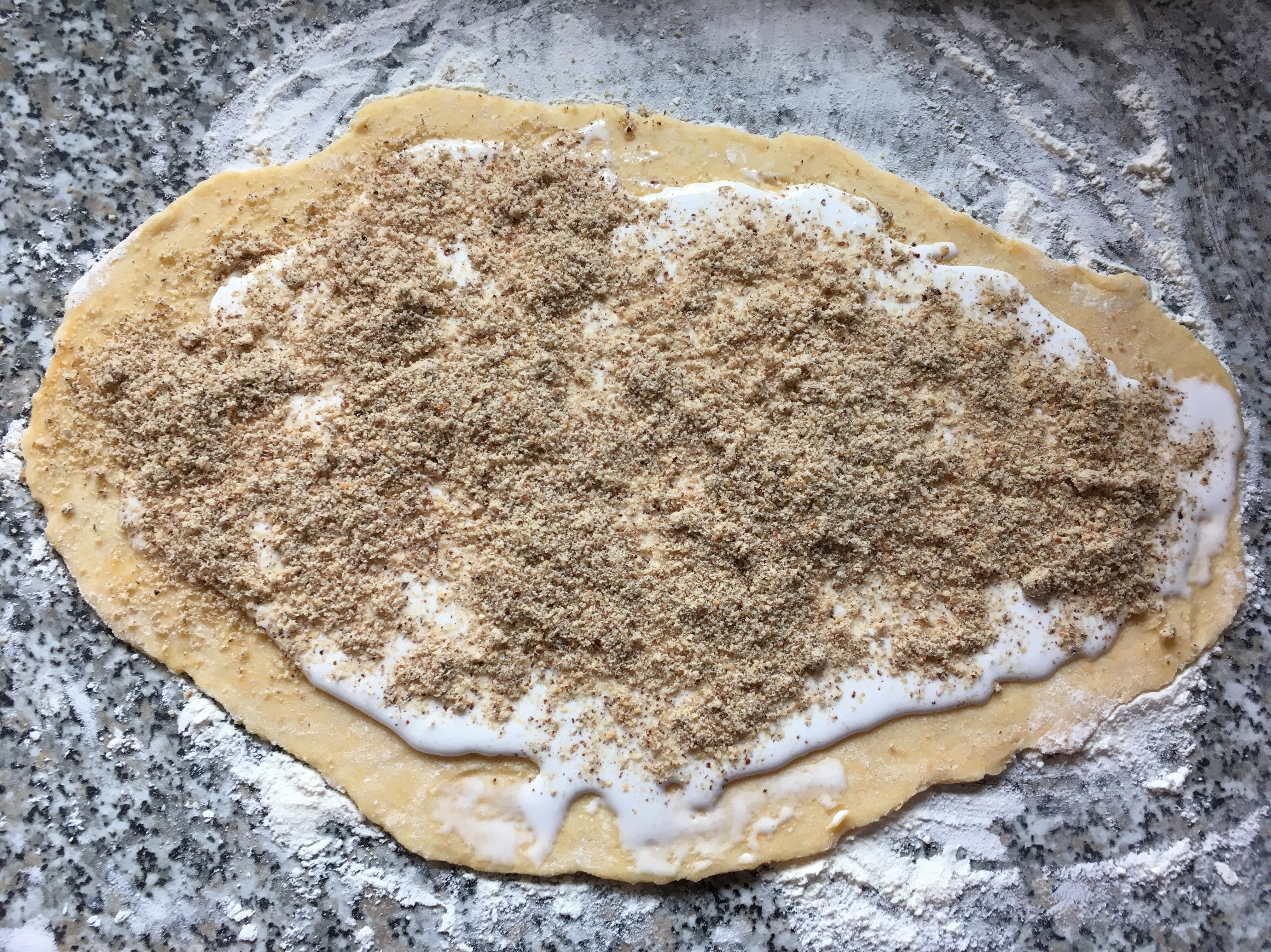 Eiklar und Staubzucker Zuckercreme - und auf die ausgerollten Teigstücke streichen. Die geriebenen Nüsse darüberstreuen und den Teig dünn einrollen wie einen Strudel. Hier schnell mit den gekühlten Elementen arbeiten.