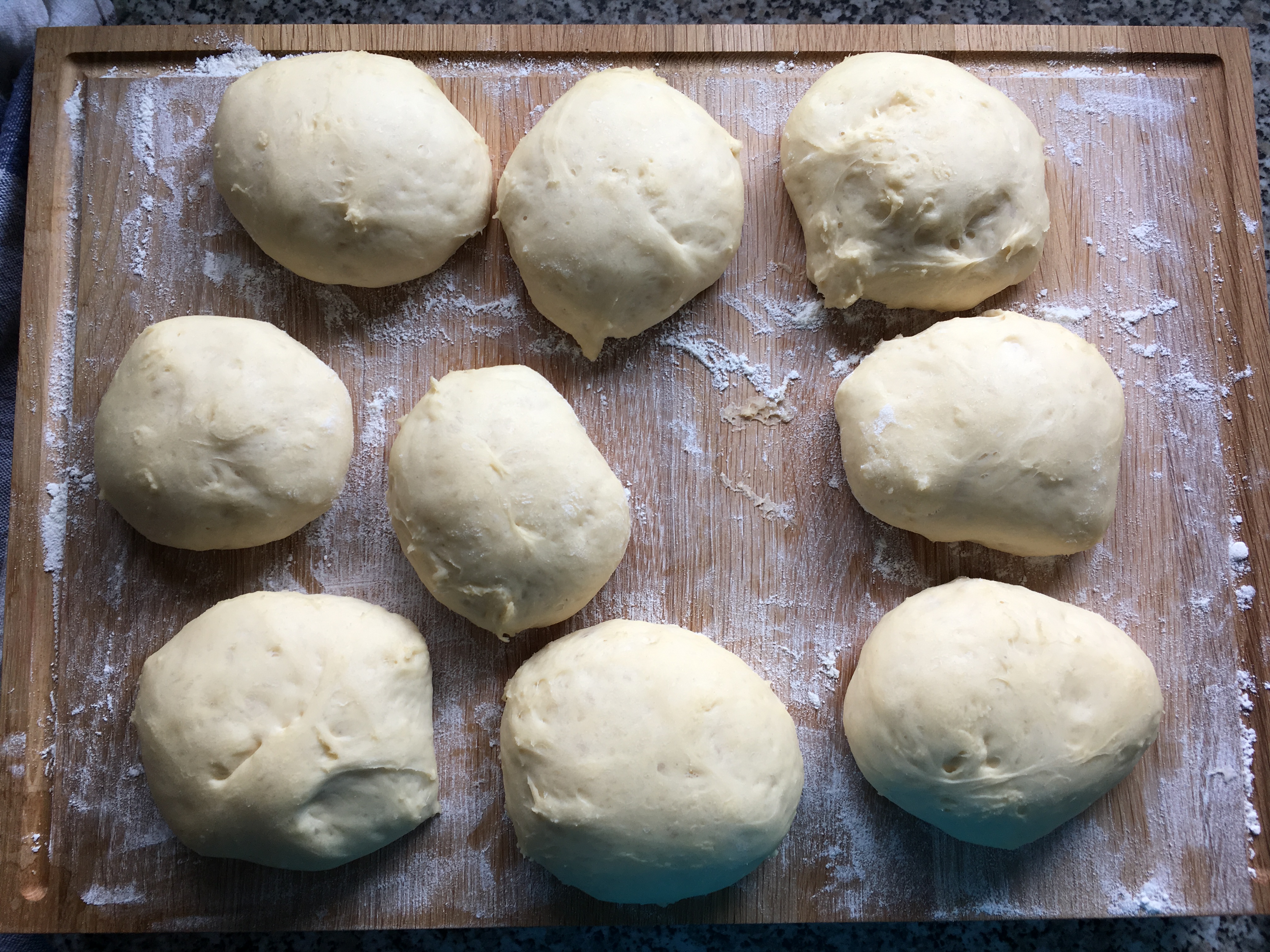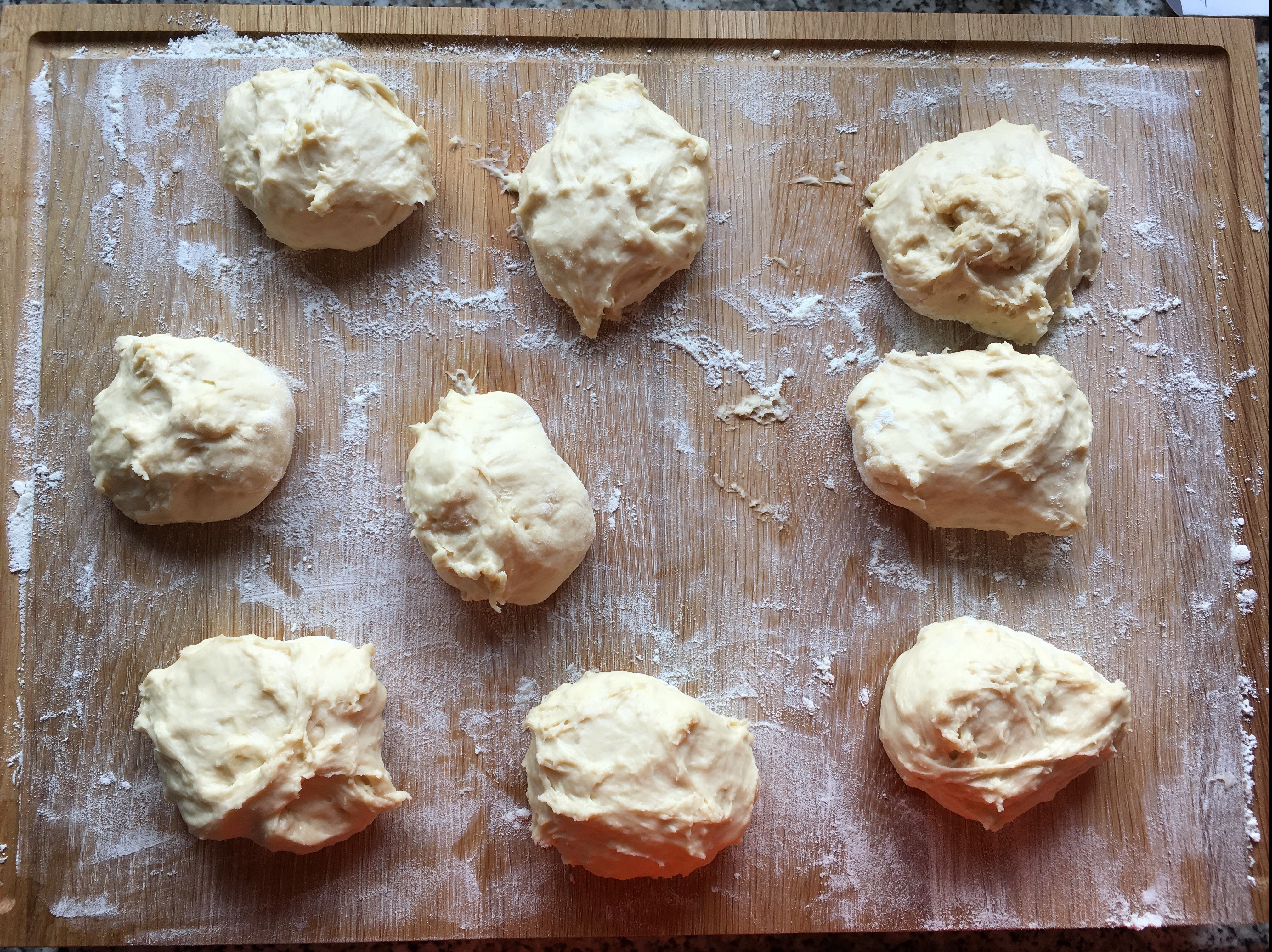 6. Danach sticht man walnussgroße Stücke mit einem Blechlöffel heraus, formt sie mit den Händen etwas rund und lässt sie auf dem mit Mehl bestäubten Nudelbrett wieder mit einem gewärmten Tuche zugedeckt nochmals eine Stunde gehen.