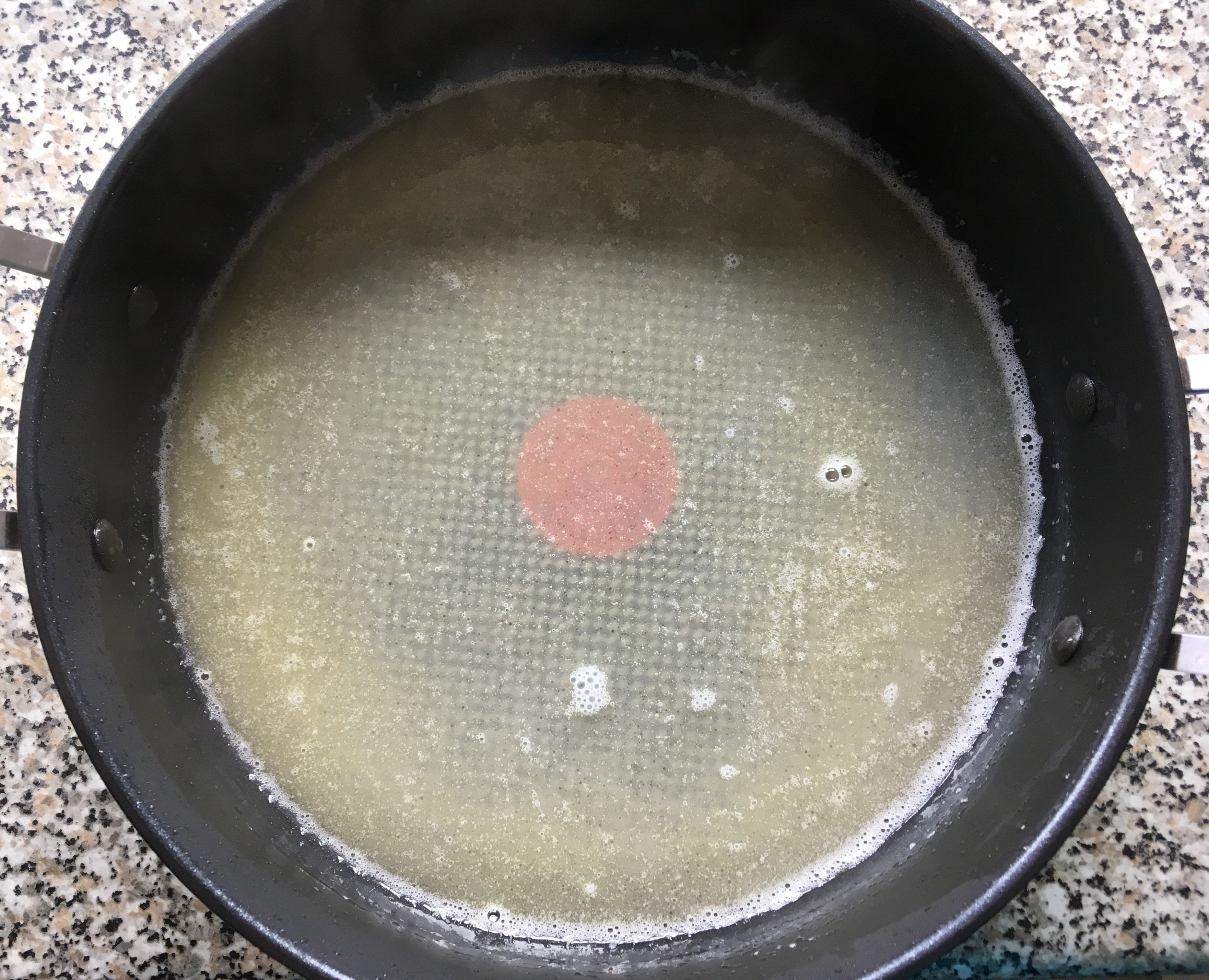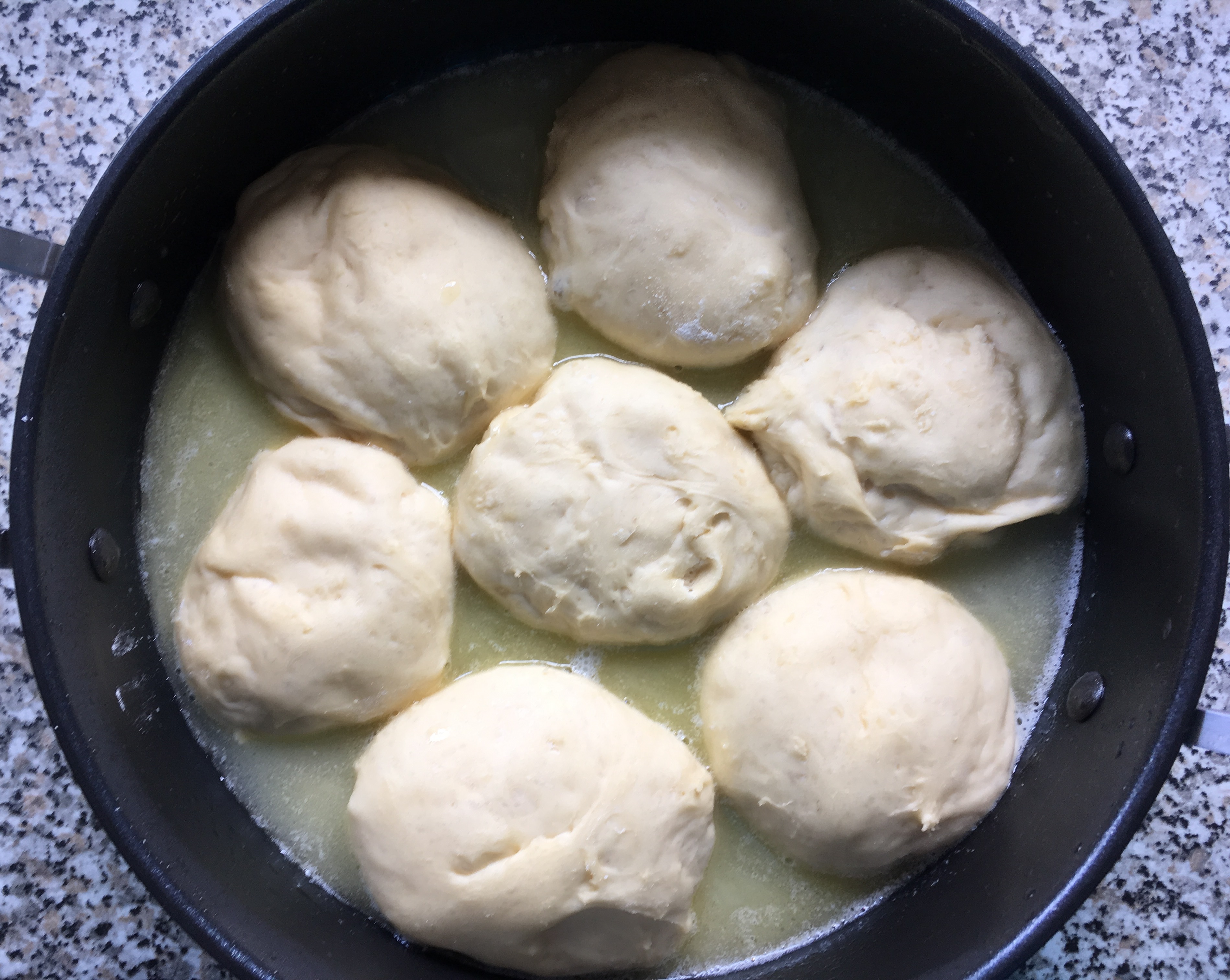7. Sodann lässt man in einem weiten Tiegel ein großes Stück Butter, so viel Wasser, dass der Boden leicht bedeckt ist, und etwas Zucker kochen, gibt die Dampfnudeln hinein, deckt sie fest mit dem passenden zu und windet ein feuchtes Tuch um den Deckel, damit ja kein Dampf herauskommt.
