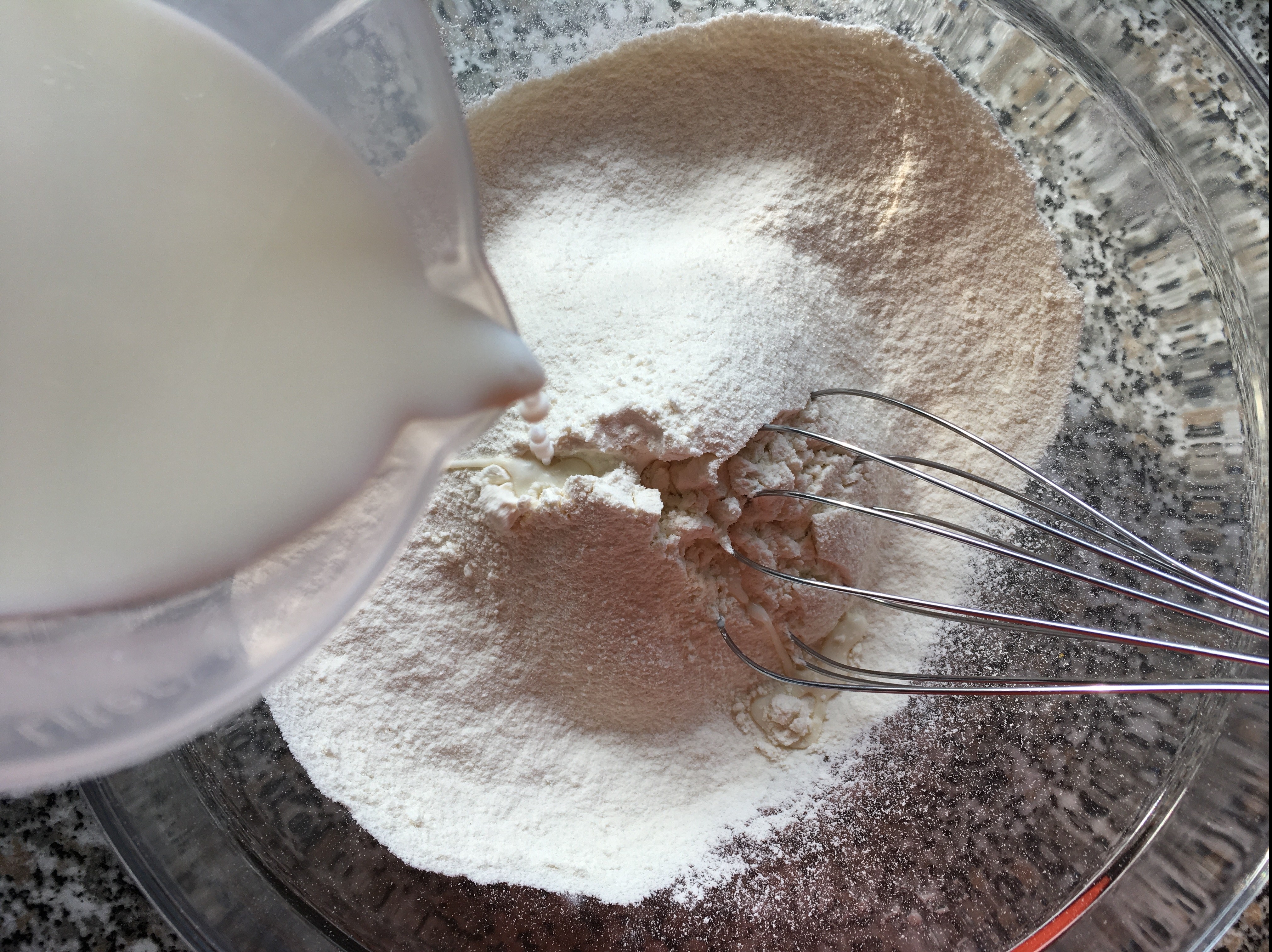 2. Dann gibt man in eine warme Schüssel 250 Gramm gesiebtes Mehl, versprudelt 1/8 Liter lauwarmer Milch,