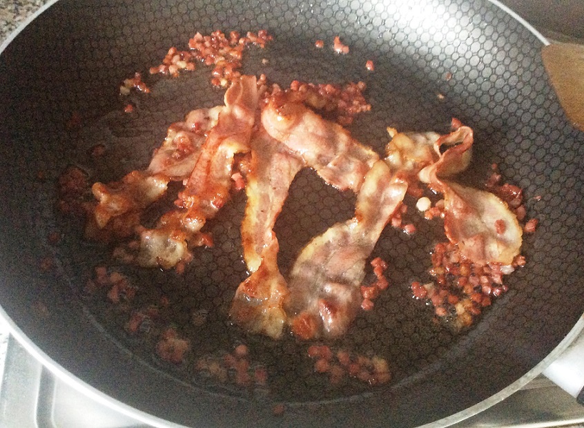 - 125 – 150 g Schinkenspeck oder Bacon gemischt, ca. 88g Bacon und 50g Schinkenwürfel