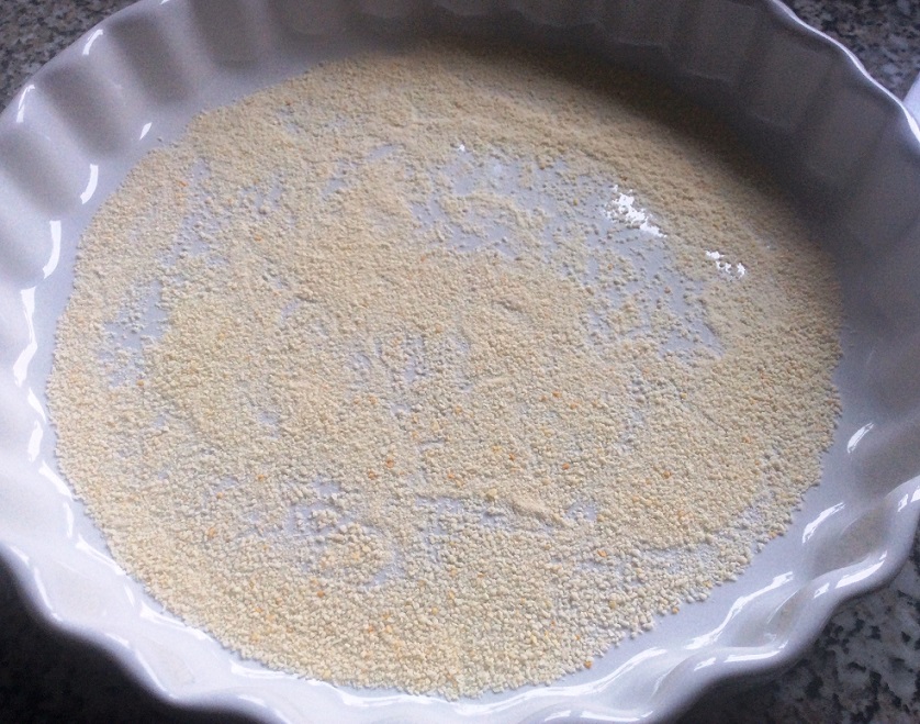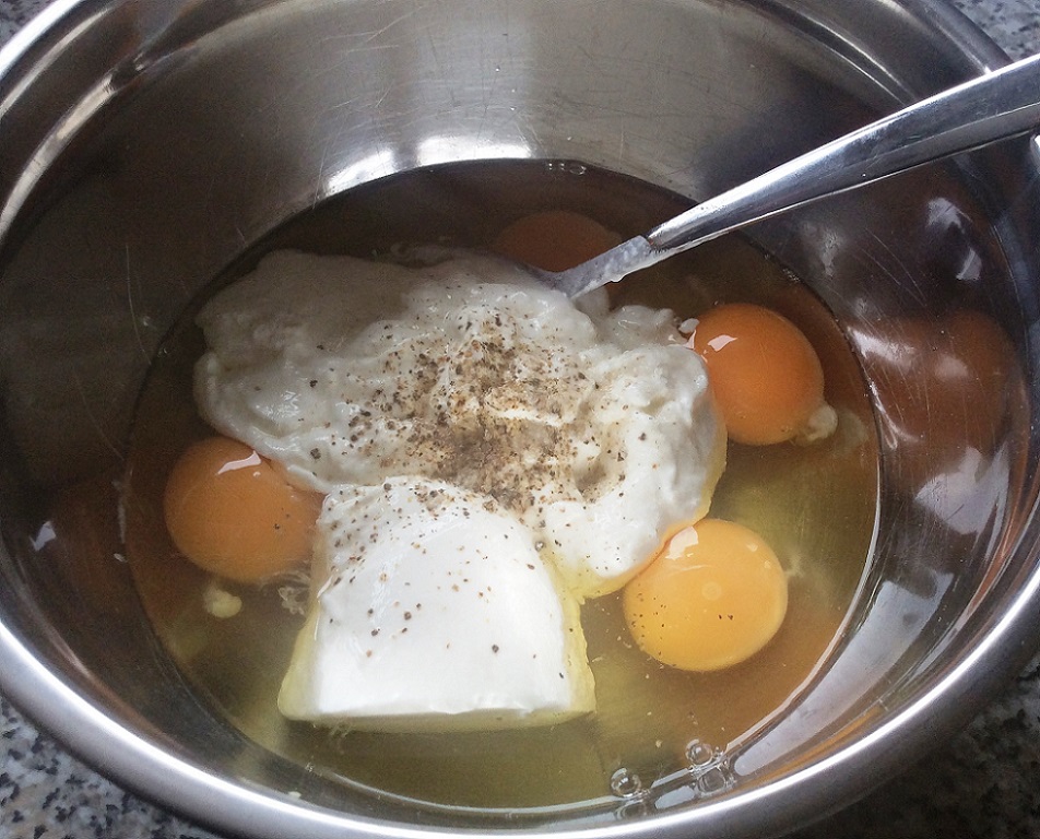 Lauch-Apfel-Schinken-Füllung zugeben - Ei und Schmand oder saure Sahne verquirlen. Mit Salz und Pfeffer würzen und in die Form gießen. Ich habe saure Sahne genommen.