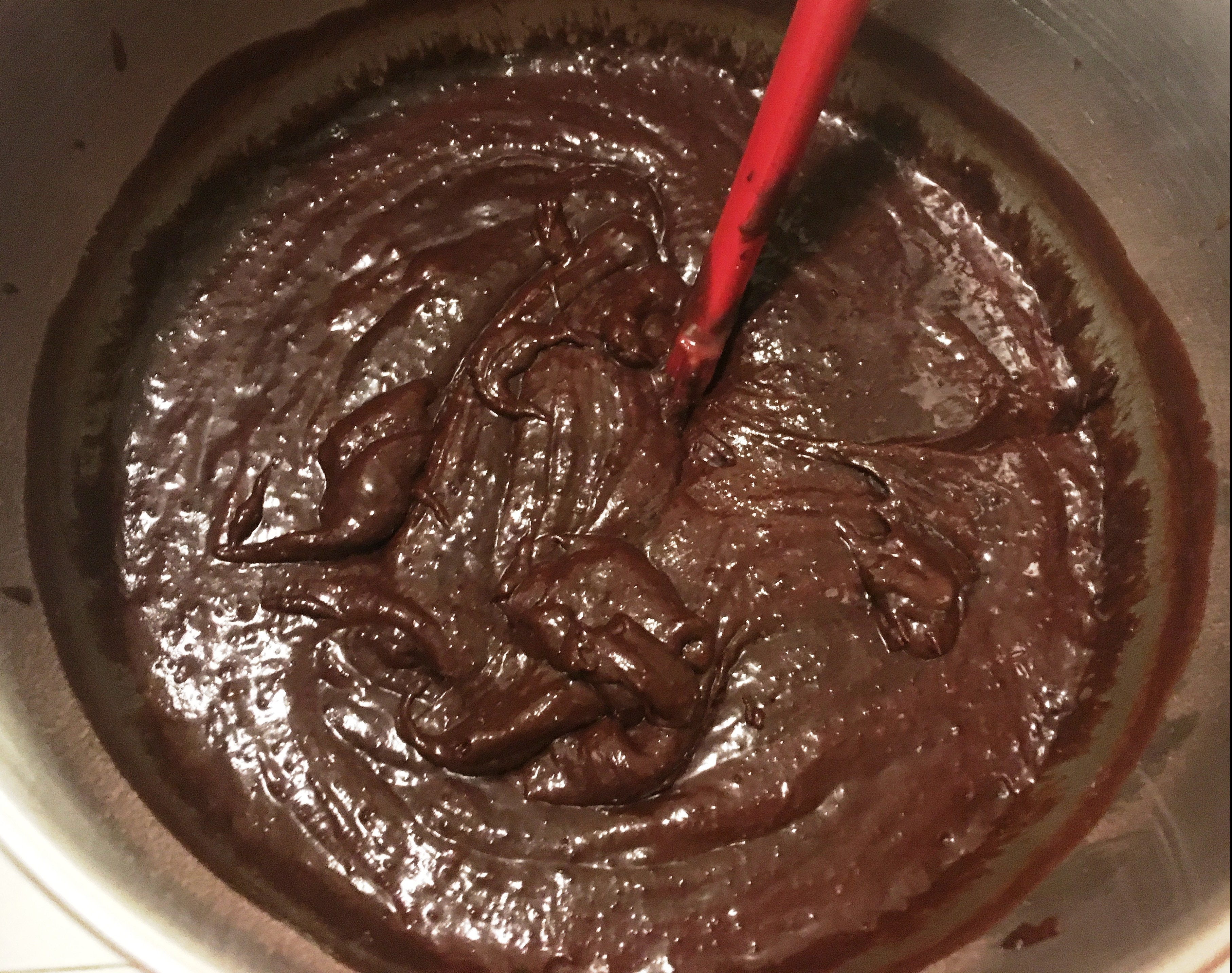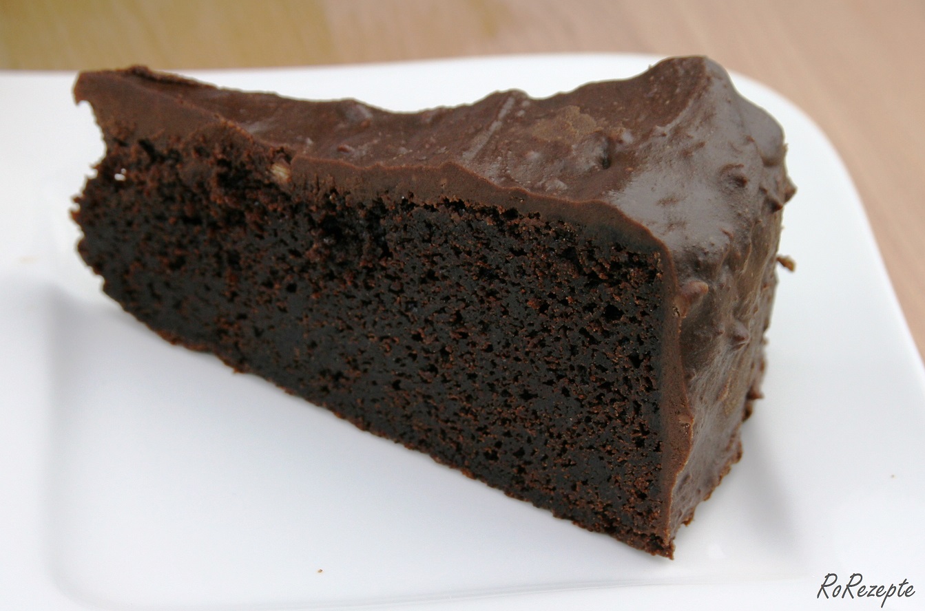 Kaffee unterrühren Trockene und flüssige Zutaten mischen Teig - Den Teig in die Form füllen, in den Backofen schieben und 90 Minuten backen. Den Kuchen herausnehmen, wenn an einem mittig eingestochenen Spieß beim Herausziehen gebackene Kuchenklümpchen – jedoch kein ungebackener Teig – kleben bleibt. Der Kuchen ähnelt eher einem großen Brownie als einem fluffigen Biskuit.