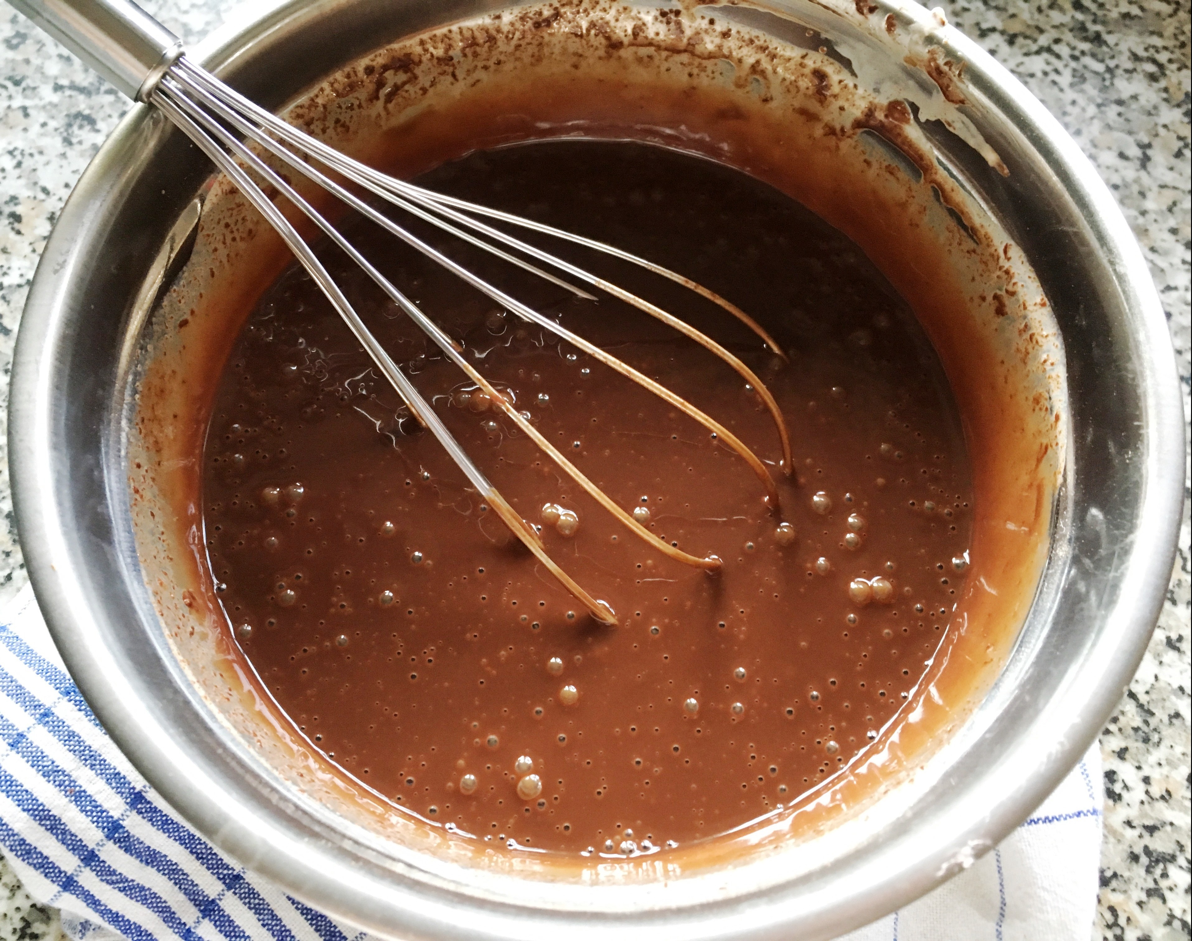 trockene Zutaten mischen - Die Eier mit der Buttermilch verquirlen und zur abgekühlten Butter-Schokoladen-Mischung geben.