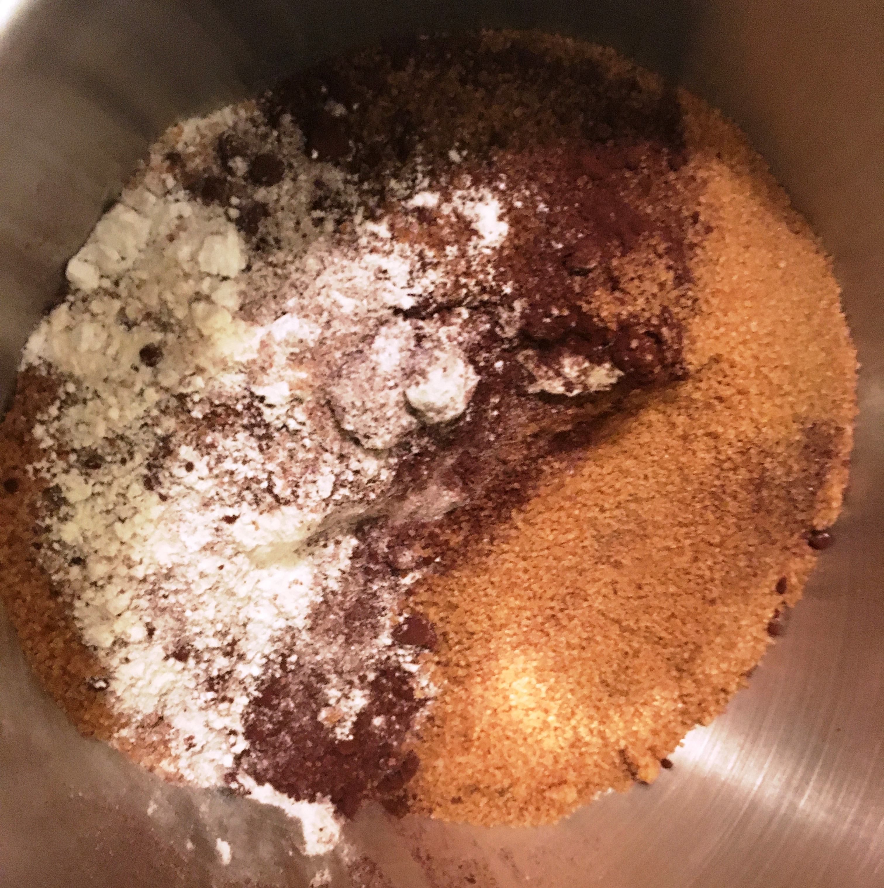 Schokolade mit Butter schmelzen - Das Mehl mit dem Backpulver, dem Natron, den Zuckersorten und dem Kakaopulver in einer großen Rührschüssel vermischen.