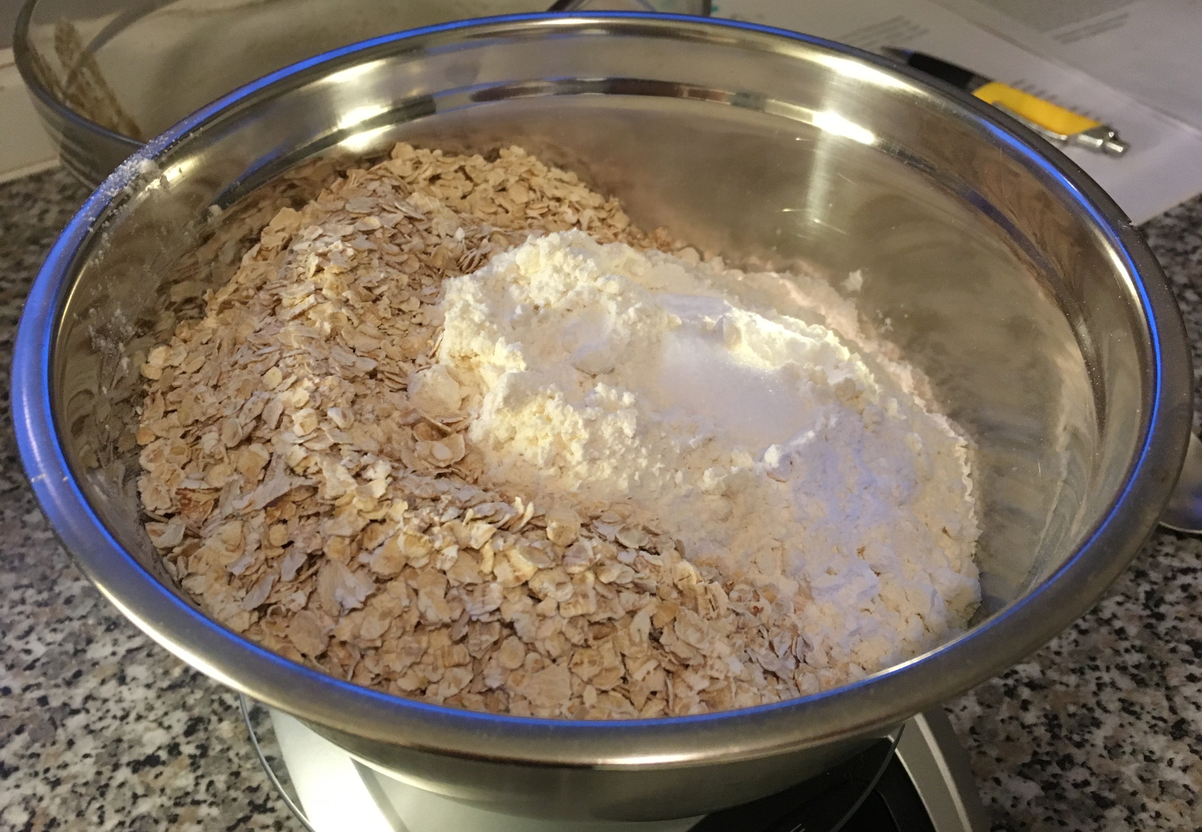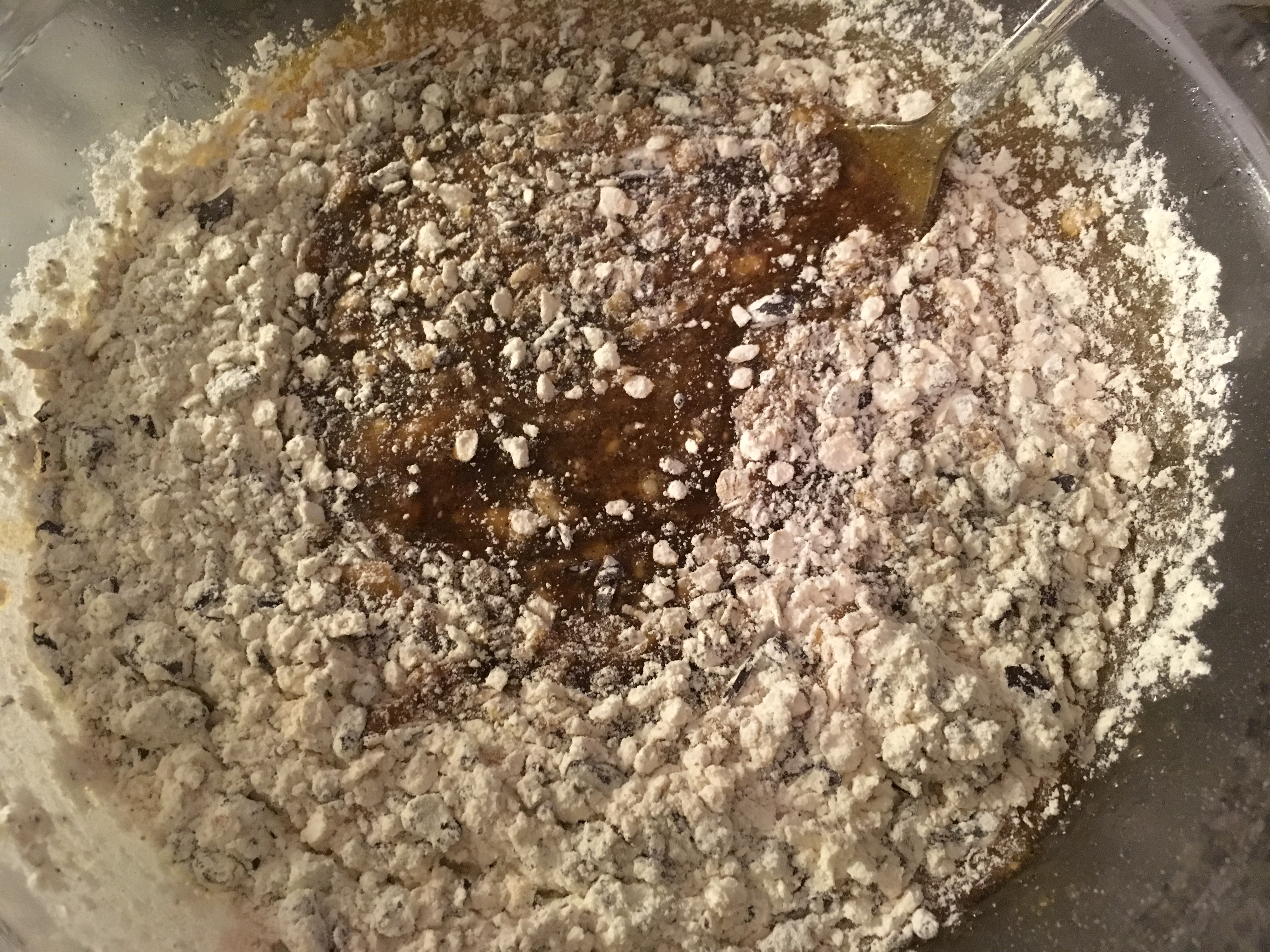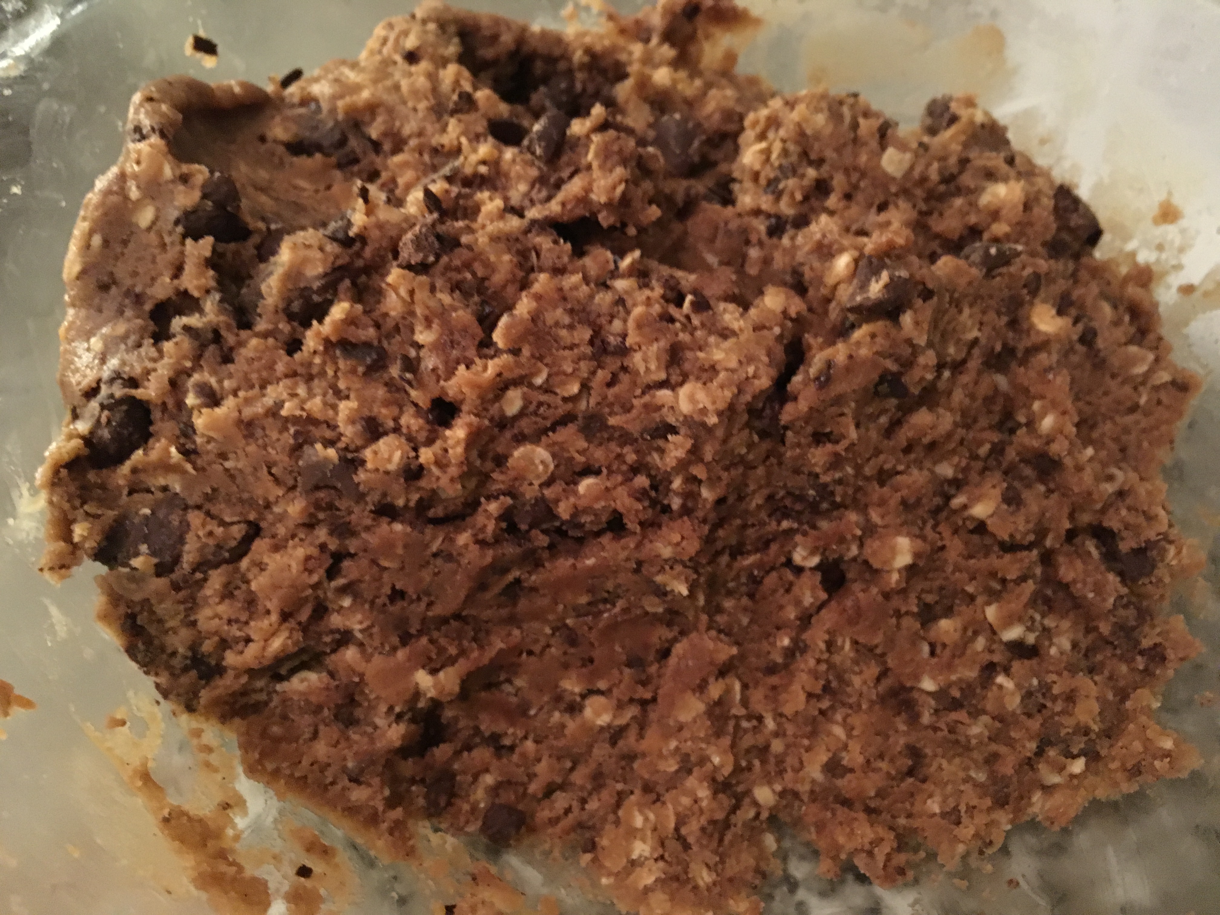 3. Das Ei (Die Eier 😉 unterschlagen, Mehl, Backpulver, Salz, Schokolade und Flocken unterrühren.