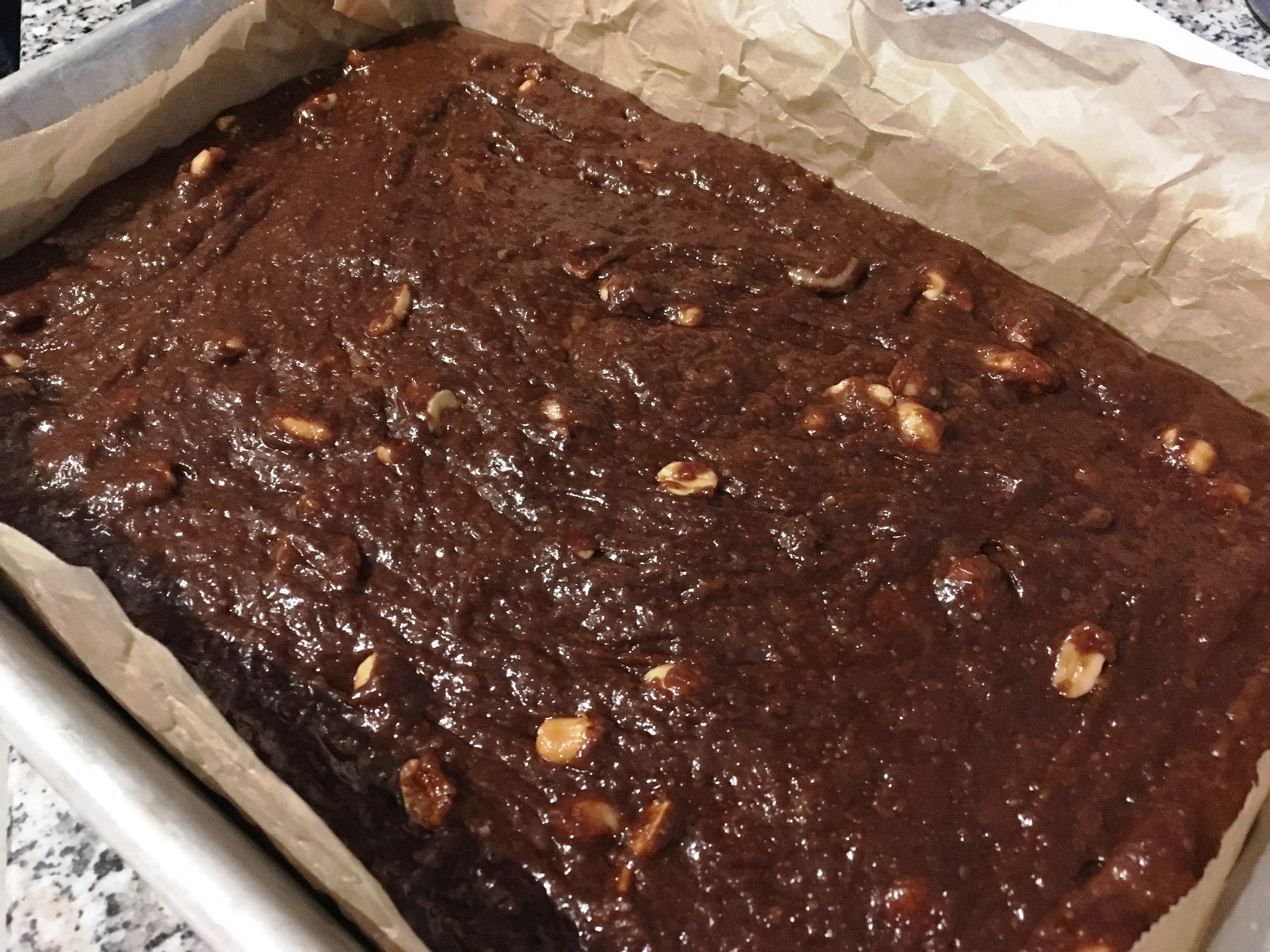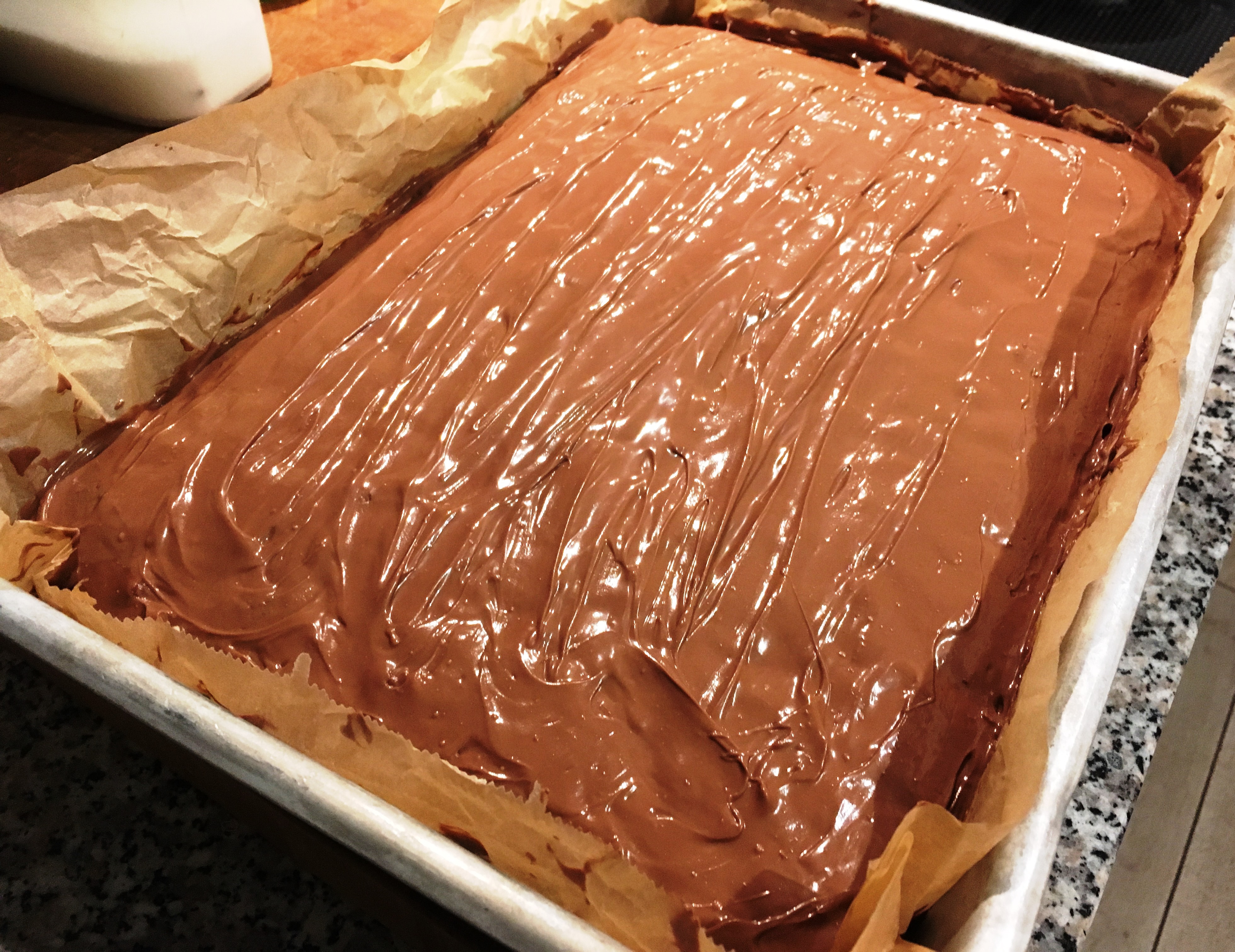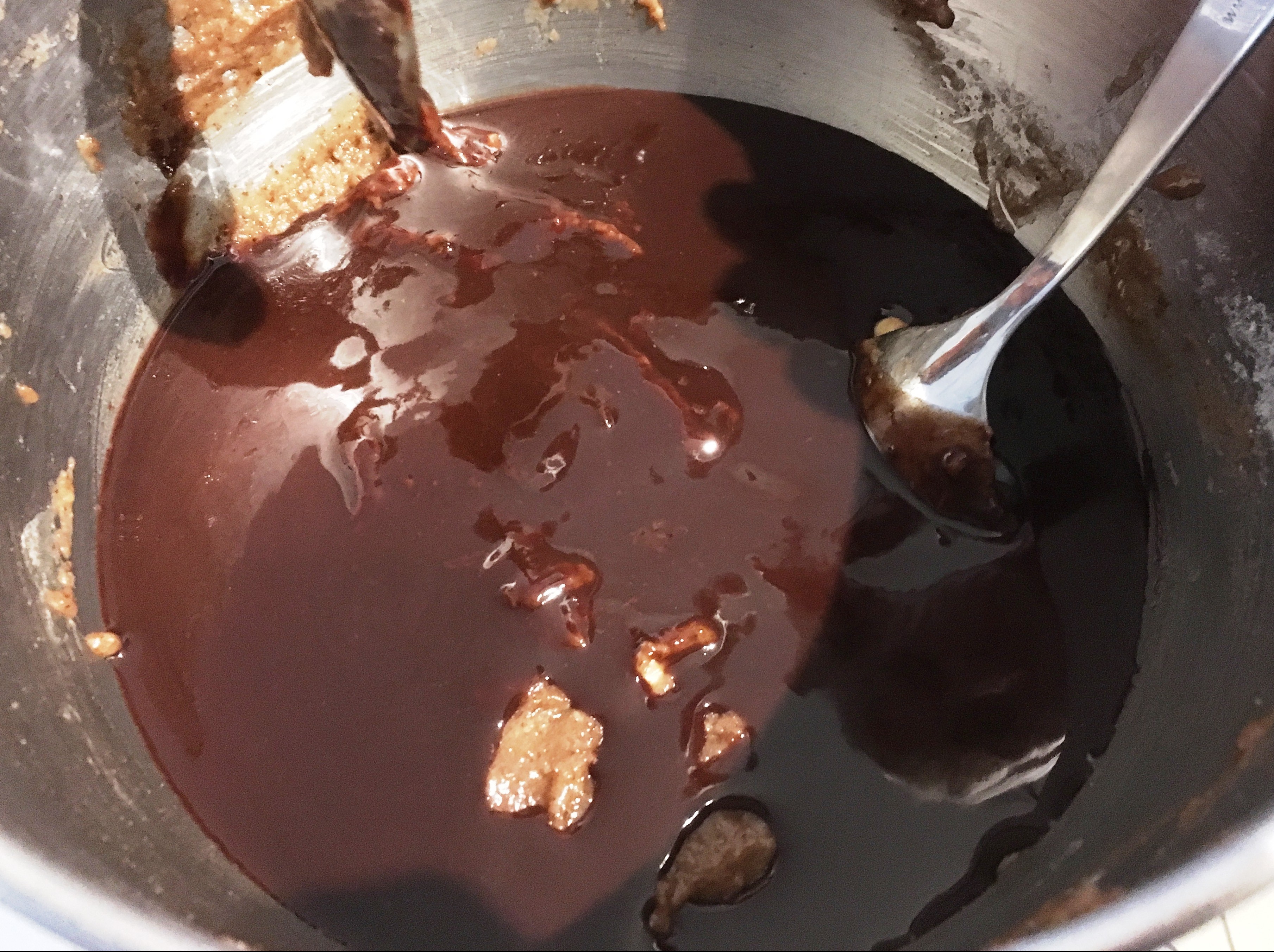 Zartbitterschokolade mit Butter schmelzen - Dann mit den restlichen Zutaten einen Rührteig zubereiten. Die karamellisierten Erdnüsse vorsichtig unterheben. Die geschmolzene Zarbitterschokolade mit Butter nicht vergessen 😉