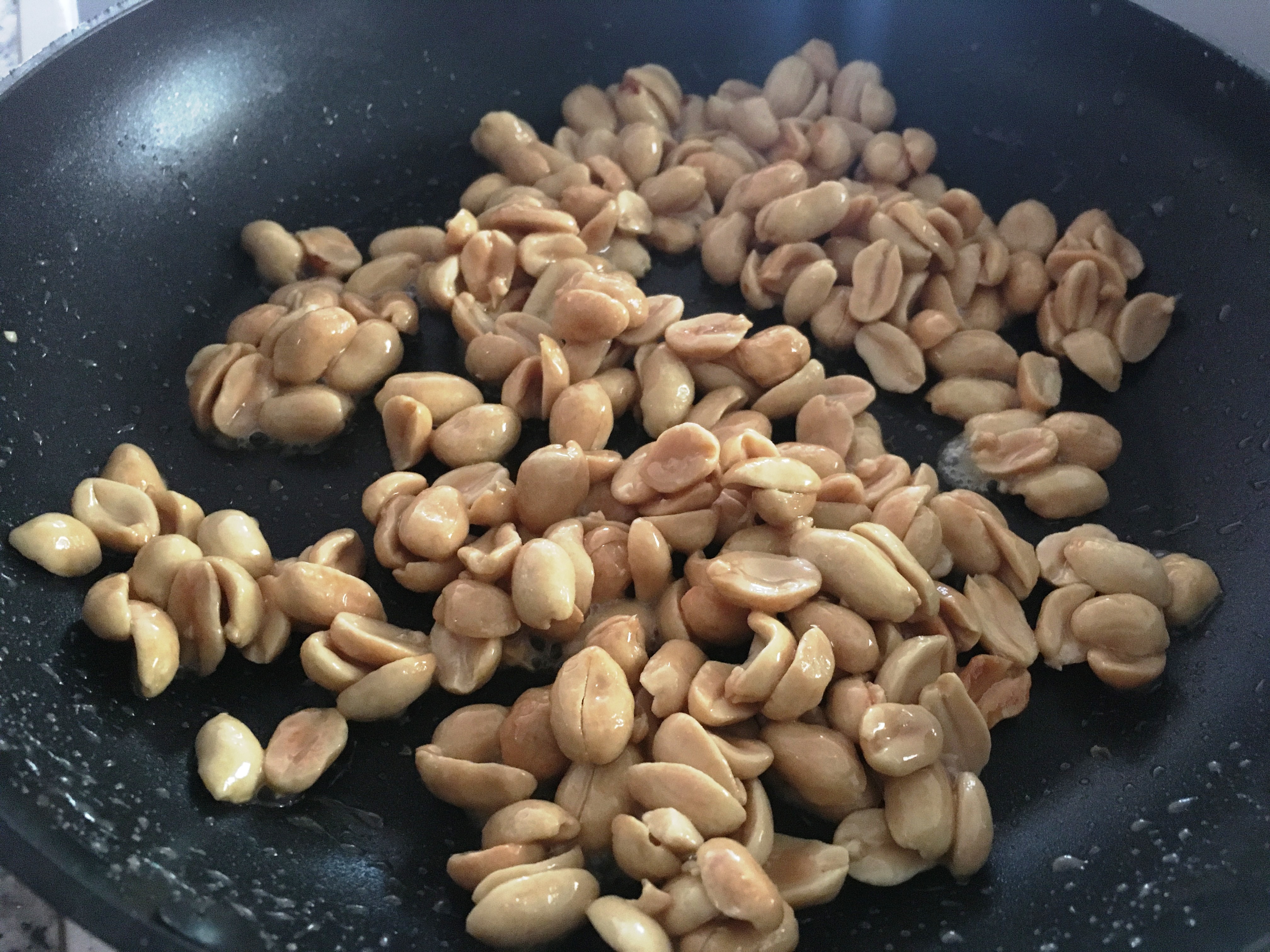 - Zwei Esslöffel Zucker mit Wasser in der Pfanne leicht erhitzen und die salzige Erdnüsse darin karamellisieren. Darauf achten, dass die Nüsse nicht zu braun werden. Zur Seite stellen und abkühlen lassen.