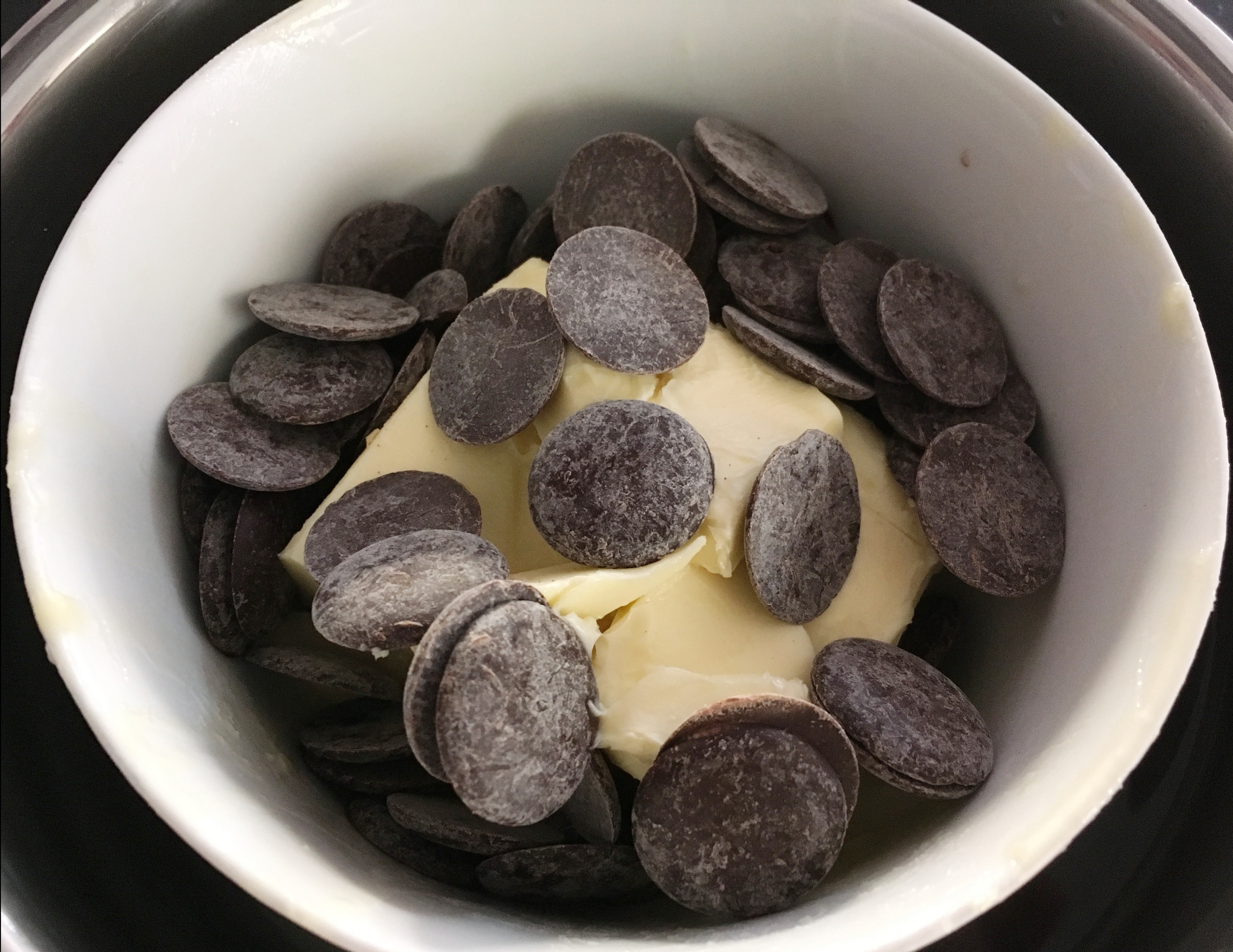 Zucker mit Wasser erhitzen Erdnüsse karamellisieren - Butter zusammen mit der Zartbitterschokolade im Wasserbad schmelzen und kurz abkühlen lassen.