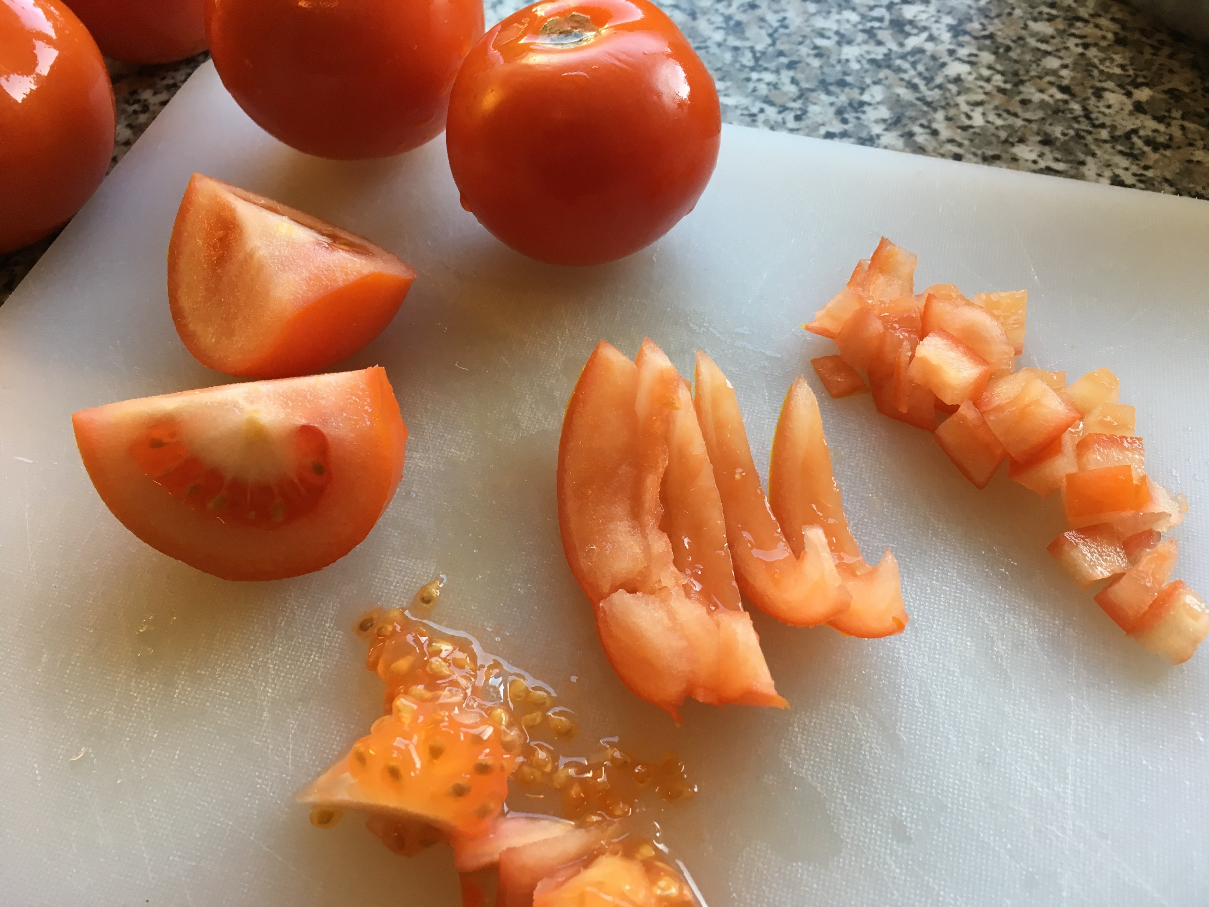Tomaten würfeln Tomaten vermengen - In der Zwischenzeit die Nudeln kochen und nach dem Abgießen, abkühlen lassen.
