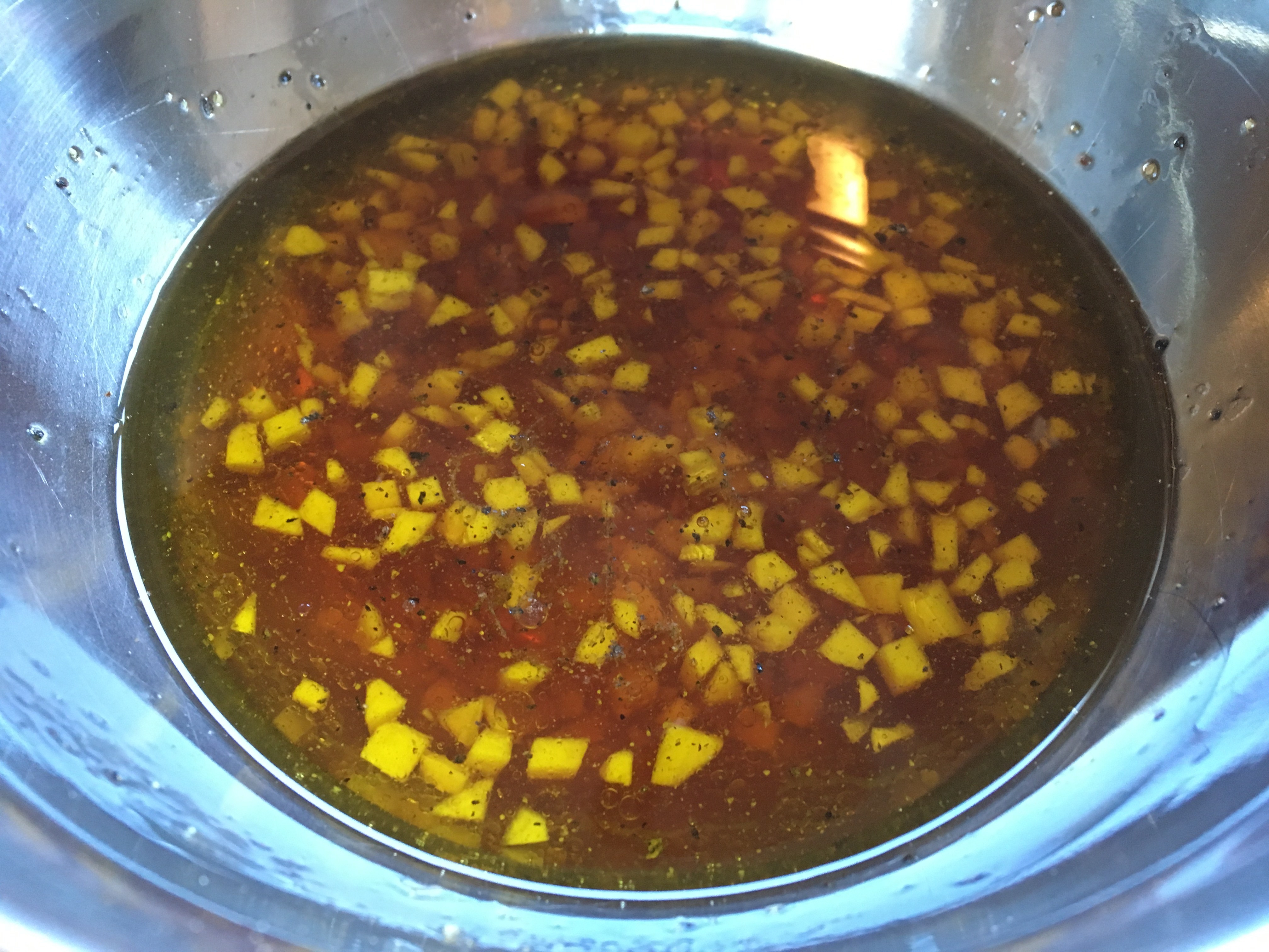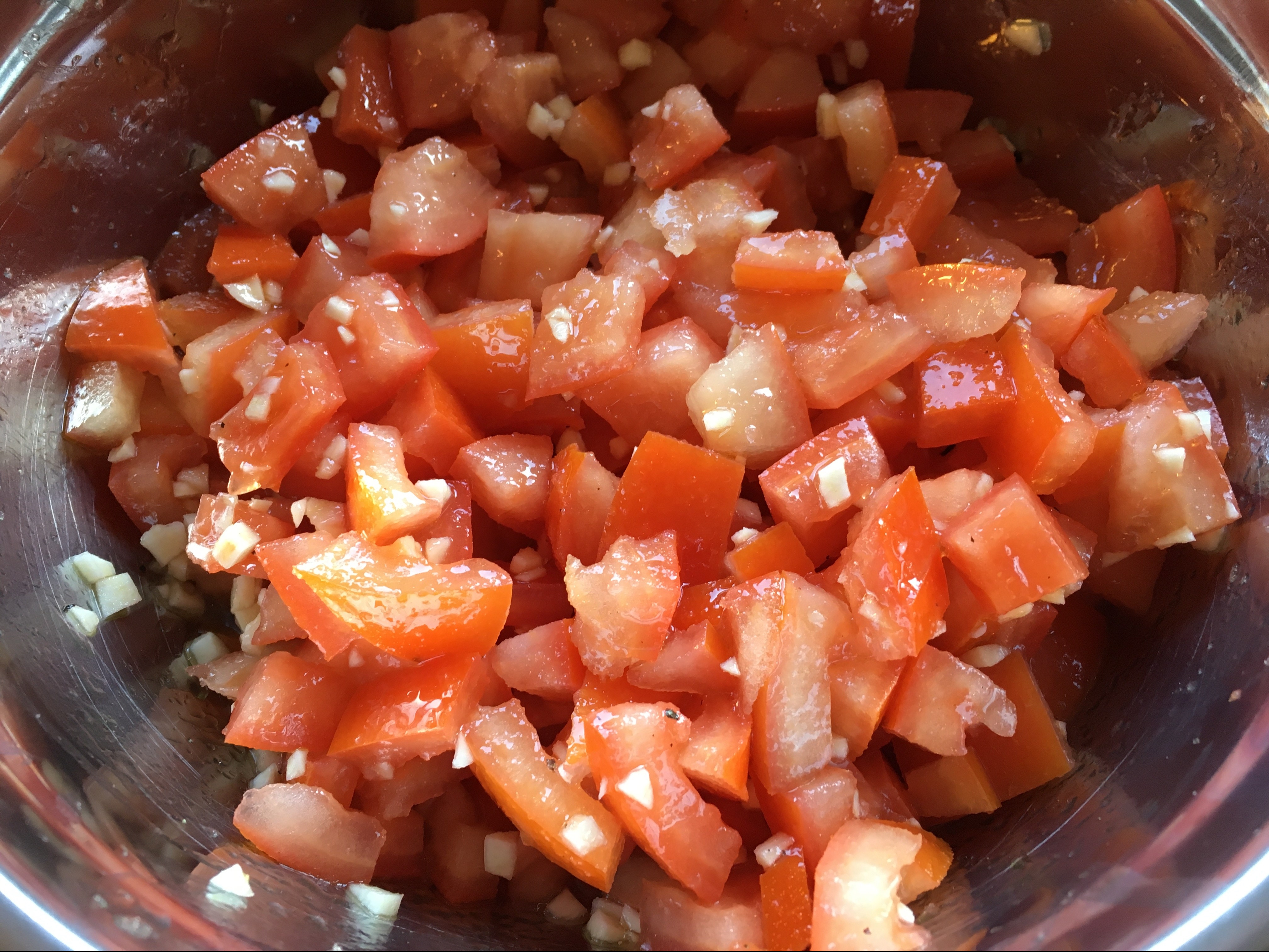 Knoblauch gewürfelt, Essig, Öl, Pfeffer - Die kleingeschnitten Tomaten in die Vinaigrette geben und ziehen lassen.