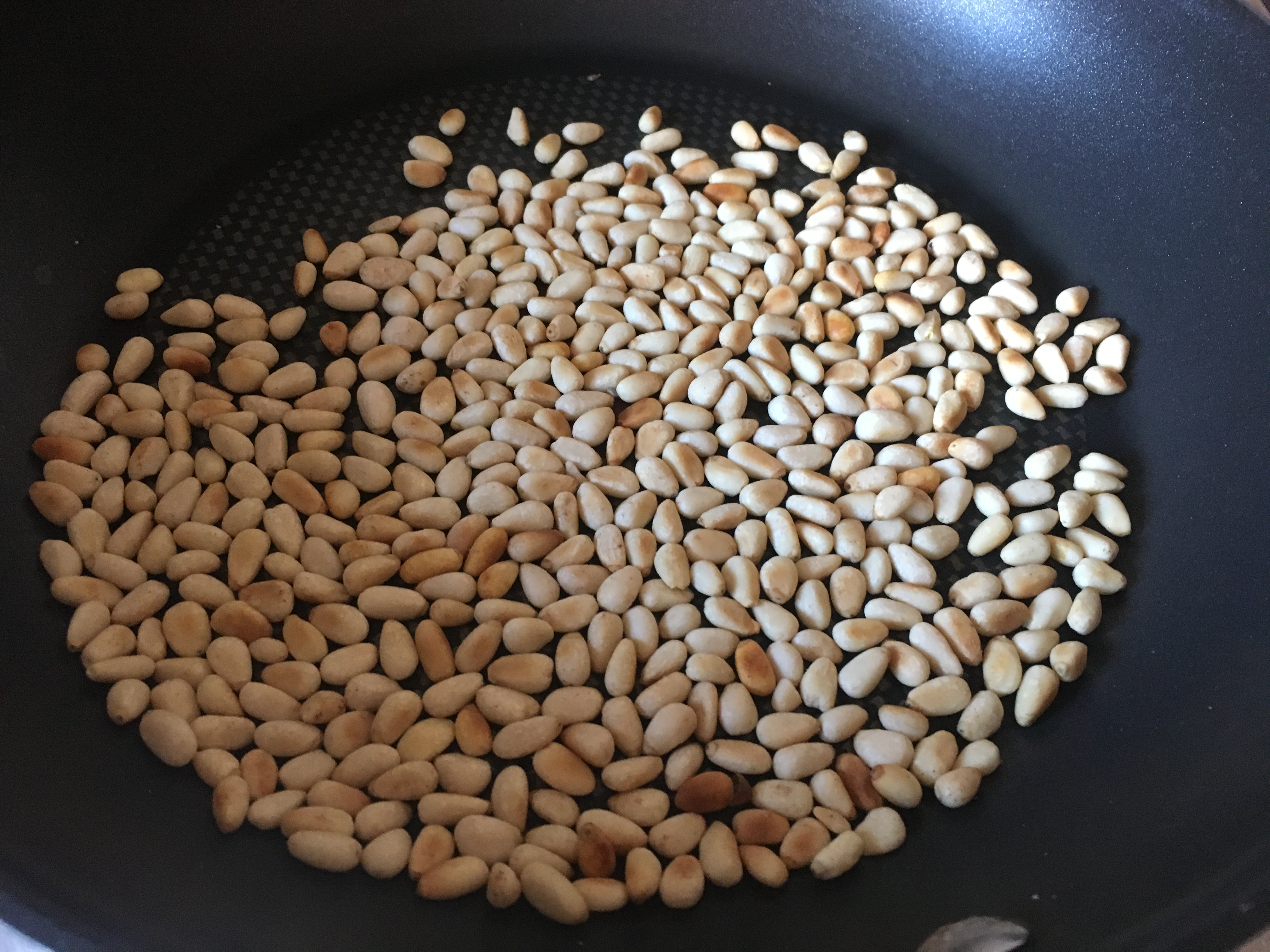 Pinienkerne anrösten - Dann die Erkalteten Nudeln und das gehackte Basilikum dazu. Mit Pfeffer und evtl. Salz, noch etwas Öl und Essig abschmecken. Etwas mehr Olivenöl habe ich noch zugegeben.
