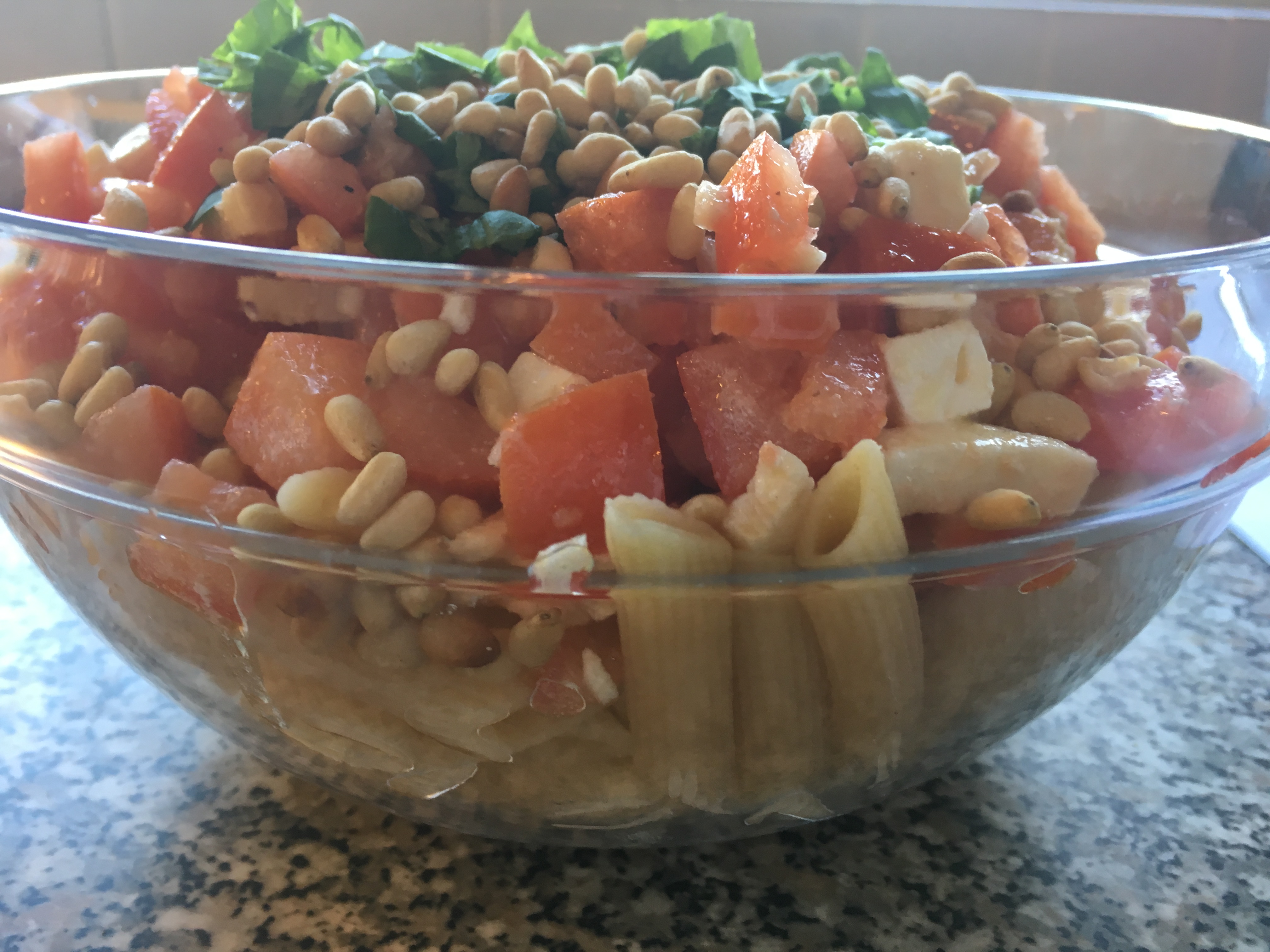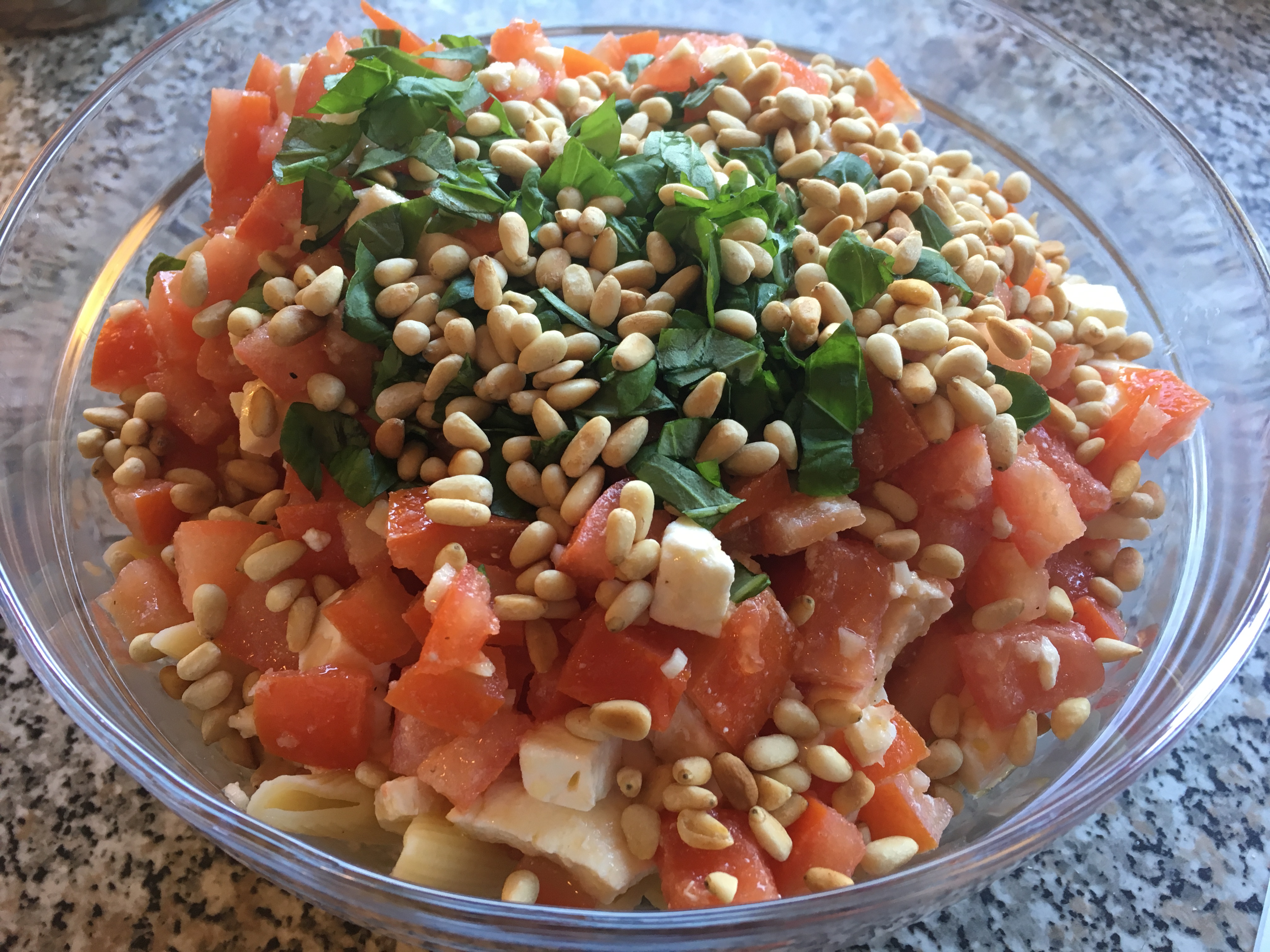 Nudeln, Pinienkerne, Mozarella, Feta, Basilikum und Öl-Gemisch mit Tomaten zugeben vermengen