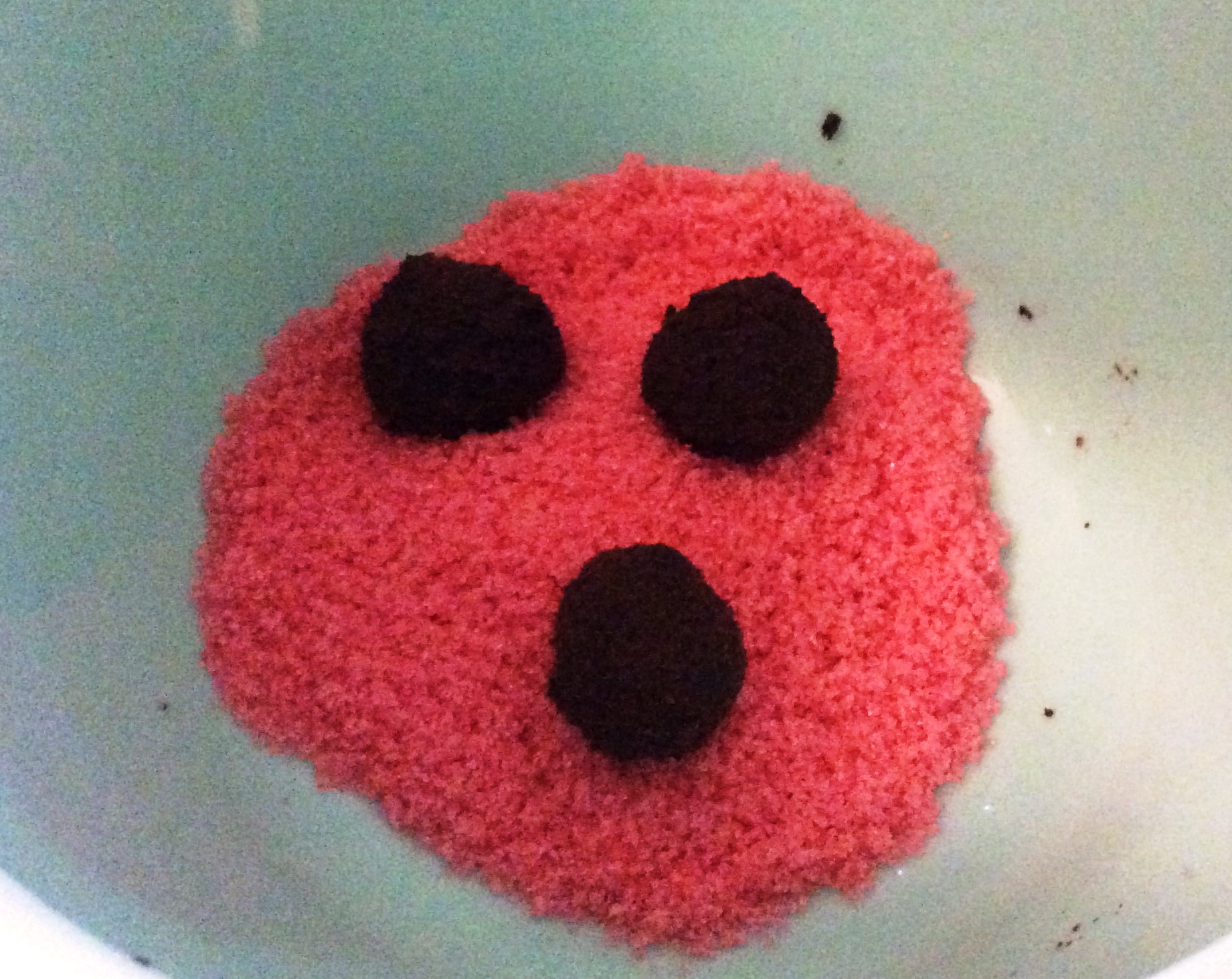 • 1/3 Tasse (ca. 70g) rot gefärbter Zucker 70g Zucker, ein paar Tropfen rote Lebensmittelfarbe und schön rühren 🙂