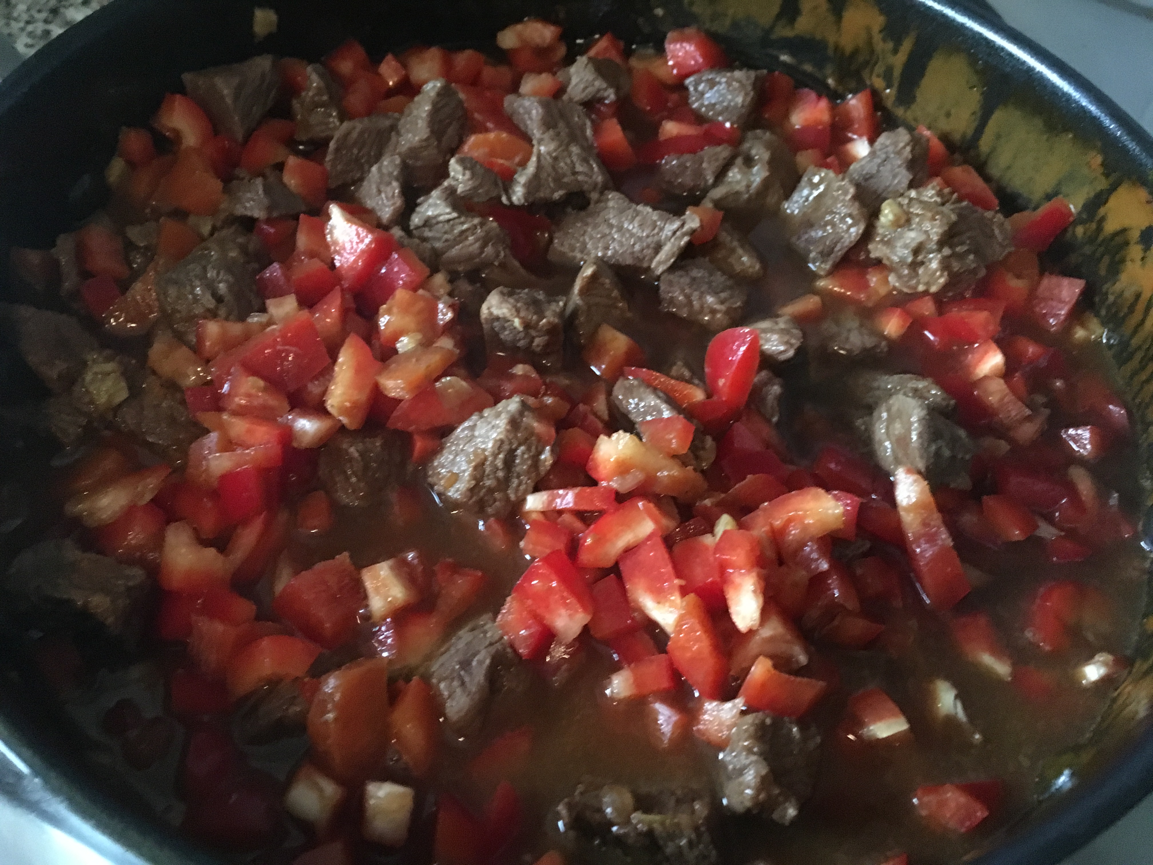 ablöschen köcheln lassen - Nun die beiden Paprika in kleine Stücke schneiden und zum Gulasch geben. Eine weitere Stunde zugedeckt köcheln lassen.