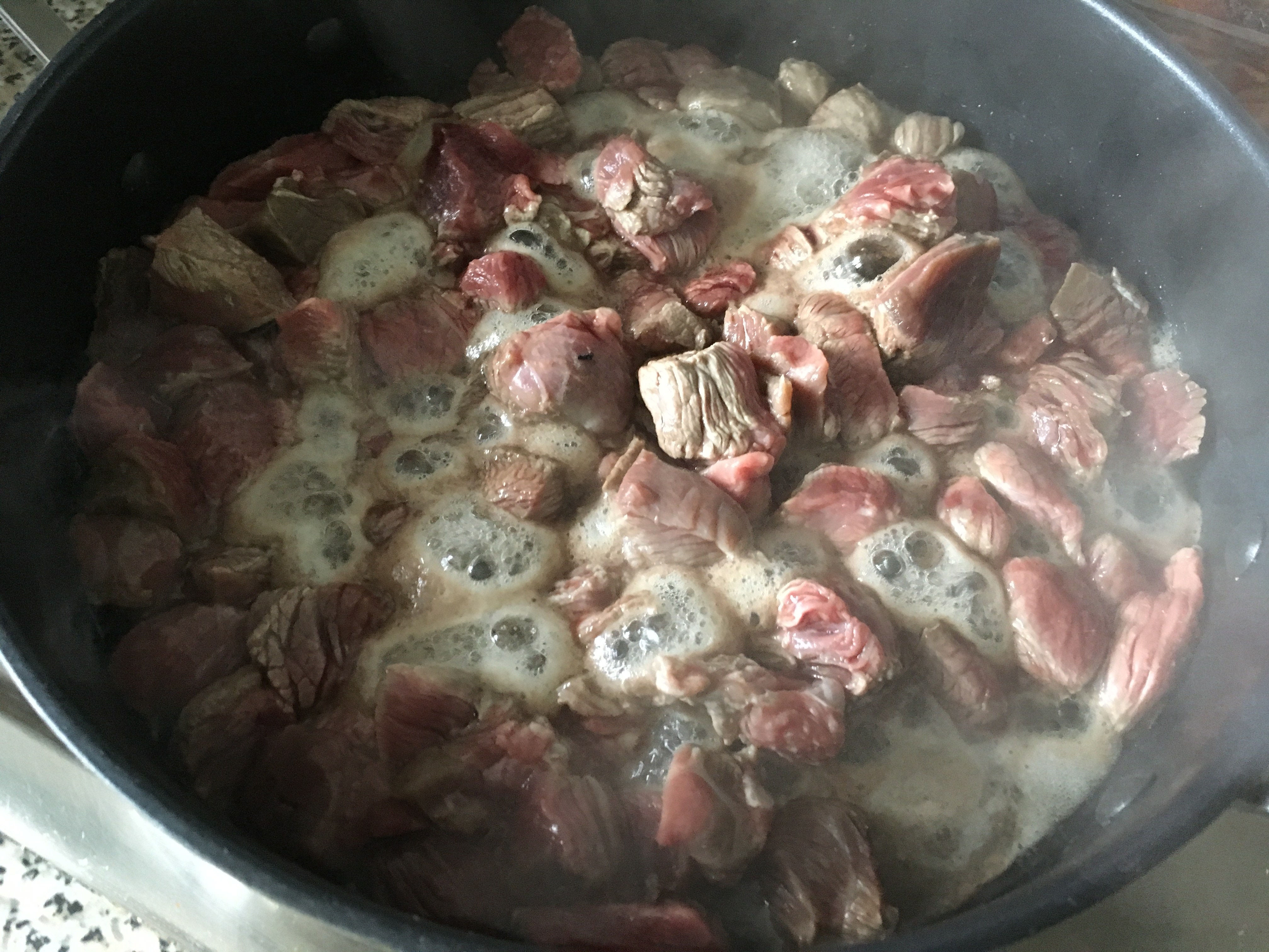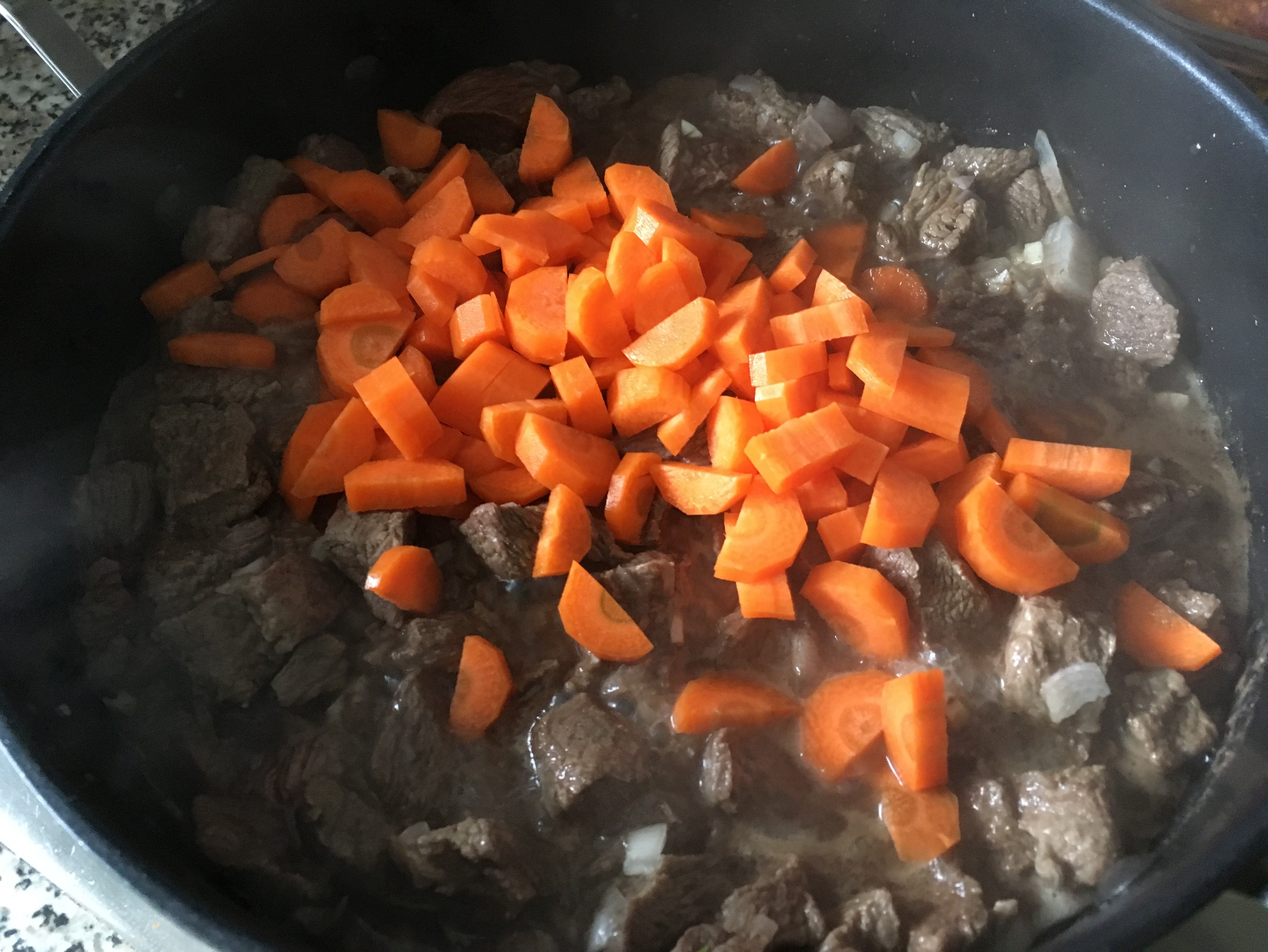 Möhren geschnitten dazugeben würzen - Mit Brühe und Saft oder Wein ablöschen, Herd auf die Hälfte der maximalen Temperatur runterdrehen und dann das Gulasch zugedeckt 1 ½ Stunden ziehen lassen. Immer wieder umrühren.