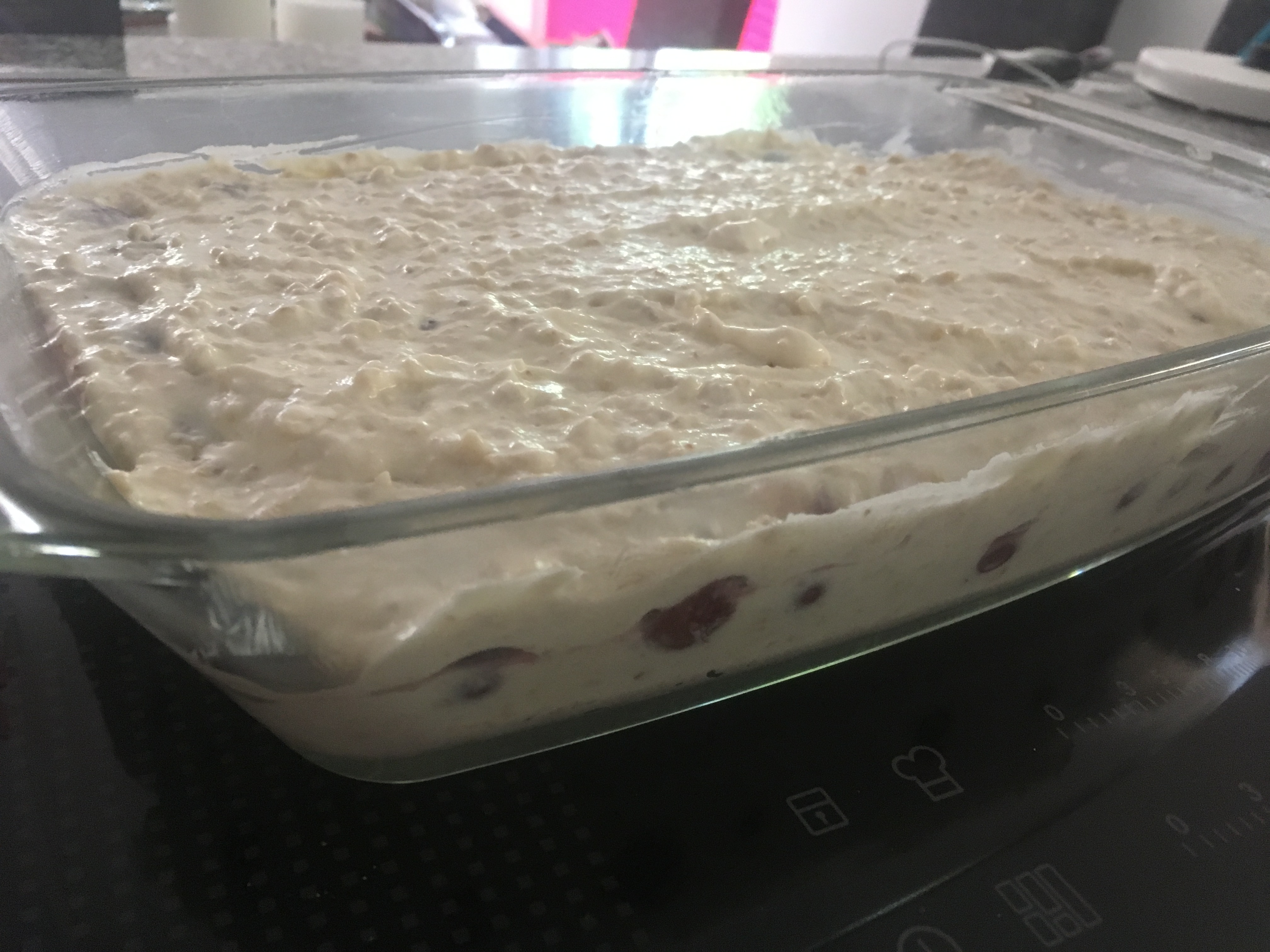 5. Die Hälfte der Quarkmasse in eine gut gefettete Auflaufform geben, Kirschen darauf verteilen und den Rest der Quarkmasse darüberstreichen.