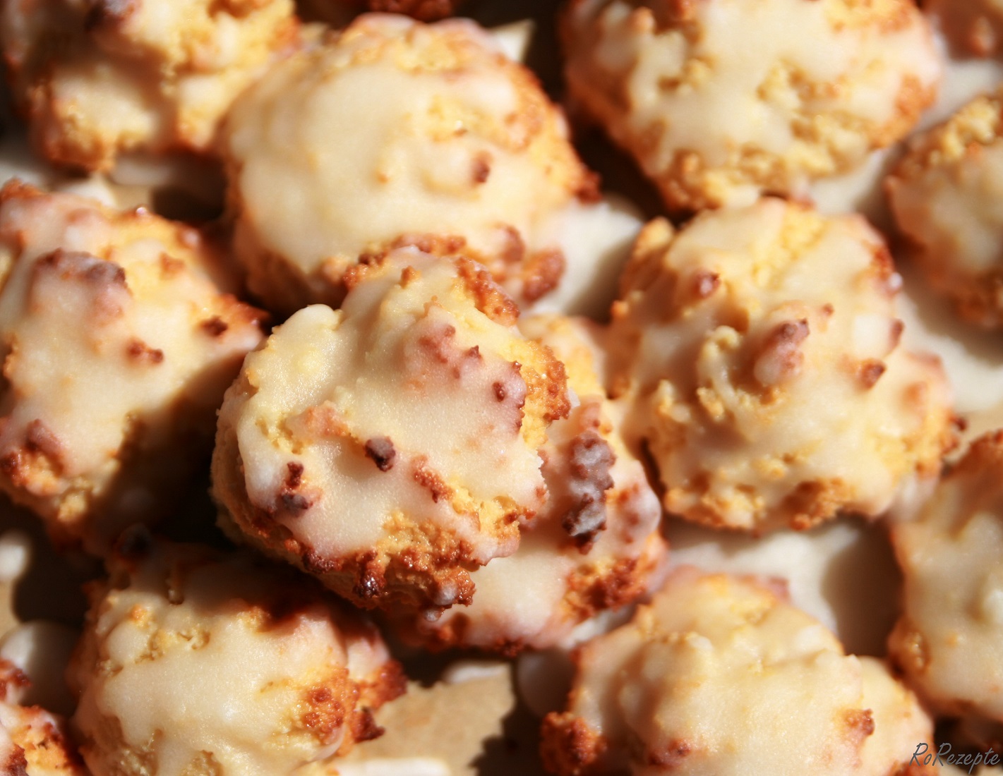 Glasurzutaten vermengen und erwärmen - Die abgekühlten Honigseufzer damit glasieren. Das funktioniert am besten, wenn man mit einem Teelöffel die Glasur über den Seufzer gibt und die Prozedur ein paarmal wiederholt.