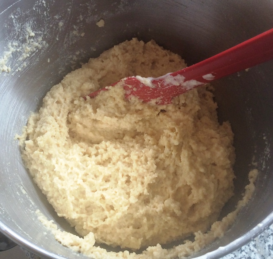 Honig zufügen, vermengen verschlagen - Die Mandeln, das Mehl und das Salz hinzugeben und gut unterrühren. (Nicht mit dem Schneebesen, der schafft das nicht.) Die Menge der Mandeln kann hier variieren. Das hängt von der tatsächlichen Größe der Eier und vom Mehlgrad der Mandeln ab. Der Teig muss am Ende eine so feste Konsistenz haben, dass er beim Backen die Form behält und nicht auseinanderfließt.