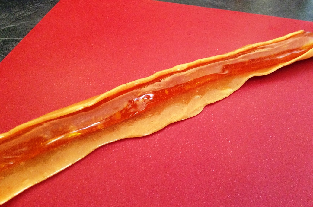 Aromen zugeben vermengen ** Die Herstellungsweise von Punkt 4 und 5 ist analog des Rezeptes im Buch. Allerdings würde ich das an dieser Stelle anders machen. Das Einmanschen der Aromen und Farben ist nicht nur schwierig, verfärbt eure Hände, habt Farb- bzw. Aromaverluste und währenddessen ist euer zweiter Bonbonmasseteil auch kalt geworden. D.h. ihr kippt die Hälfte eurer rohen warmen Bonbonmasse nicht auf die Silikonmatte, sondern in einen zweiten Topf, welchen ihr vorher schon etwas erwärmt habt. Anschließend mischt ihr beide Tele entsprechend der Aroma/Farben/Pulver aus Punkt 4 und 5. Wenn beide Massen homogen vermengt sind, kippt ihr diese etwas getrennt voneinander auf eure Silikonmatte und lasst es etwas abkühlen, sodass ihr mit euren Fingern an die Masse rangehen könnt (ich bin da wie Rikke etwas abgehärtet ;).