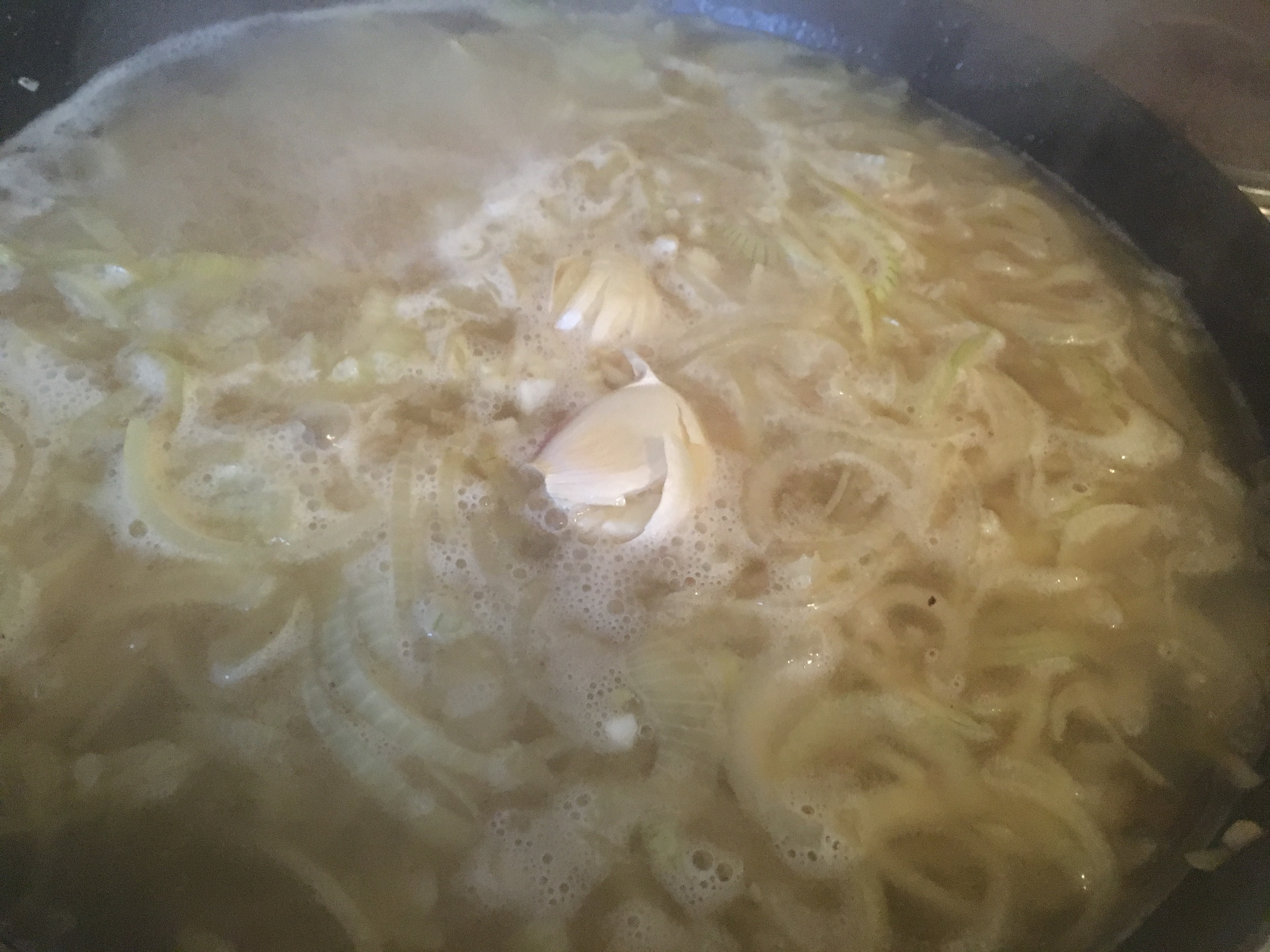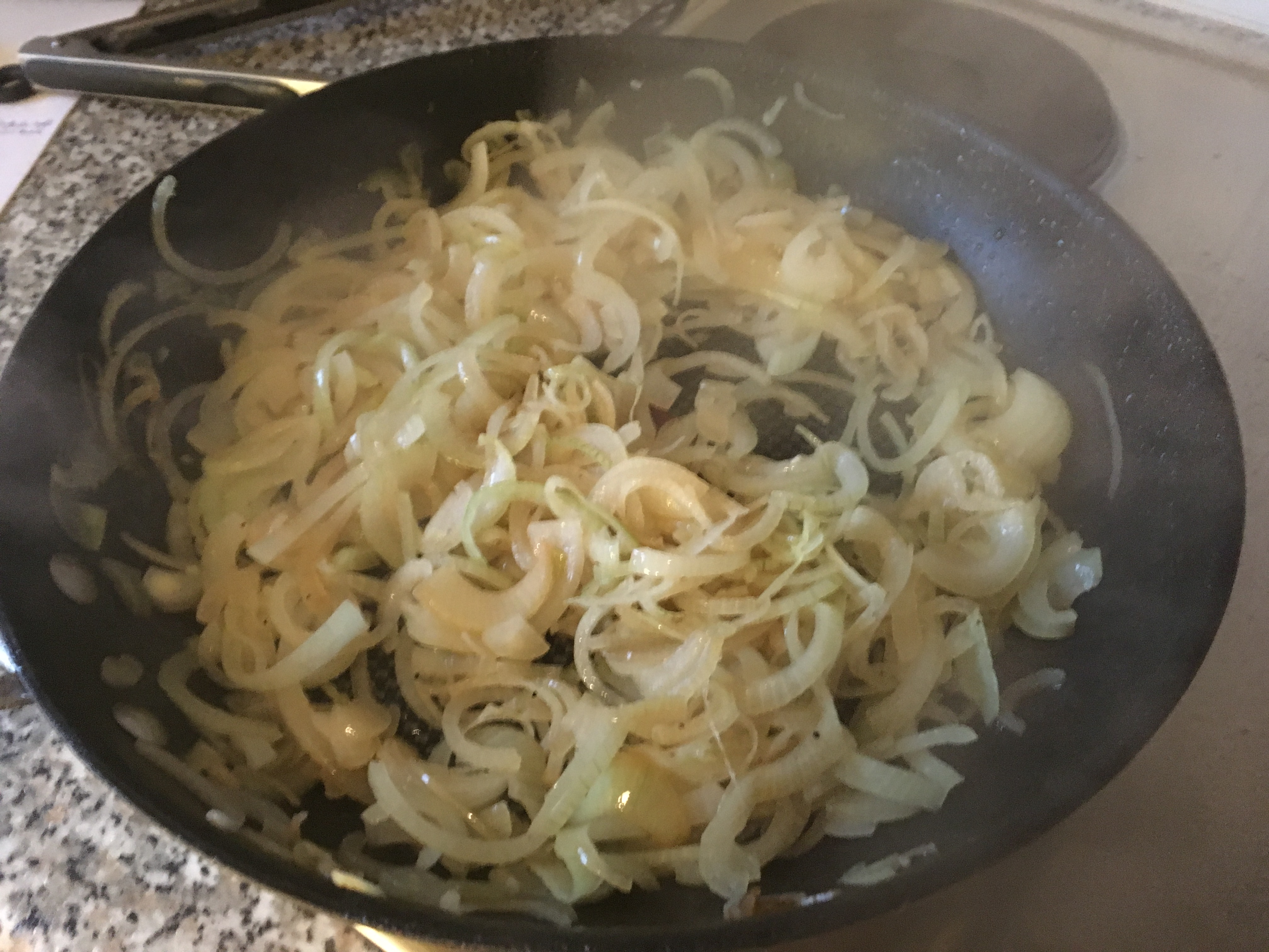 Zwiebeln schneiden Zwiebeln anbraten Zwiebeln angebraten - Die Zwiebeln mit der halben Flasche Weißbier aufgießen, mit Salz und Pfeffer würzen und danach mit kochendem Wasser aufgießen.