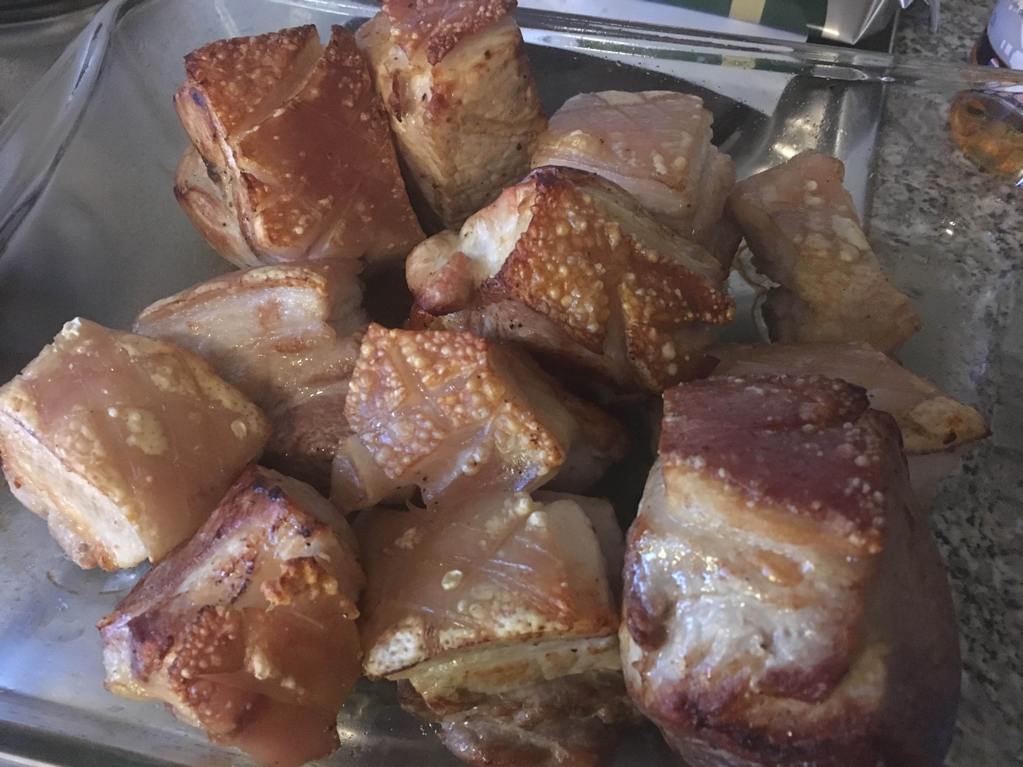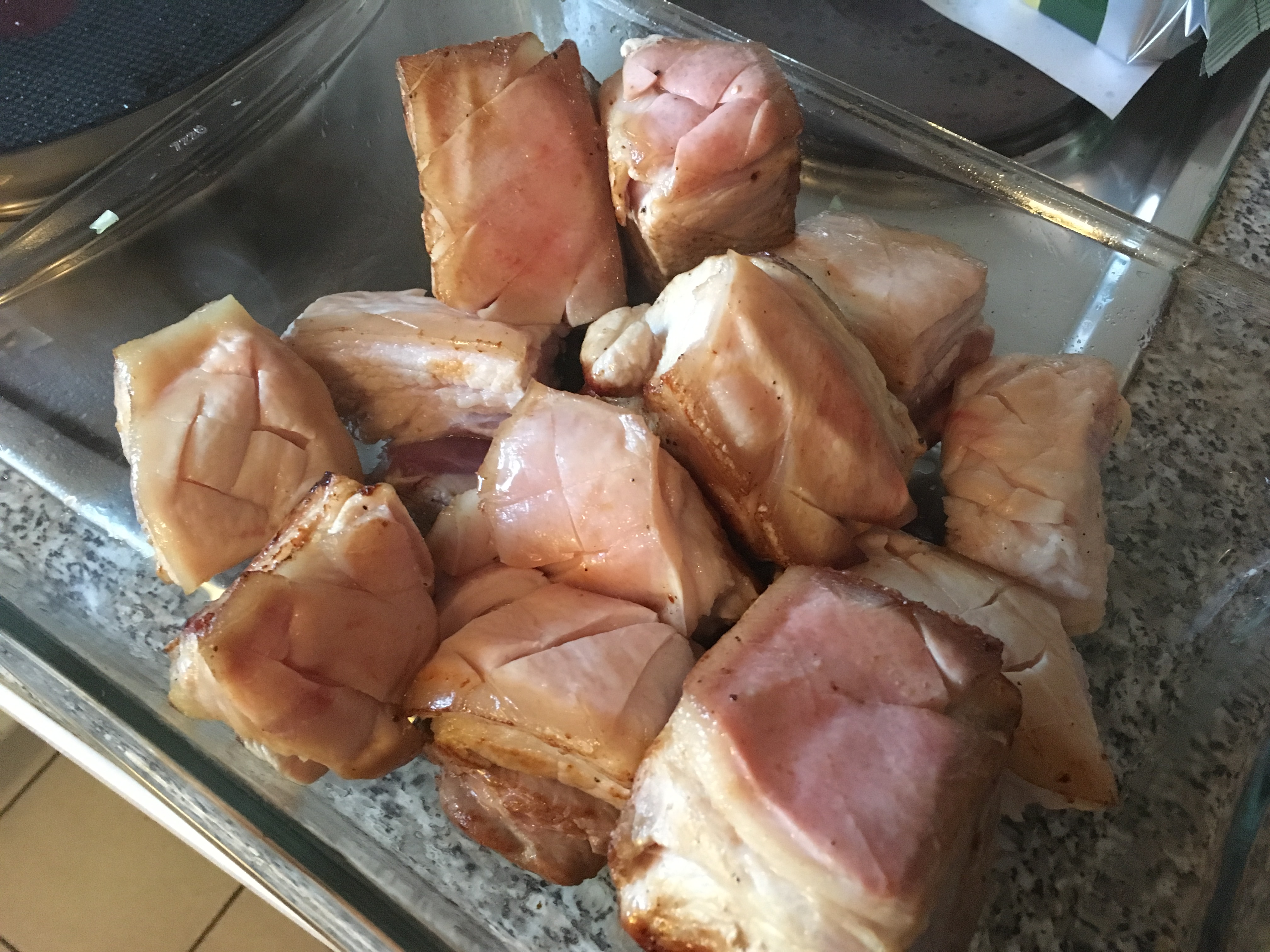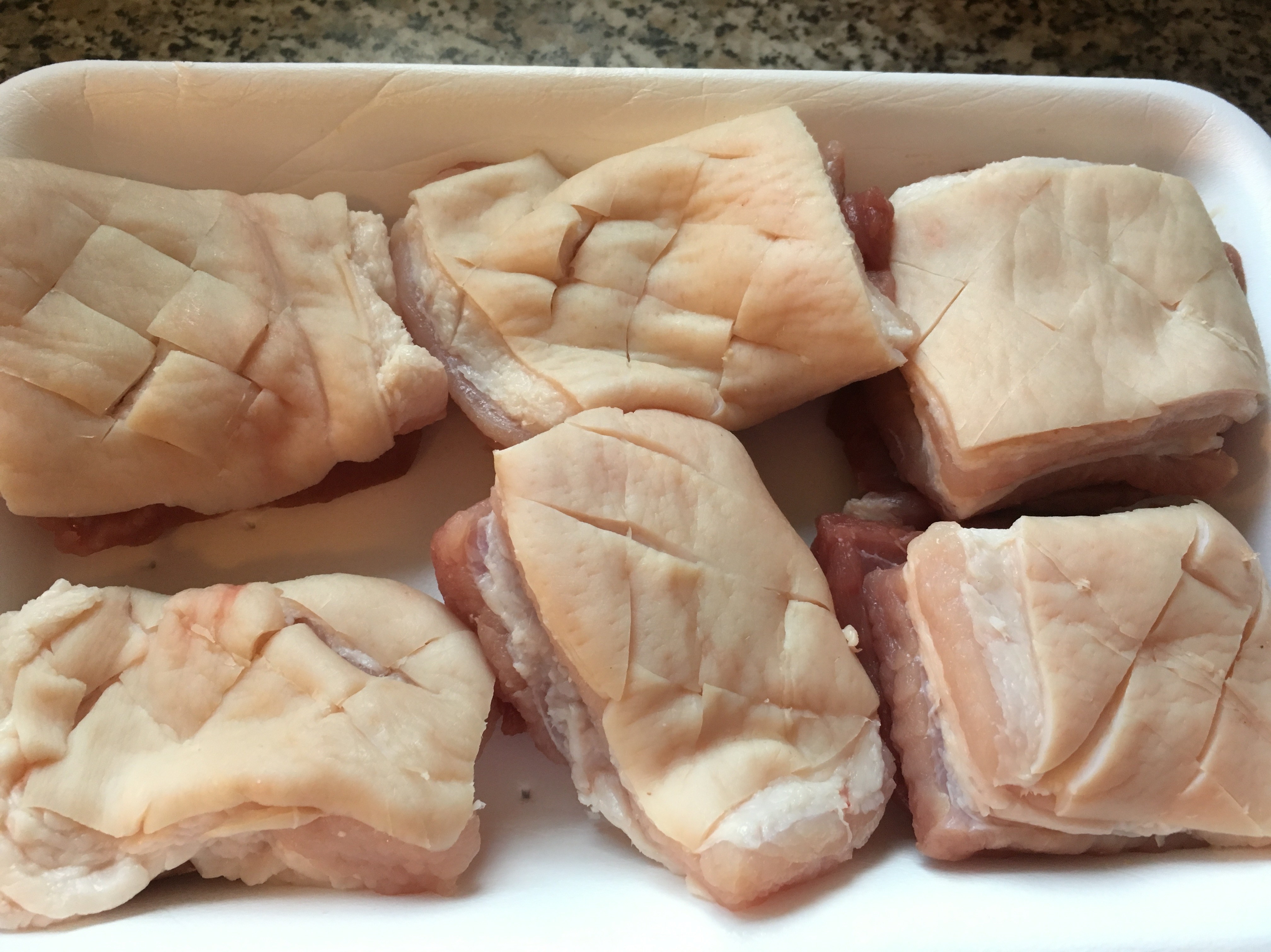 - Den Krustenbraten und das Wammerl in kleinere Stücke schneiden (ca. 6 x 6 cm). Die Fettschicht rautenförmig einschneiden für die Kruste.