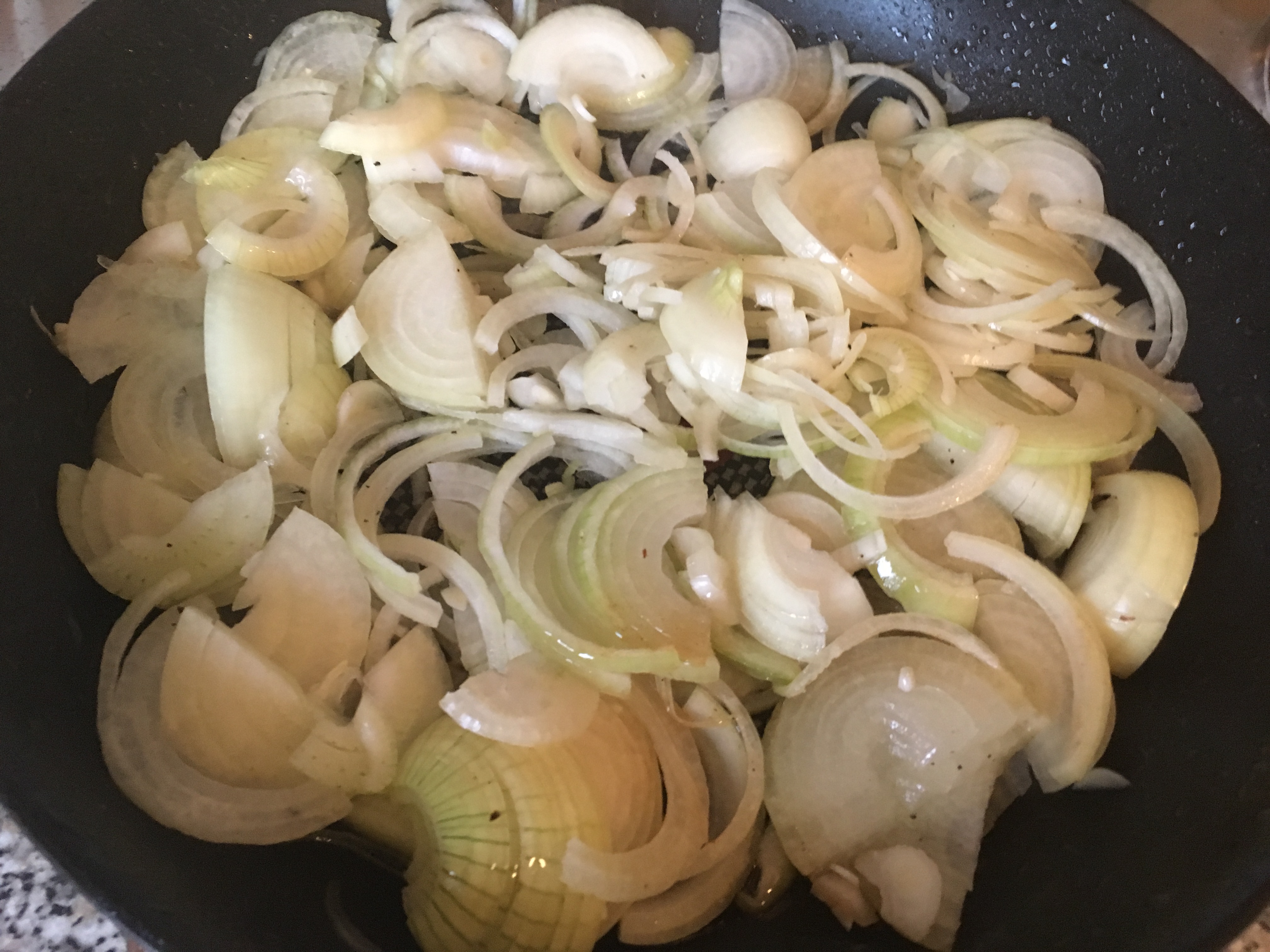 Anbraten Anbraten in Reine gesammelt Ofen schmoren - In der Pfanne, in der das Fleisch angebraten wurde, die klein geschnittenen Zwiebeln geben und scharf anbraten. Lt. Buch “in feine halbierte Ringe” Den Knoblauch gibt man erst etwas später zu den Zwiebeln, da er sonst bitter wird.