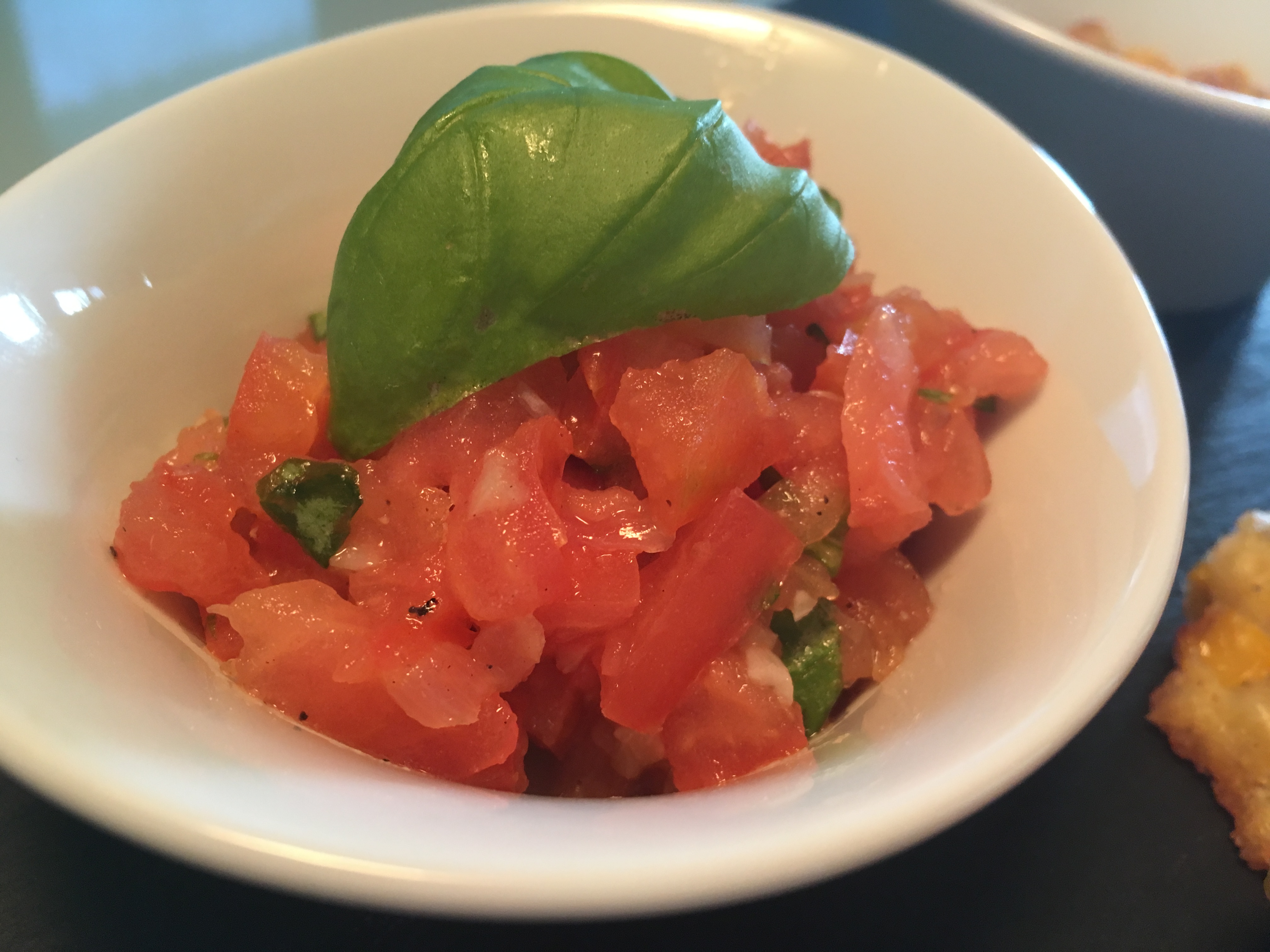 Ich habe die Maisbratlinge mit einem Tomatensalat serviert. Diesen habe ich analog einer Bruscetta hergestellt und passte super zu den Maisbratlingen.