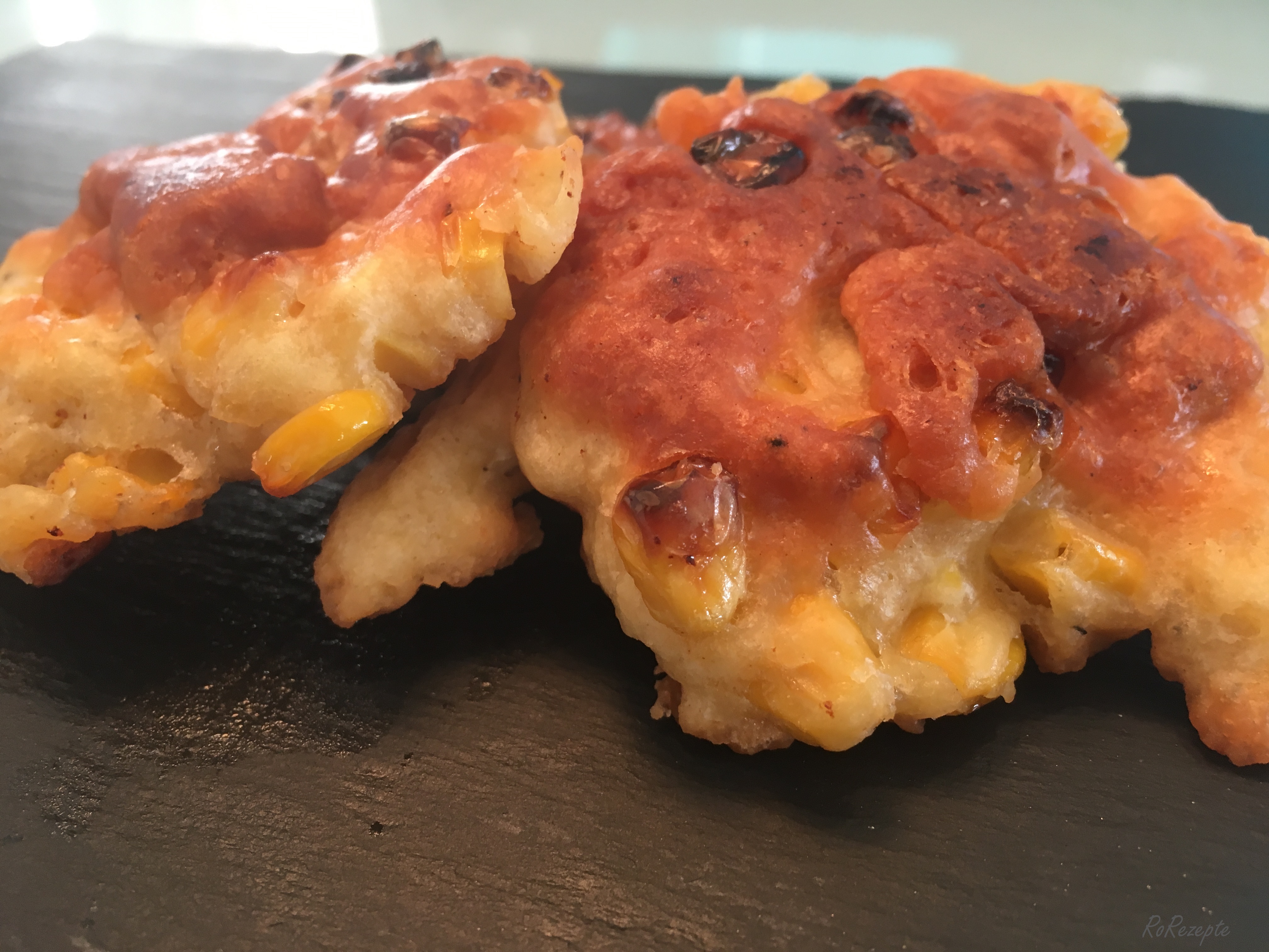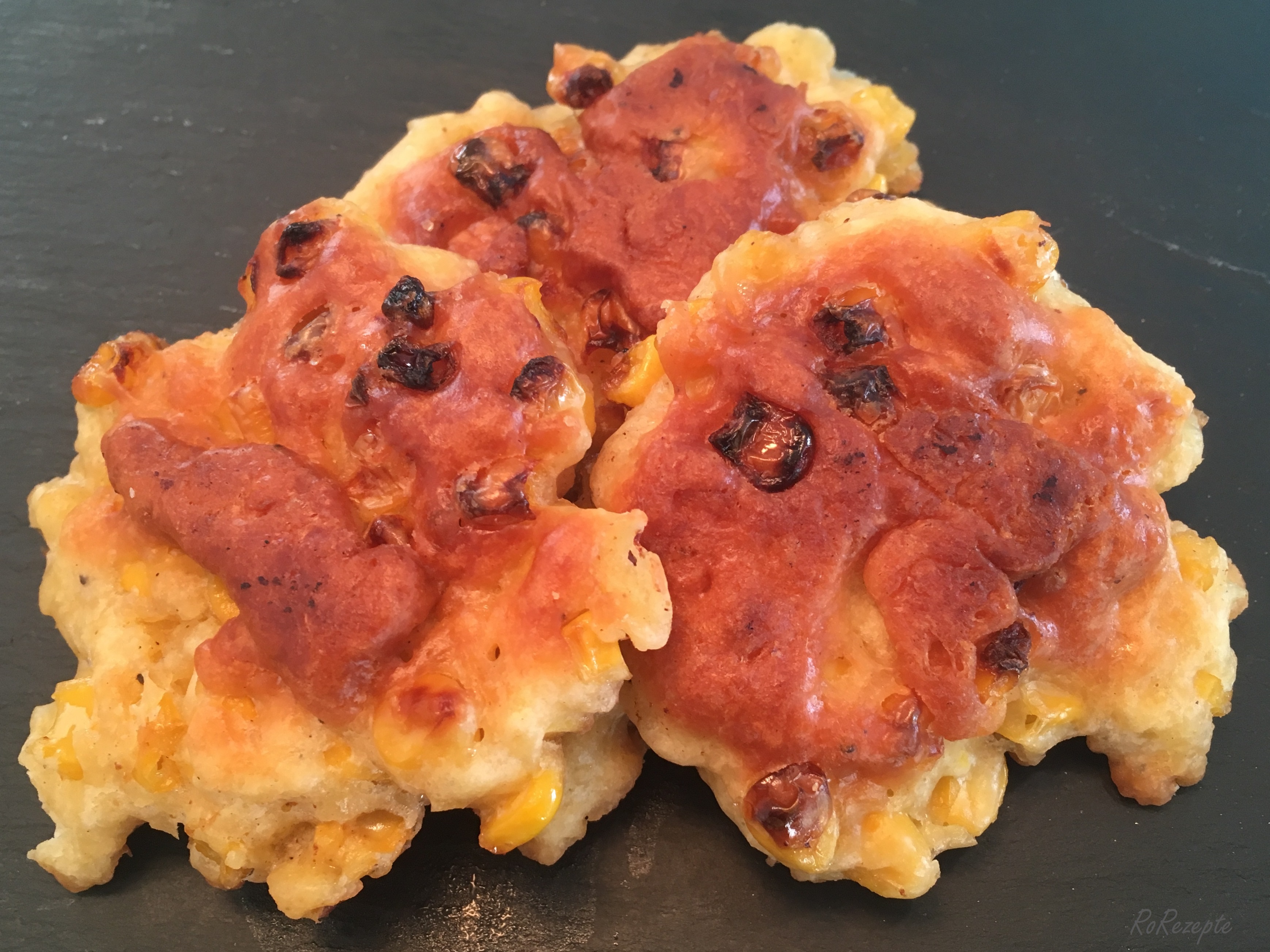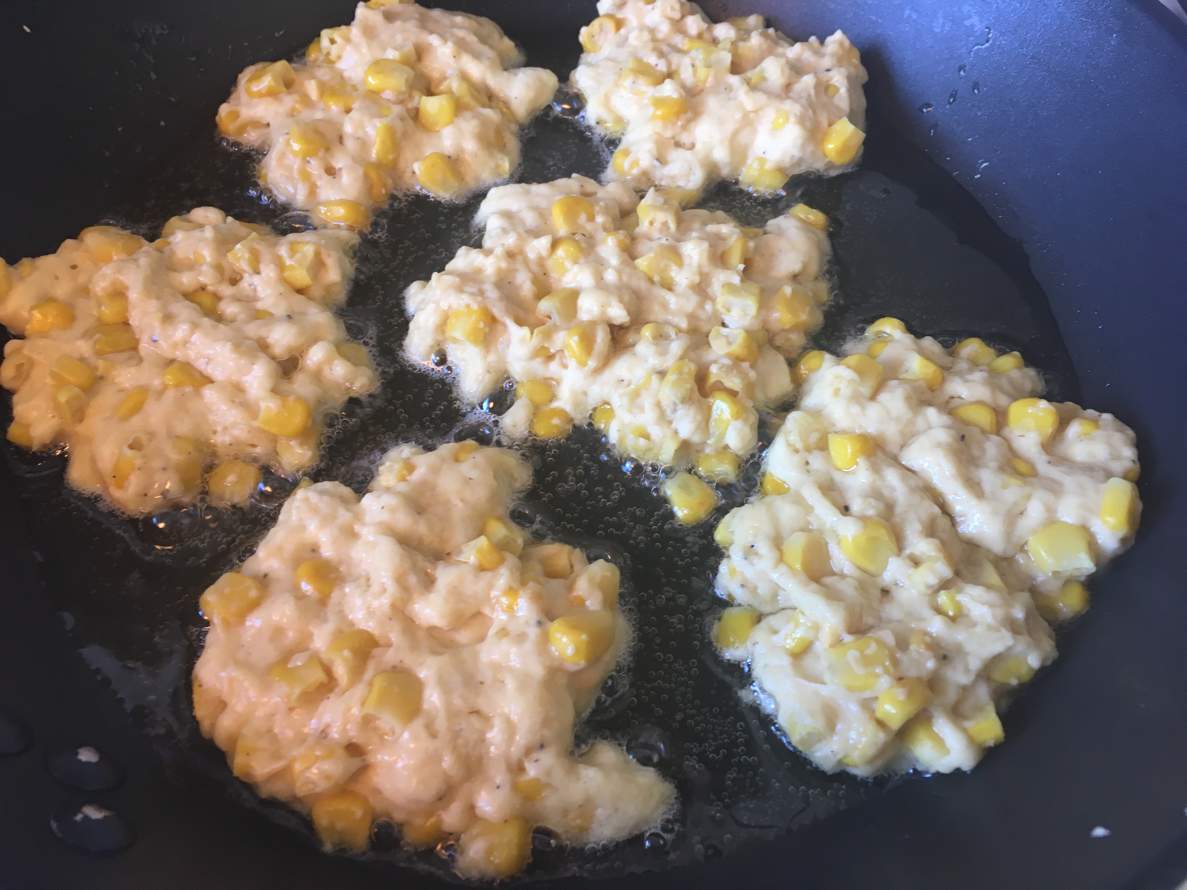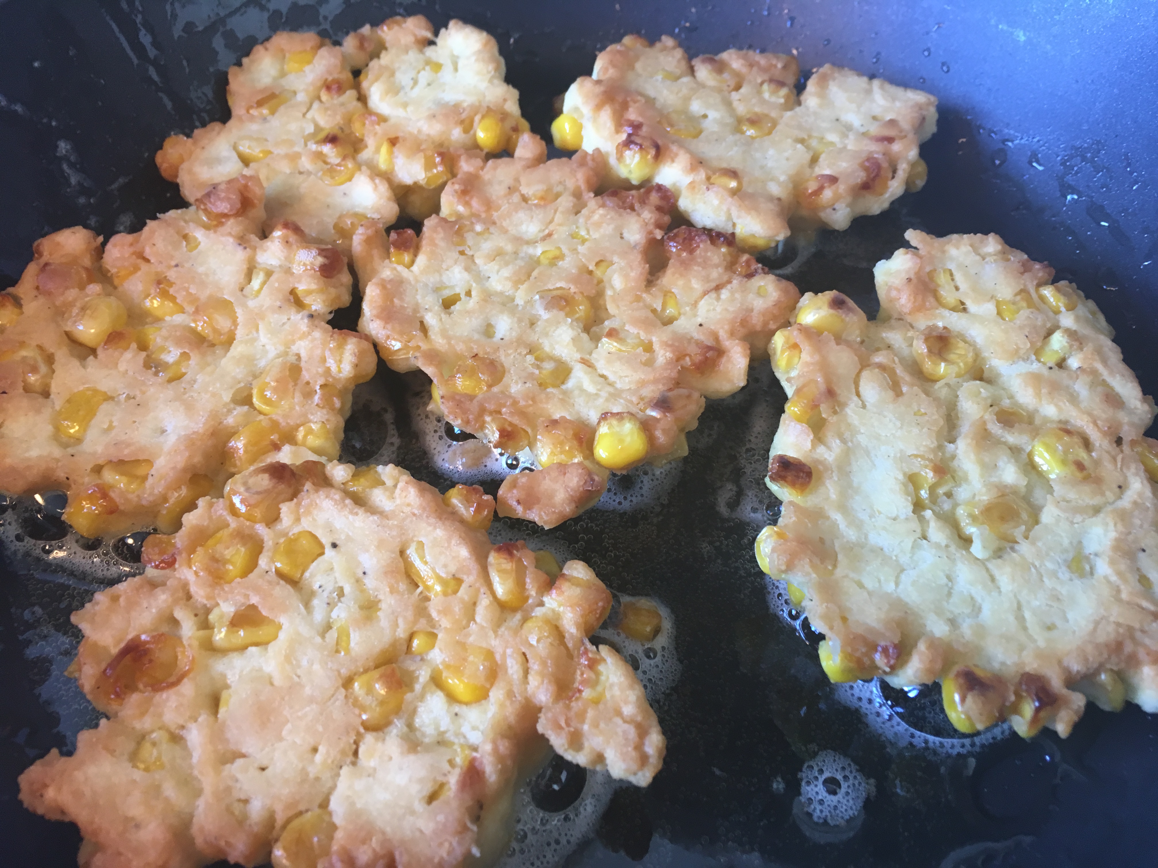 Teighäufchen in die Pfanne geben Wenden - Wenn ihr noch etwas Mais übrig habt, bratet ihn im restlichen Öl leicht an. Lecker!