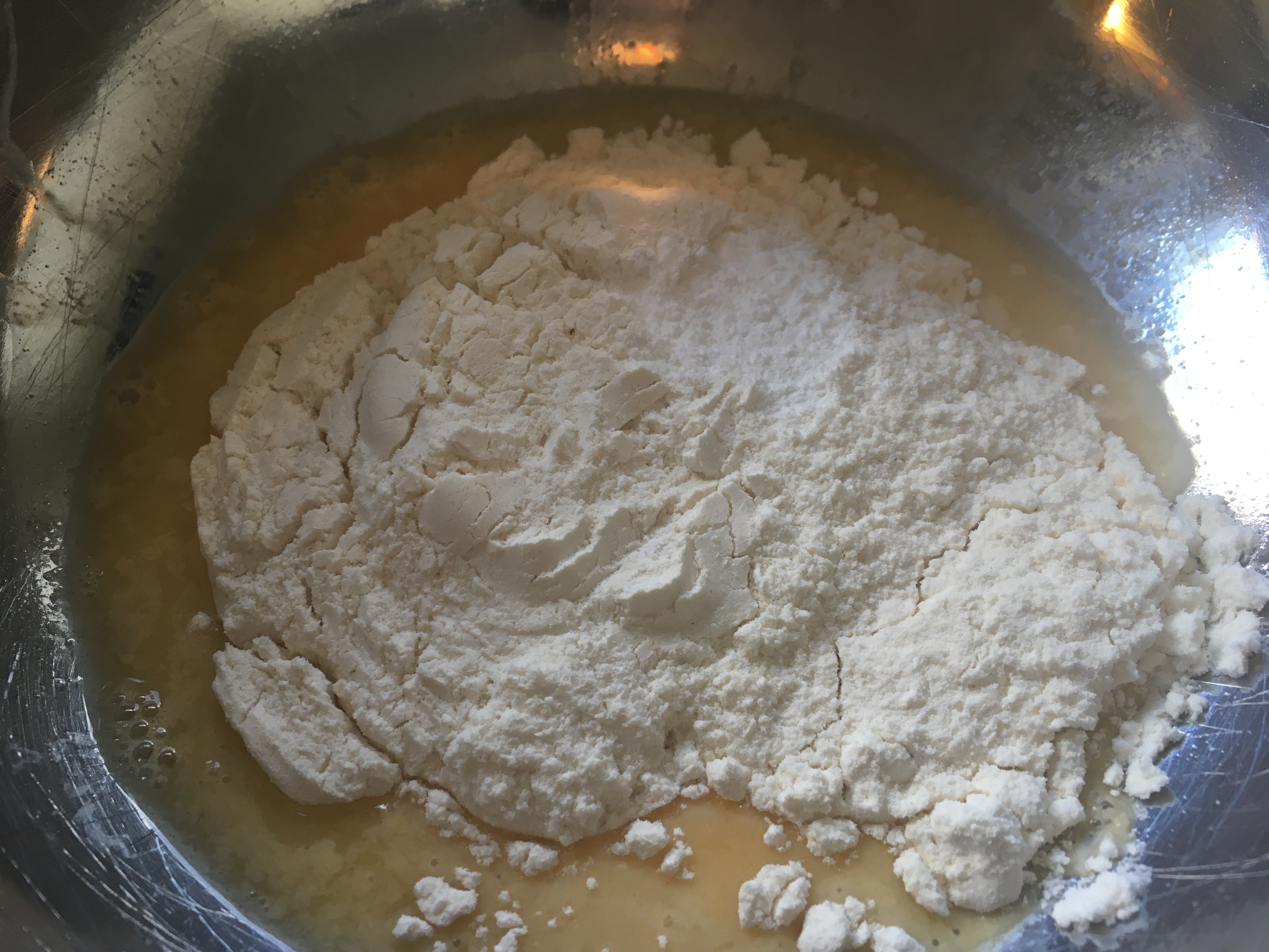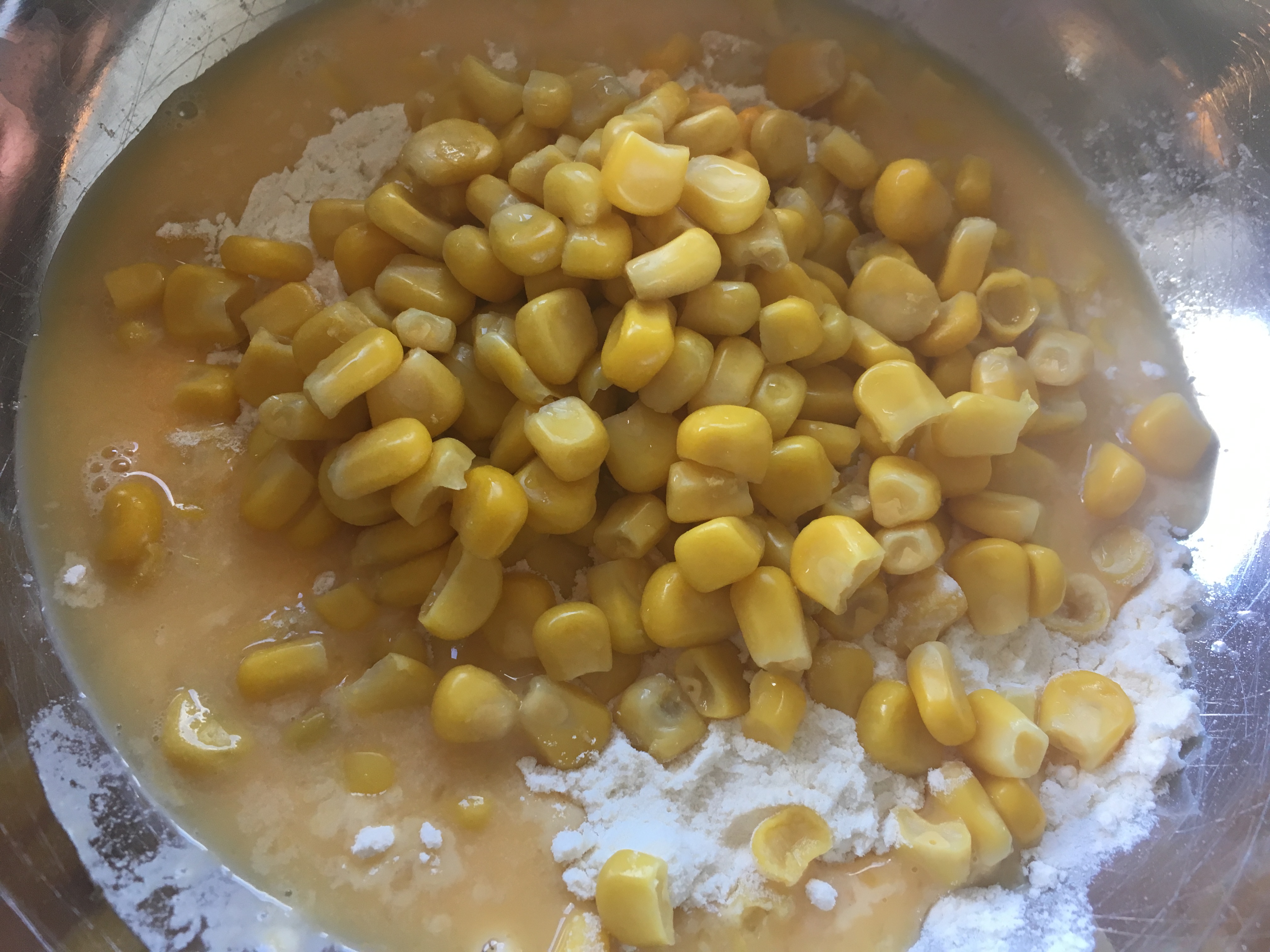 - Einen Esslöffel Wasser hinzufügen, dann eine Tasse Mehl, eine kleine Dose Mais (oder die Hälfte einer großen Dose, oder du verdoppelst die restlichen Zutaten und nimmst die ganze Dose) und einen TL Backpulver.