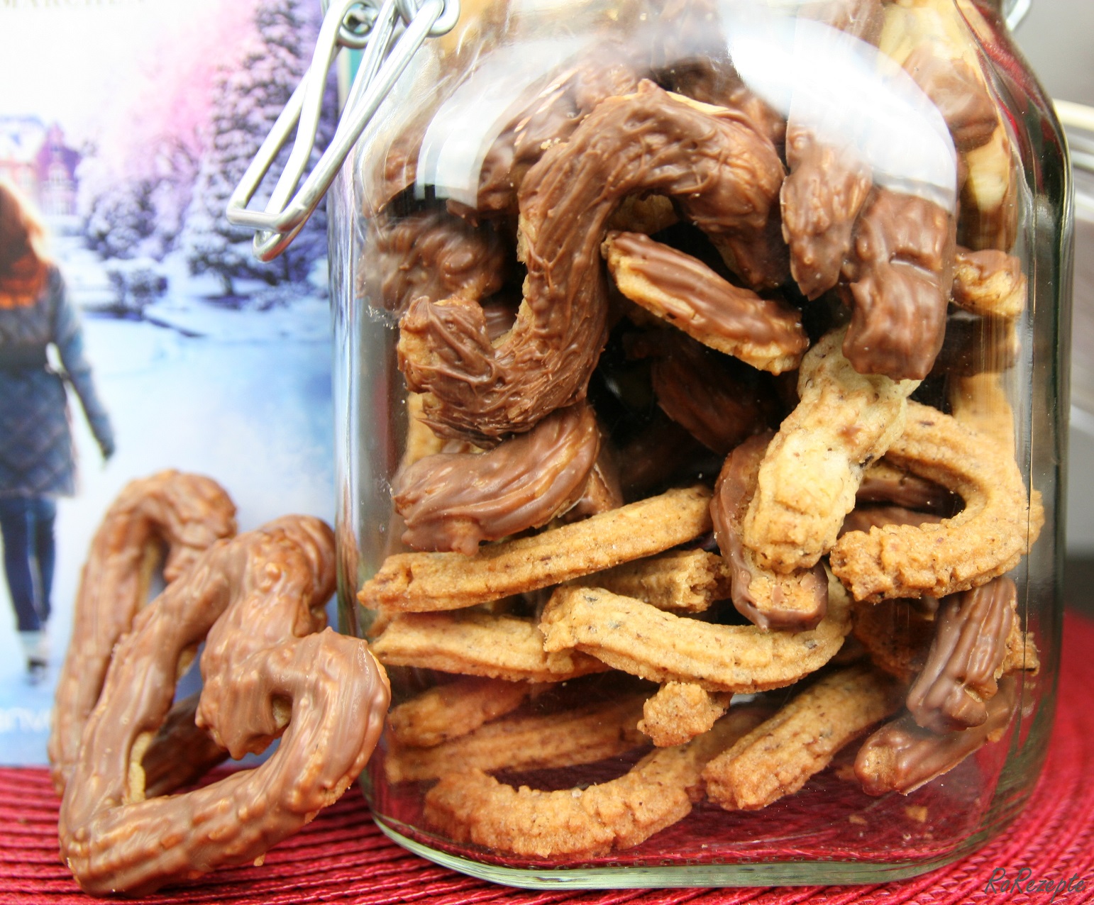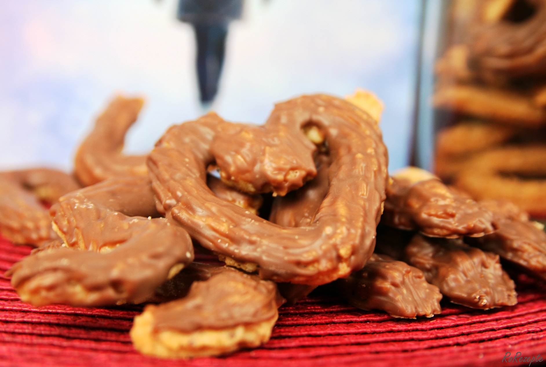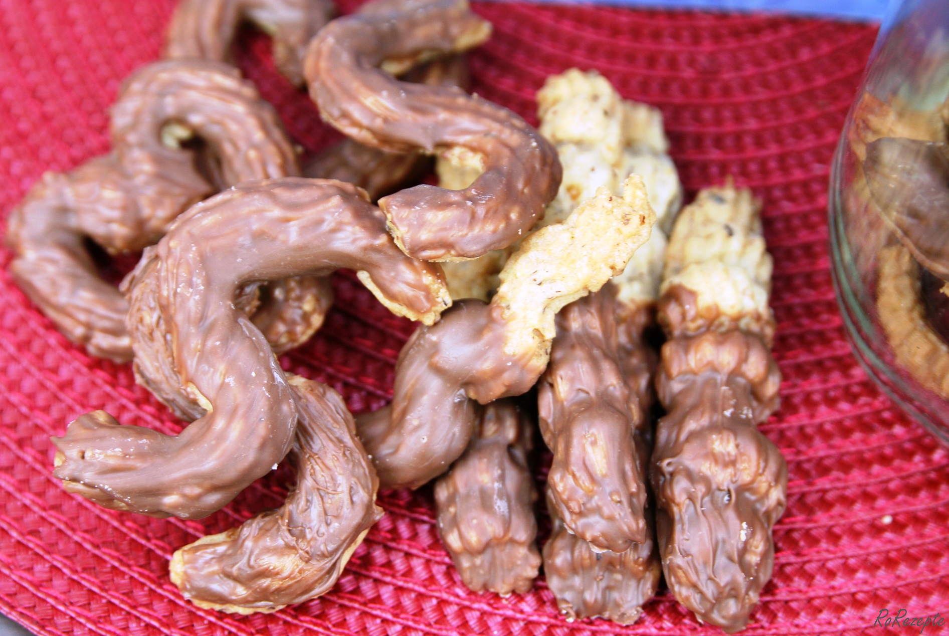 - und/oder Schokokuvertüre z.B. in Vollmilchkuvertüre tunken oder bestreichen, Streusel