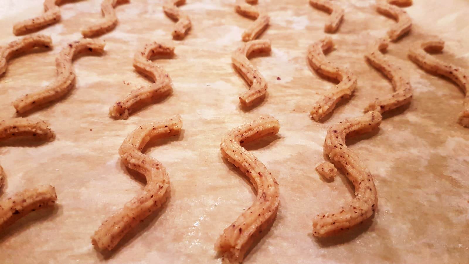 - Teig durch den Plätzcheneinsatz am Fleischwolf drehen – oder mit Spritztülle – und auf ein mit Backpapier ausgelegtes Backblech setzen. Am besten vorher nochmal weich kneten, denn hier brauchten wir ganz schön viel Kraft zum Spritzen. Leider hatte ich auch nicht die optimalste Tülle parat. Backzeit ca. 12 Minuten bei ca. 175 Grad.