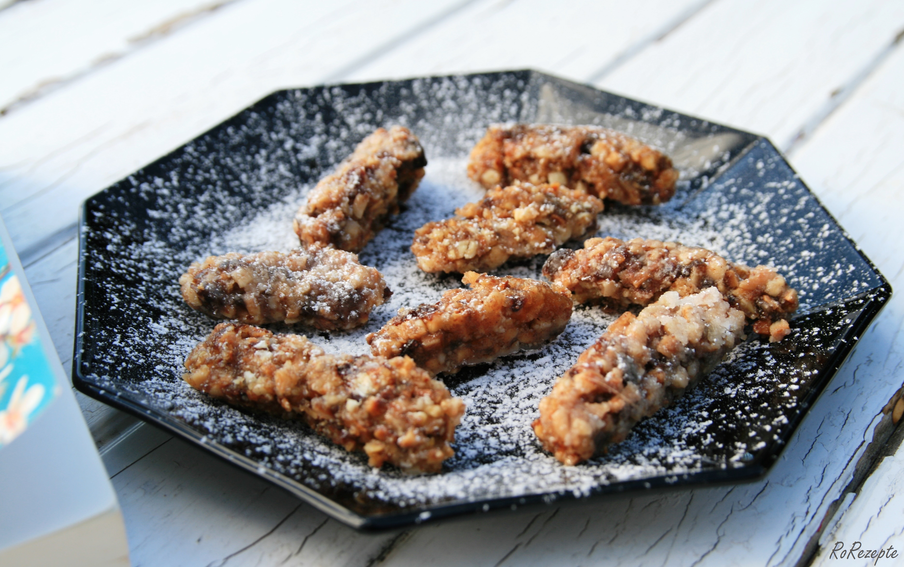 Honig erhitzen gemahlene Mandeln, Anis, Zimt und Zitronenschale Rosinen zugeben zum Honig zugeben geröstete Mandeln zugeben vermengen - Dann mit einem Teelöffel kleine Portionen abstechen, zu Röllchen formen und in Puderzucker wenden.